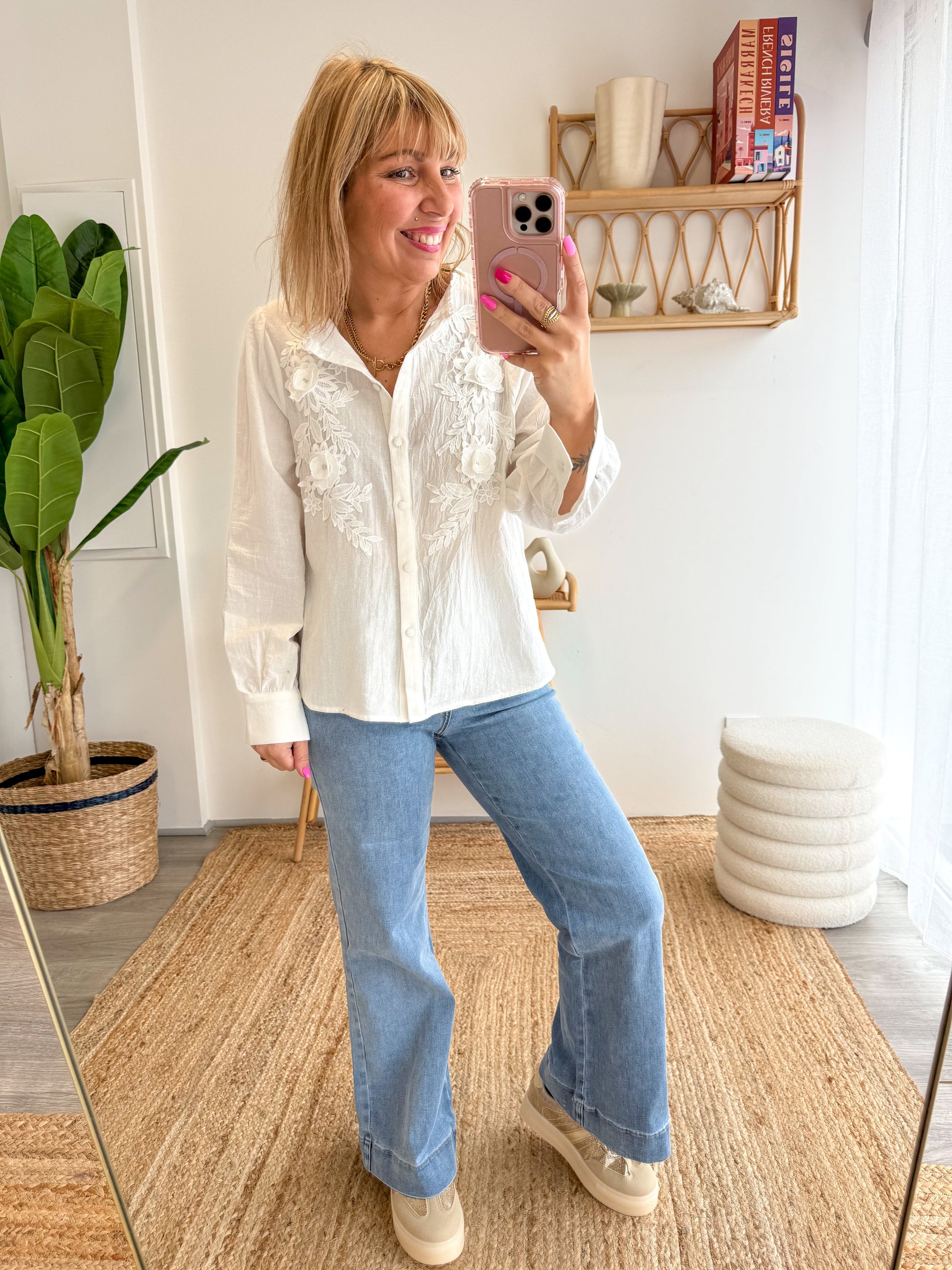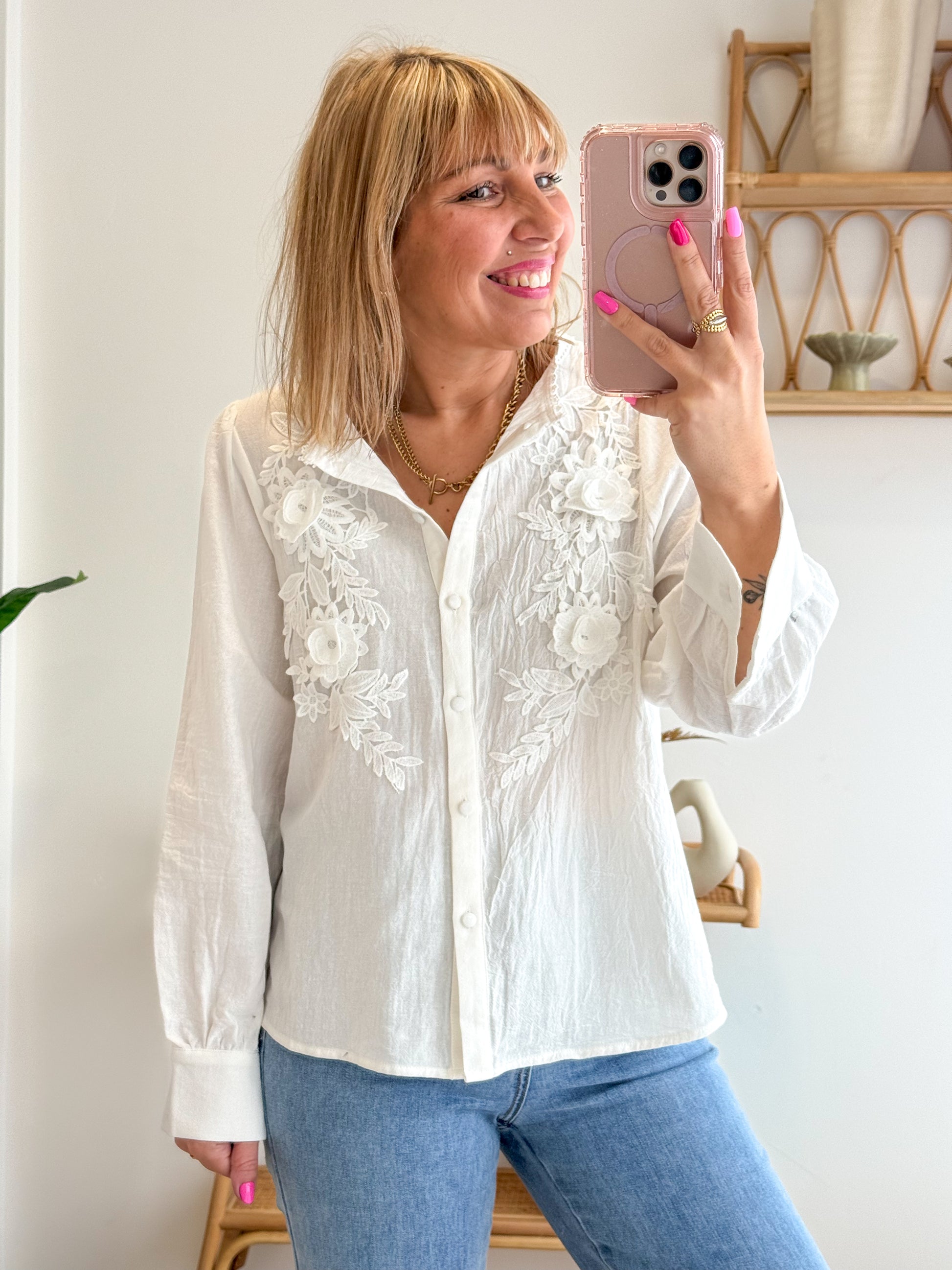 Délicate et intemporelle, la chemise Rosy séduit par ses magnifiques détails en broderie florale qui subliment le buste avec élégance. Sa matière légère et légèrement texturée offre un tombé fluide, parfait pour une silhouette féminine et raffinée.
