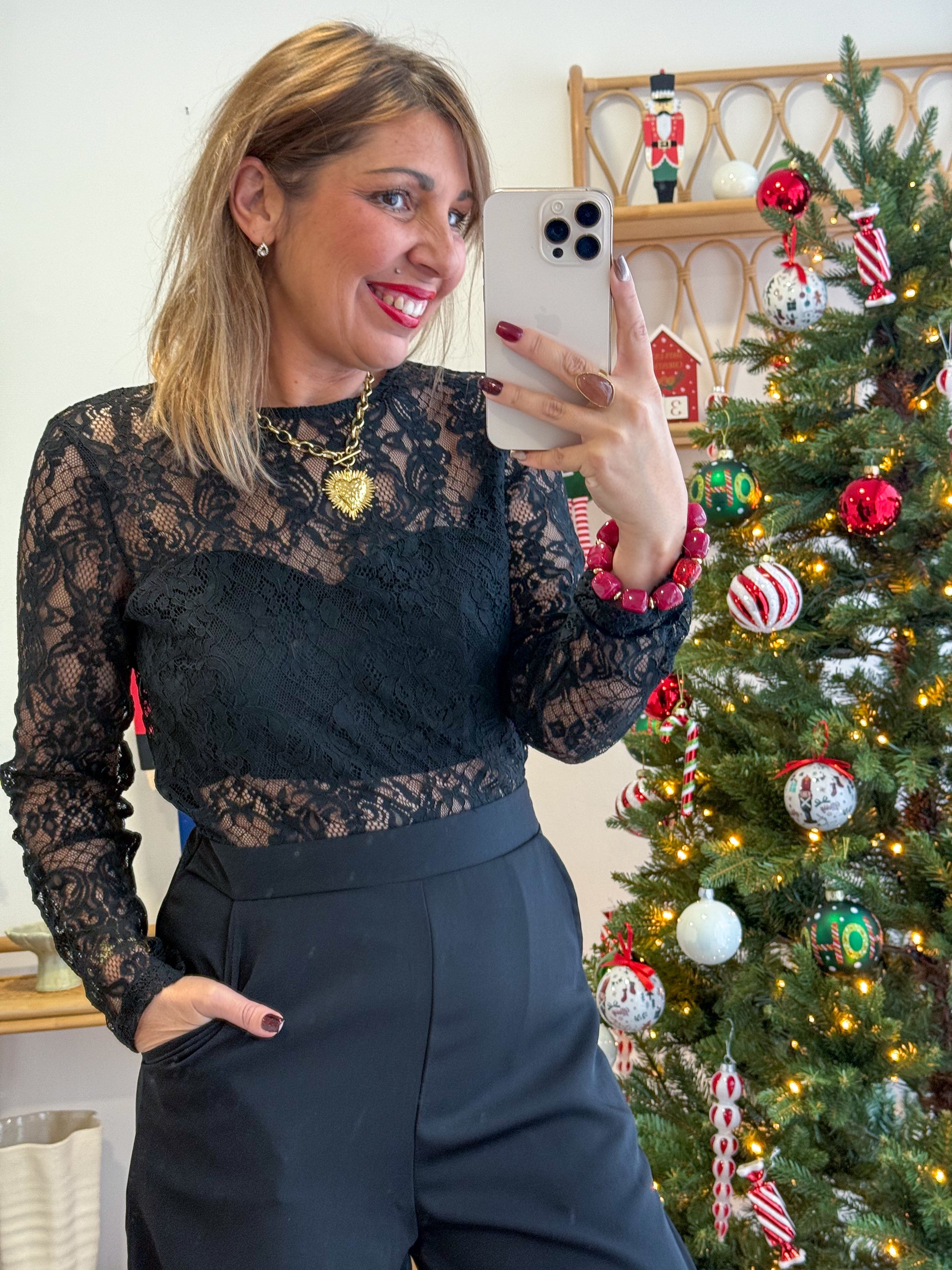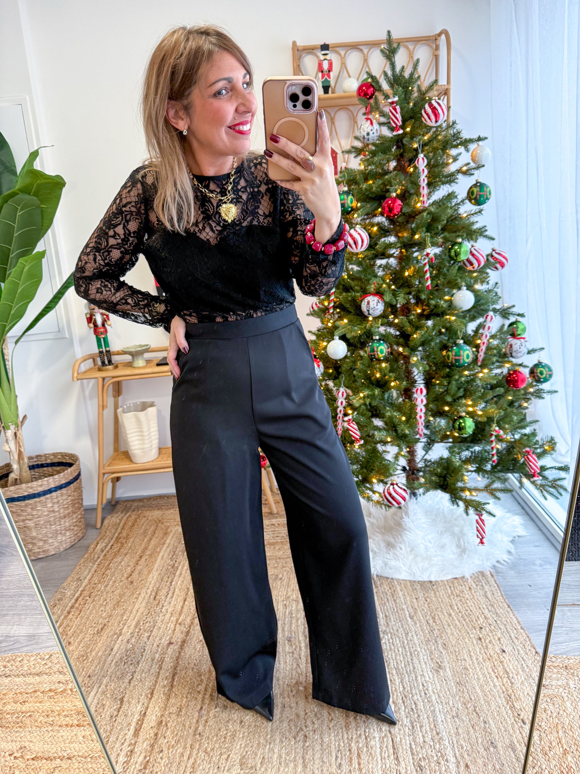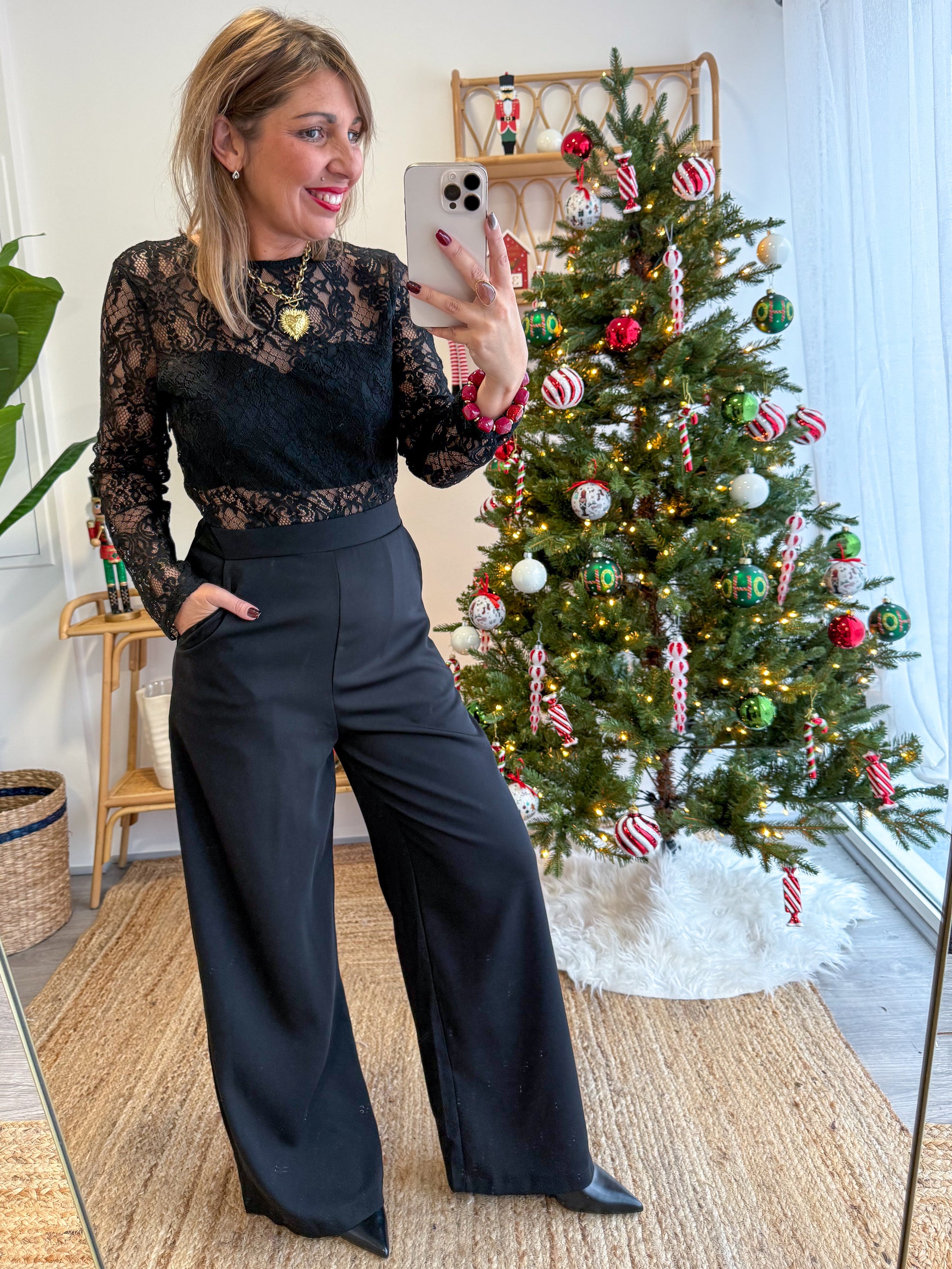 Le bas, quant à lui, adopte une coupe wide leg fluide, qui allonge naturellement la silhouette et apporte une allure sophistiquée. Un modèle qui se suffit à lui-même : un vrai bijou dans la garde-robe.