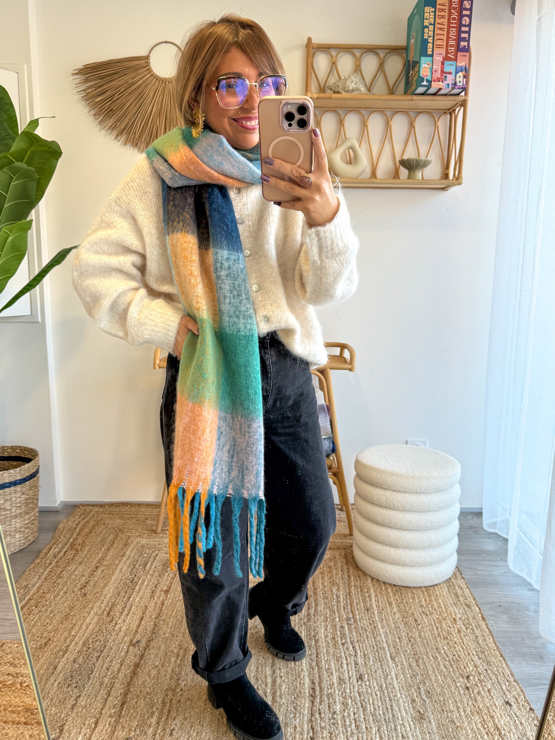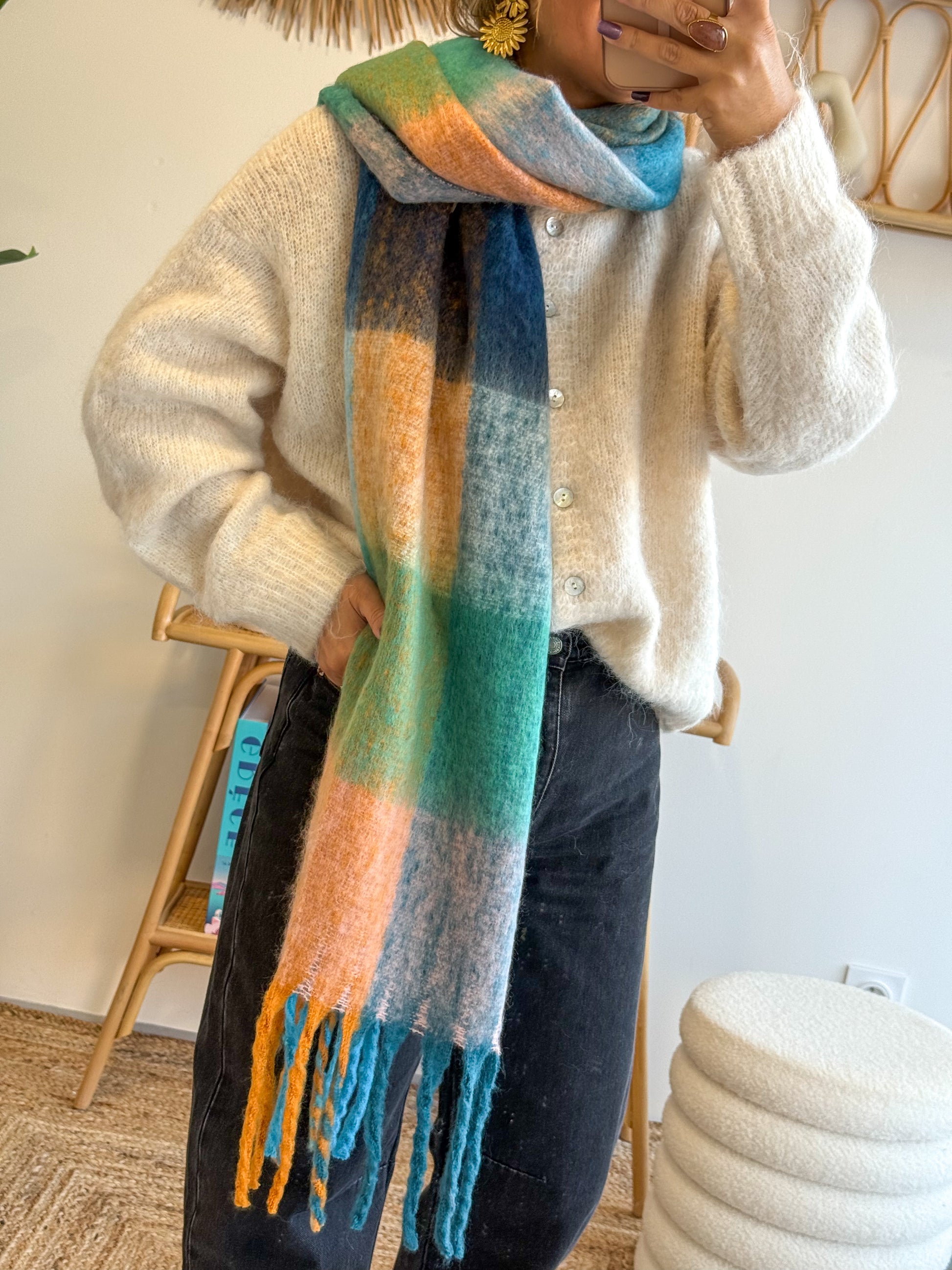 Portée enroulée autour du cou ou laissée longue, elle offre un joli volume tout en restant légère.