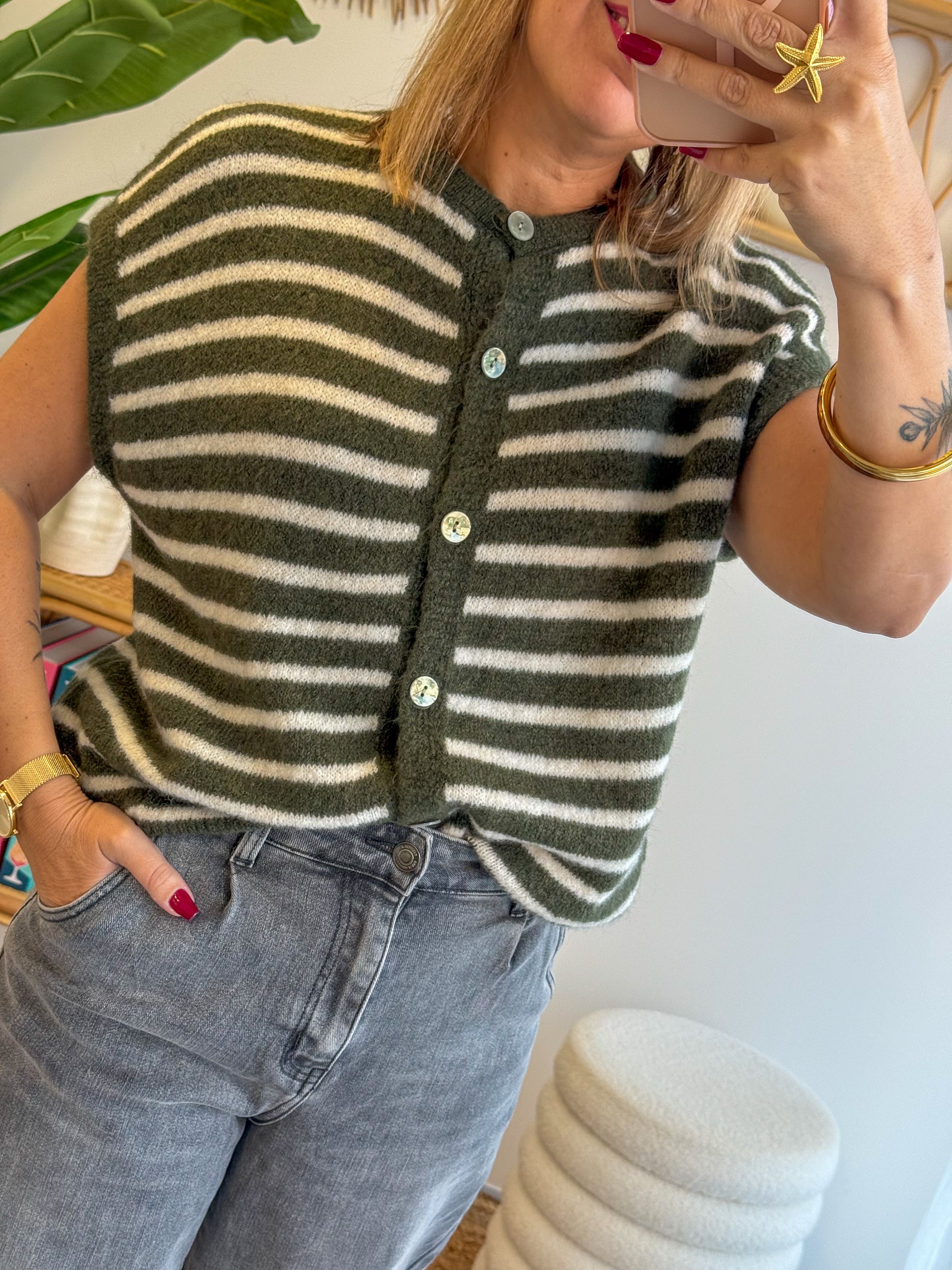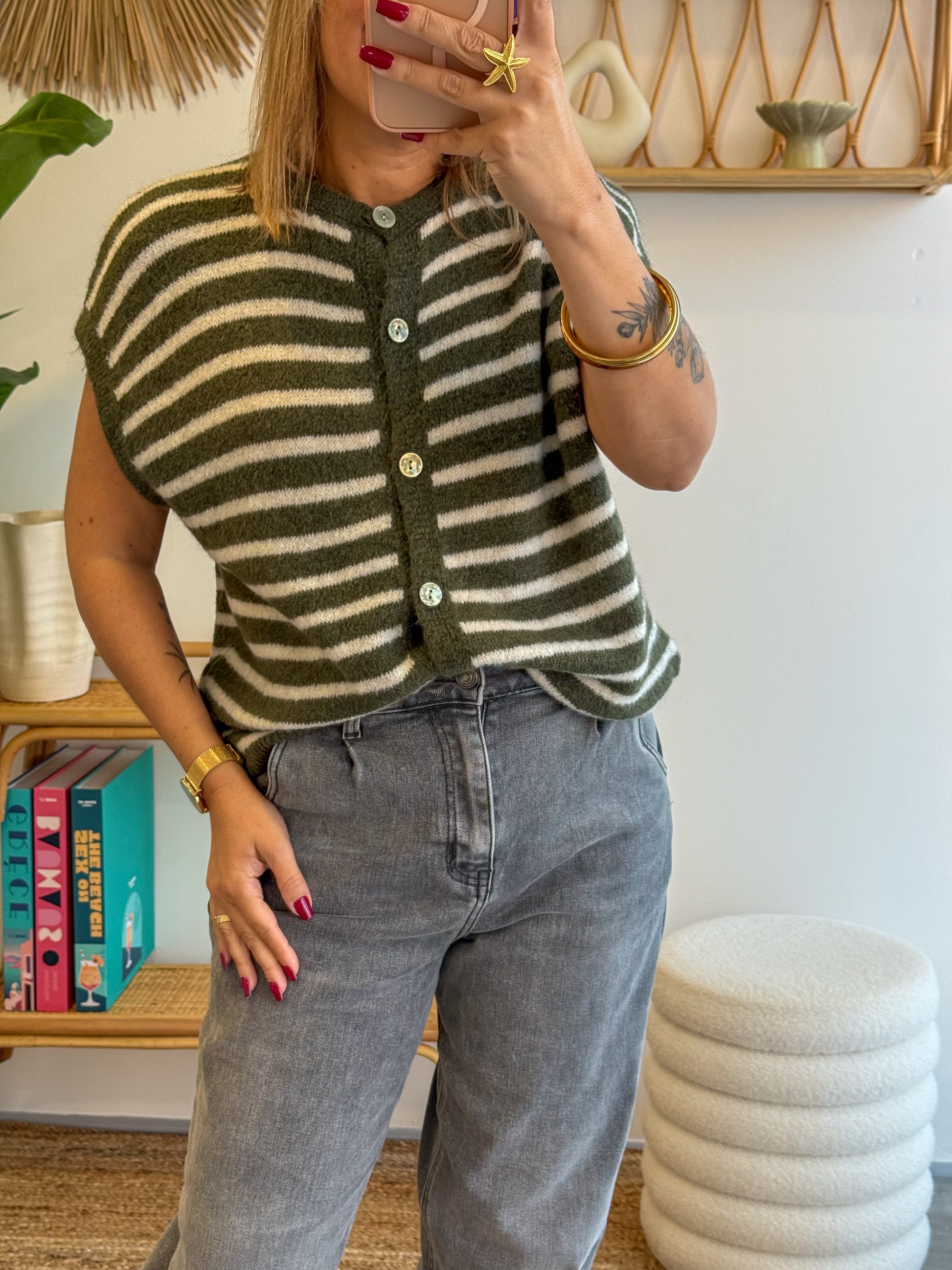 - Gilet sans manches à rayures kaki & écru