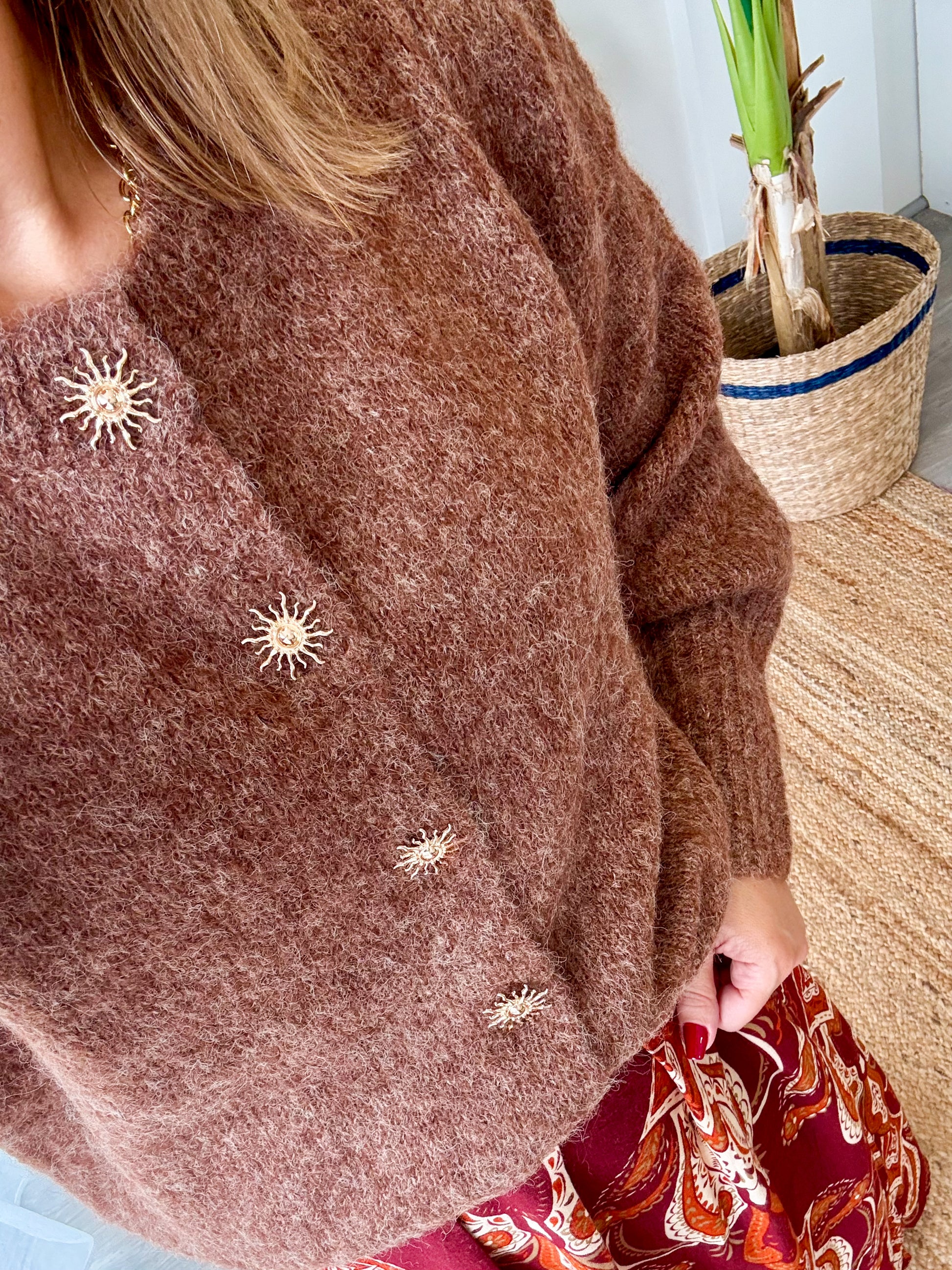 Douceur et originalité se rencontrent avec le gilet SOLEA. Conçu dans une maille moelleuse et chaude, il se distingue par sa couleur camel et ses boutons bijoux dorés en forme de soleil qui apportent une touche chic et lumineuse.