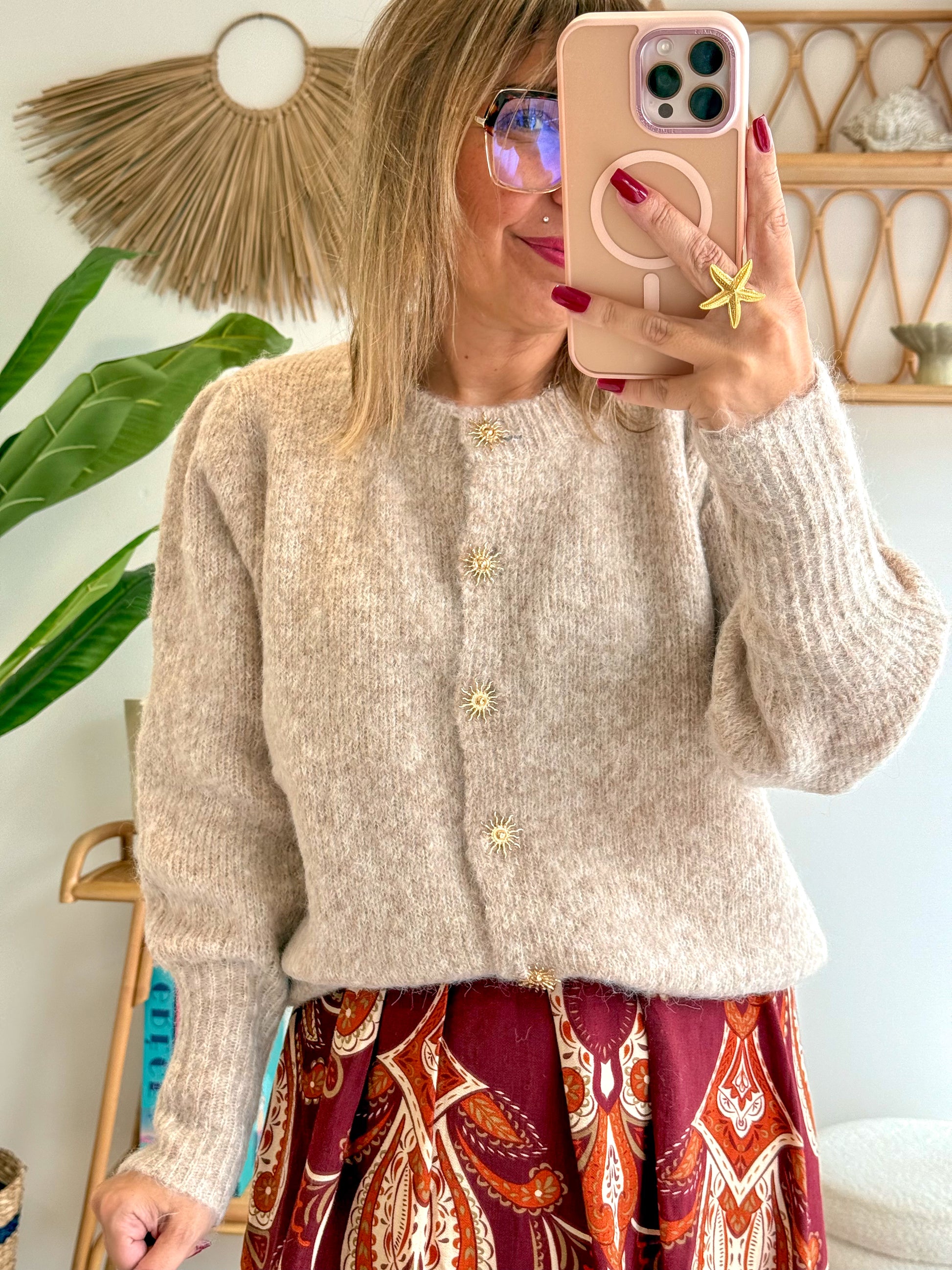 Douceur et originalité se rencontrent avec le gilet SOLEA. Conçu dans une maille moelleuse et chaude, il se distingue par sa couleur taupe et ses boutons bijoux dorés en forme de soleil qui apportent une touche chic et lumineuse.