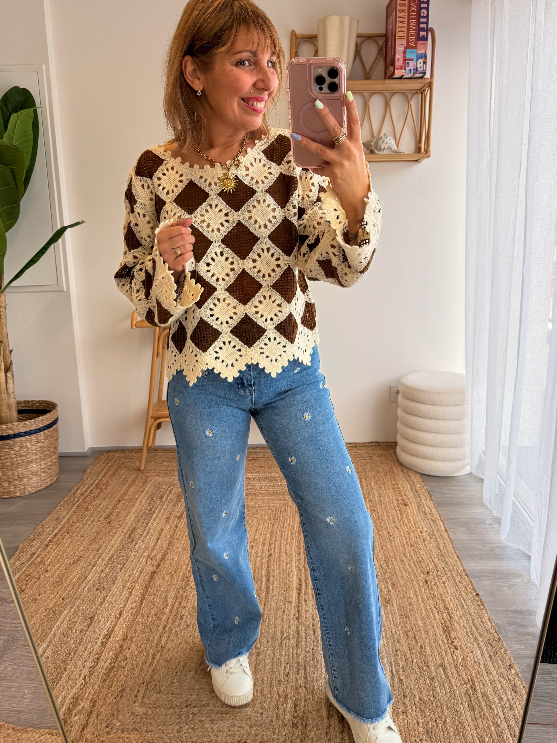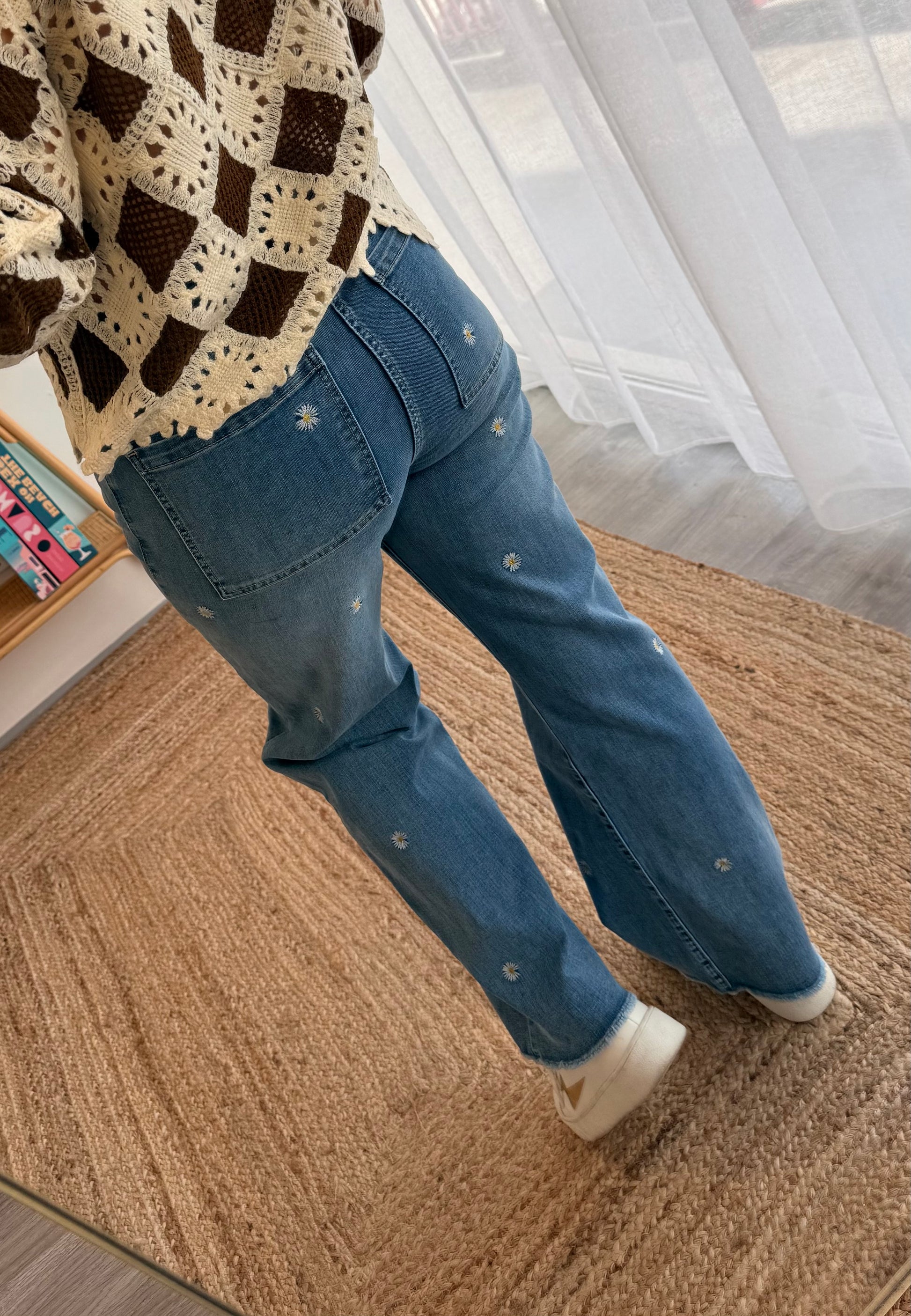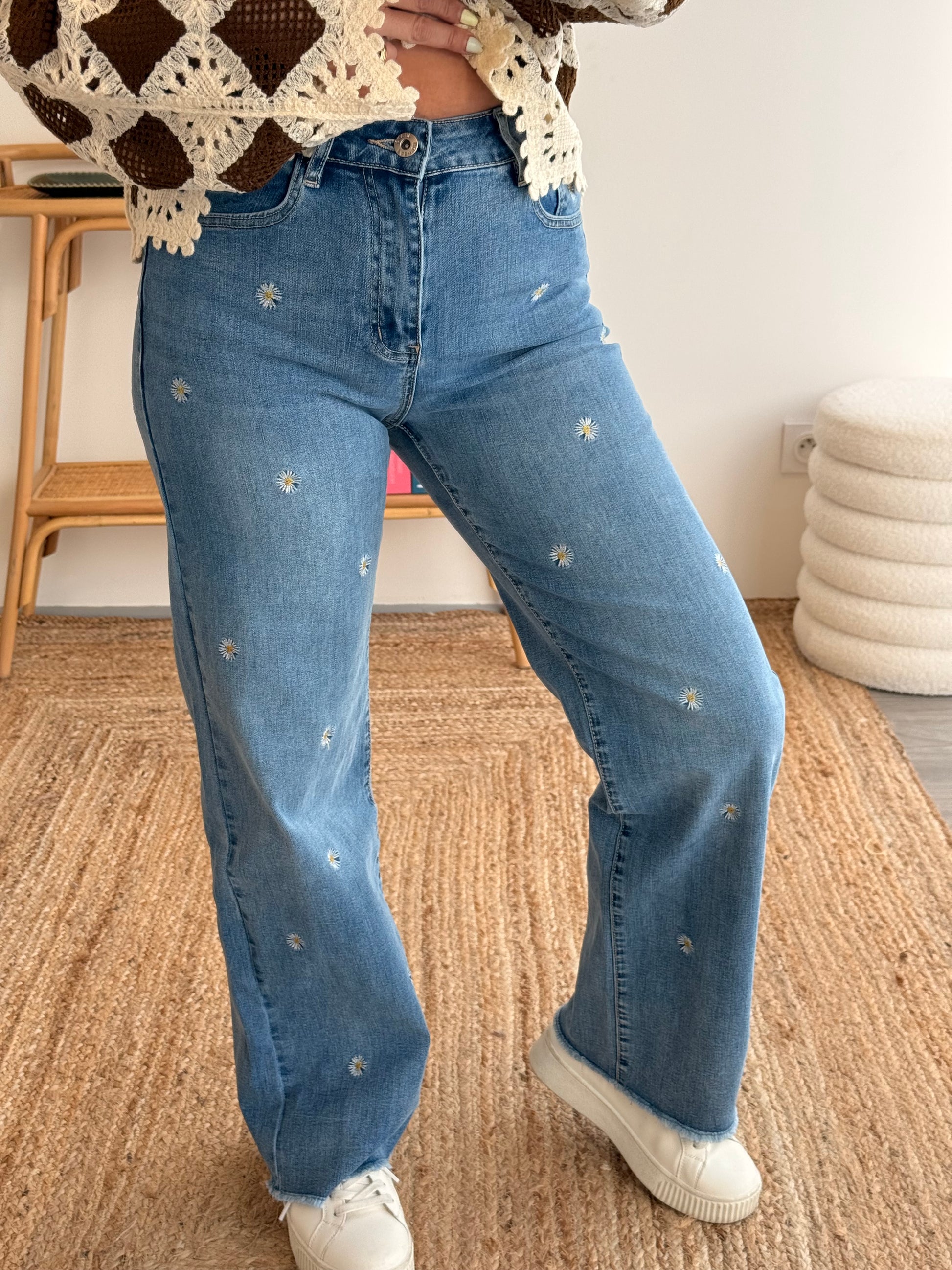 - Broderies marguerites sur l’ensemble du jean