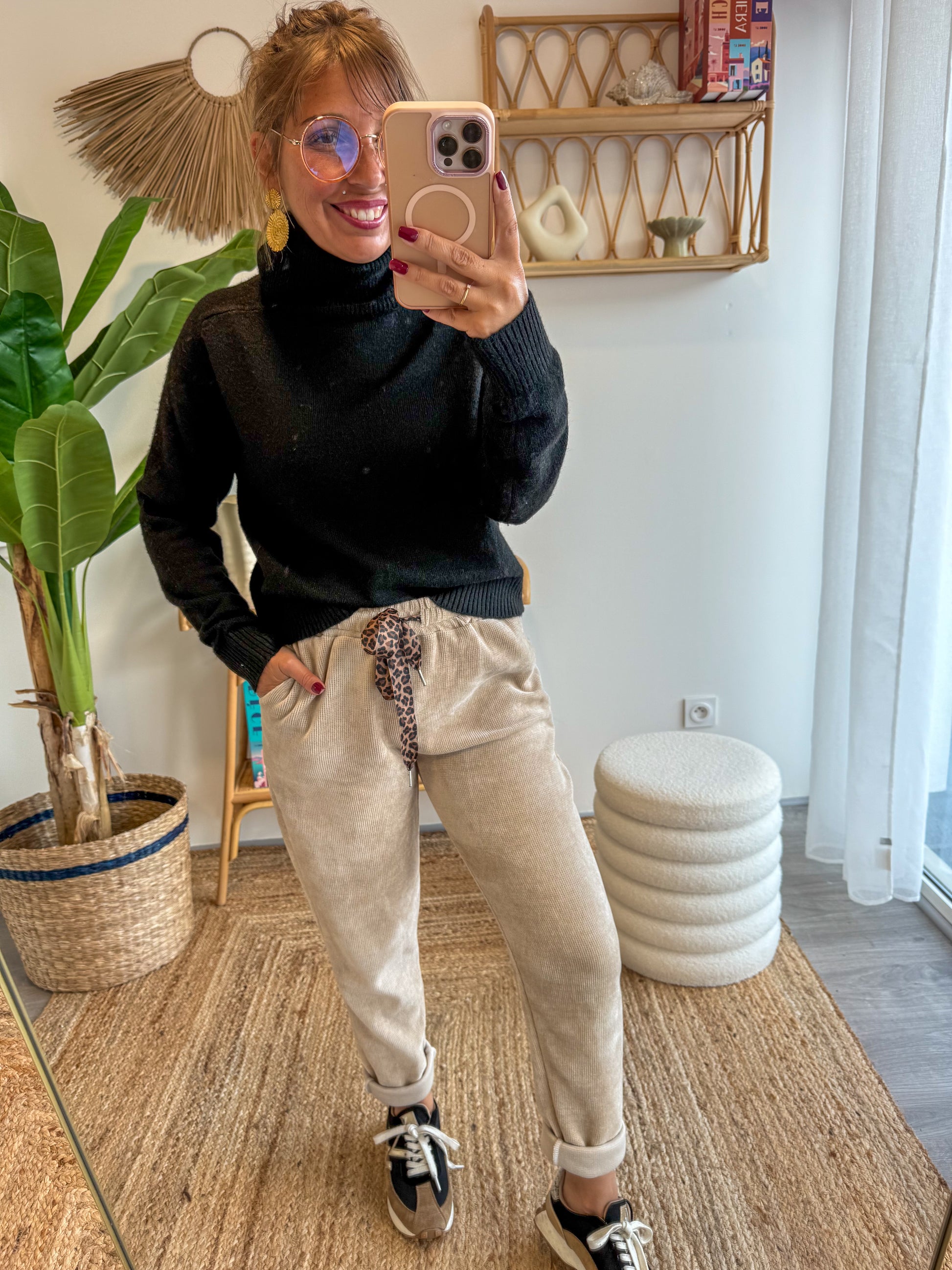 On adore sa matière velours côtelé ultra douce, sa taille élastiquée hyper confortable et son lien imprimé léopard qui apporte une touche originale et tendance.