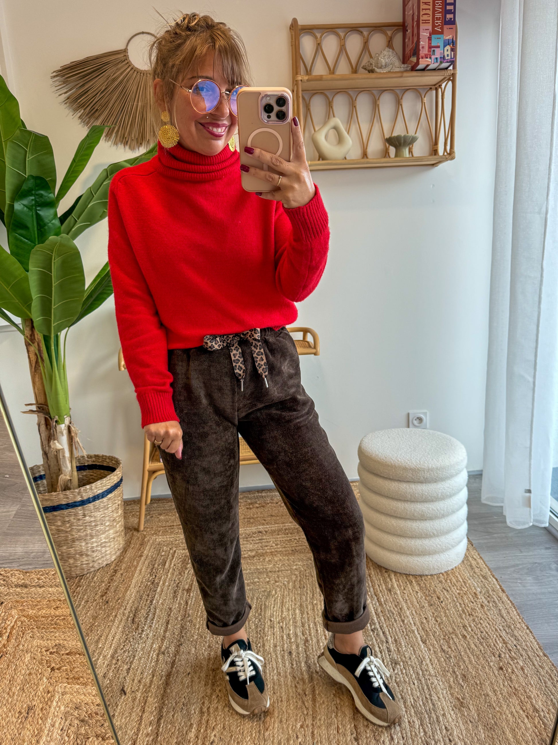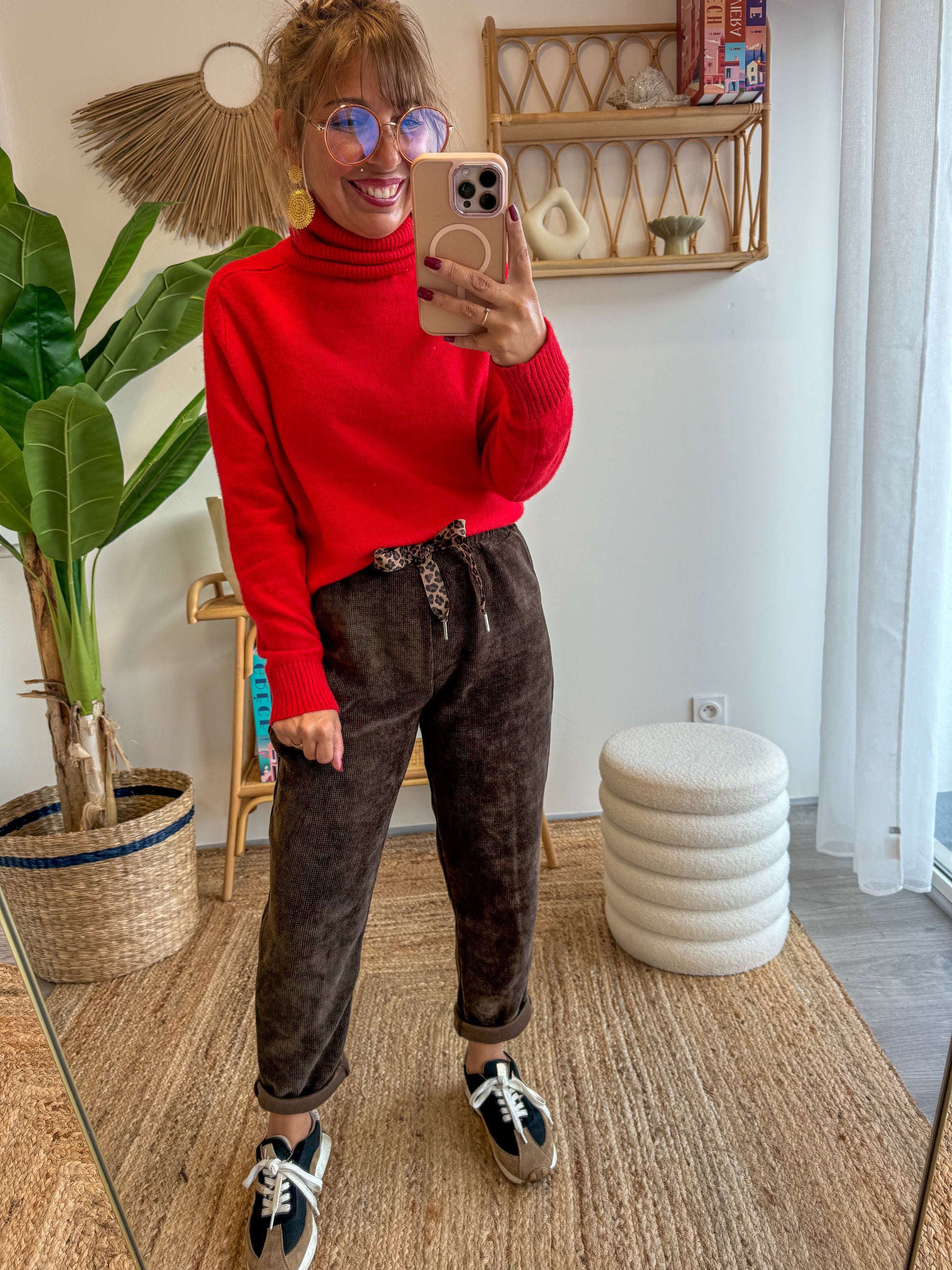 On adore sa matière velours côtelé ultra douce, sa taille élastiquée hyper confortable et son lien imprimé léopard qui apporte une touche originale et tendance.