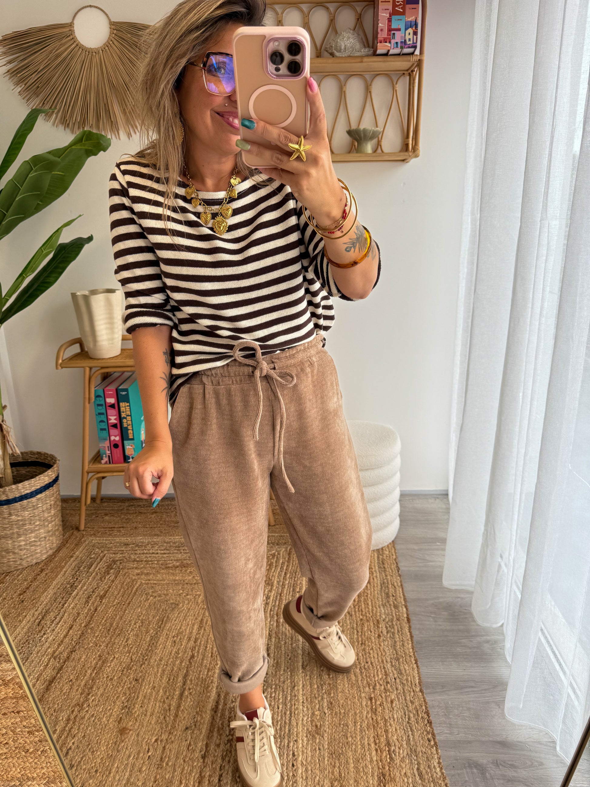 Confort et style se rencontrent avec le Jogging Selma. En velours côtelé taupe , il apporte une touche rétro tendance tout en restant ultra agréable à porter. Sa taille élastique avec cordon de serrage et sa coupe décontractée en font un allié parfait pour vos journées casual ou vos looks streetwear.
