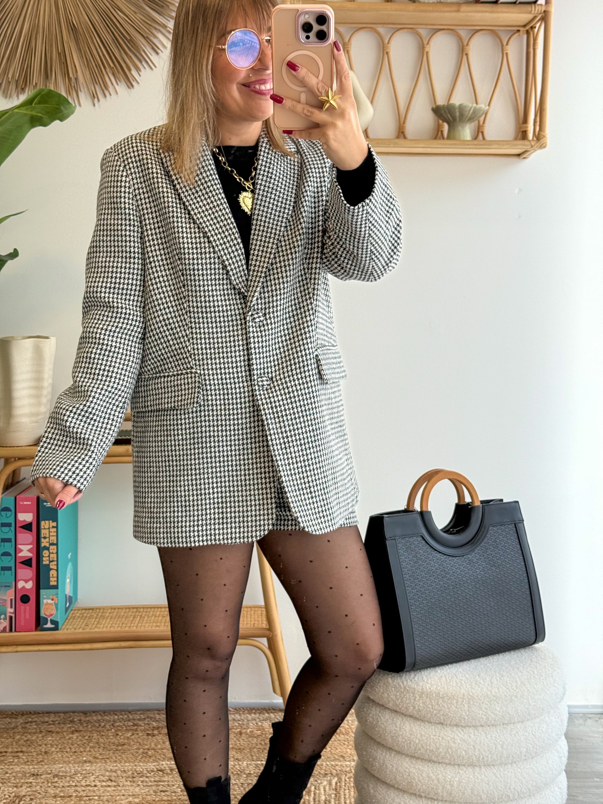 Élégant et intemporel, le Blazer Ysée revisite le classique motif pied-de-poule 🖤🤍. Avec sa coupe droite légèrement oversize, il s’adapte à toutes les morphologies et apporte instantanément une touche chic à vos tenues. Fermé ou porté ouvert, il se mixe aussi bien avec un jean casual qu’avec le short assorti pour un total look tendance.