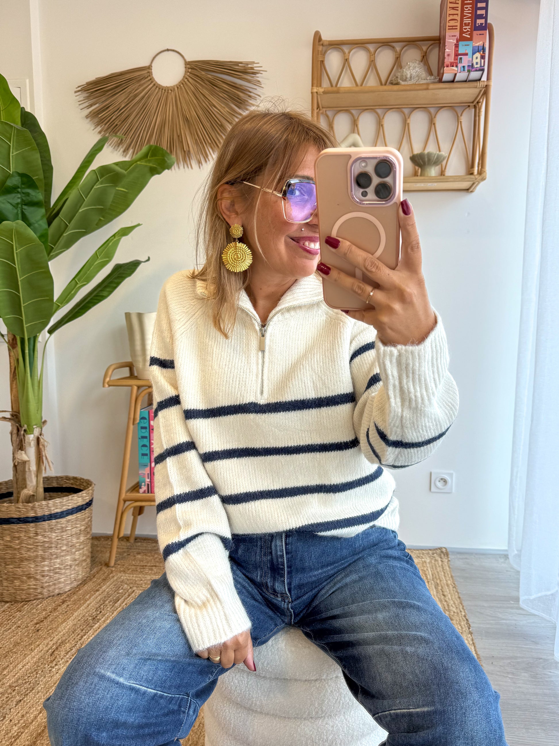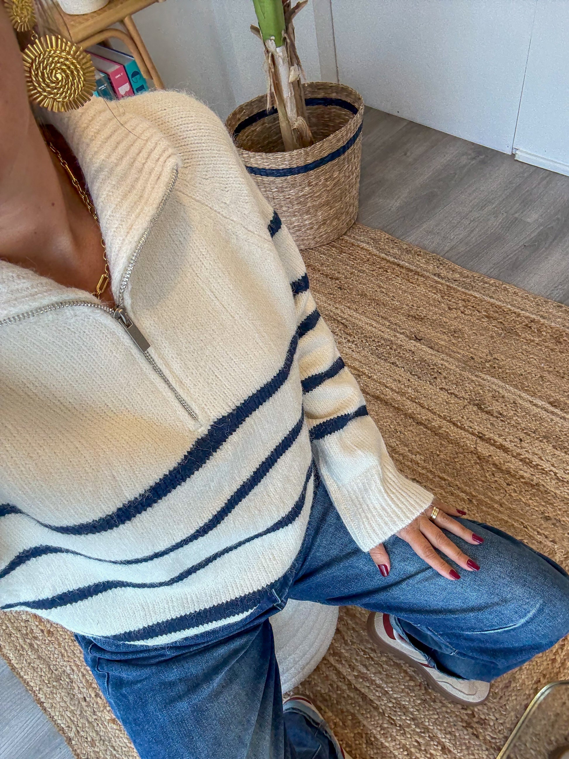 Le pull parfait pour une allure chic et décontractée ! On craque pour sa maille douce et son col zippé qui apporte une touche moderne à la classique marinière. Avec son coloris écru rehaussé de fines rayures marine, il se porte aussi bien avec un jean qu’une jupe pour un look effortless et féminin.