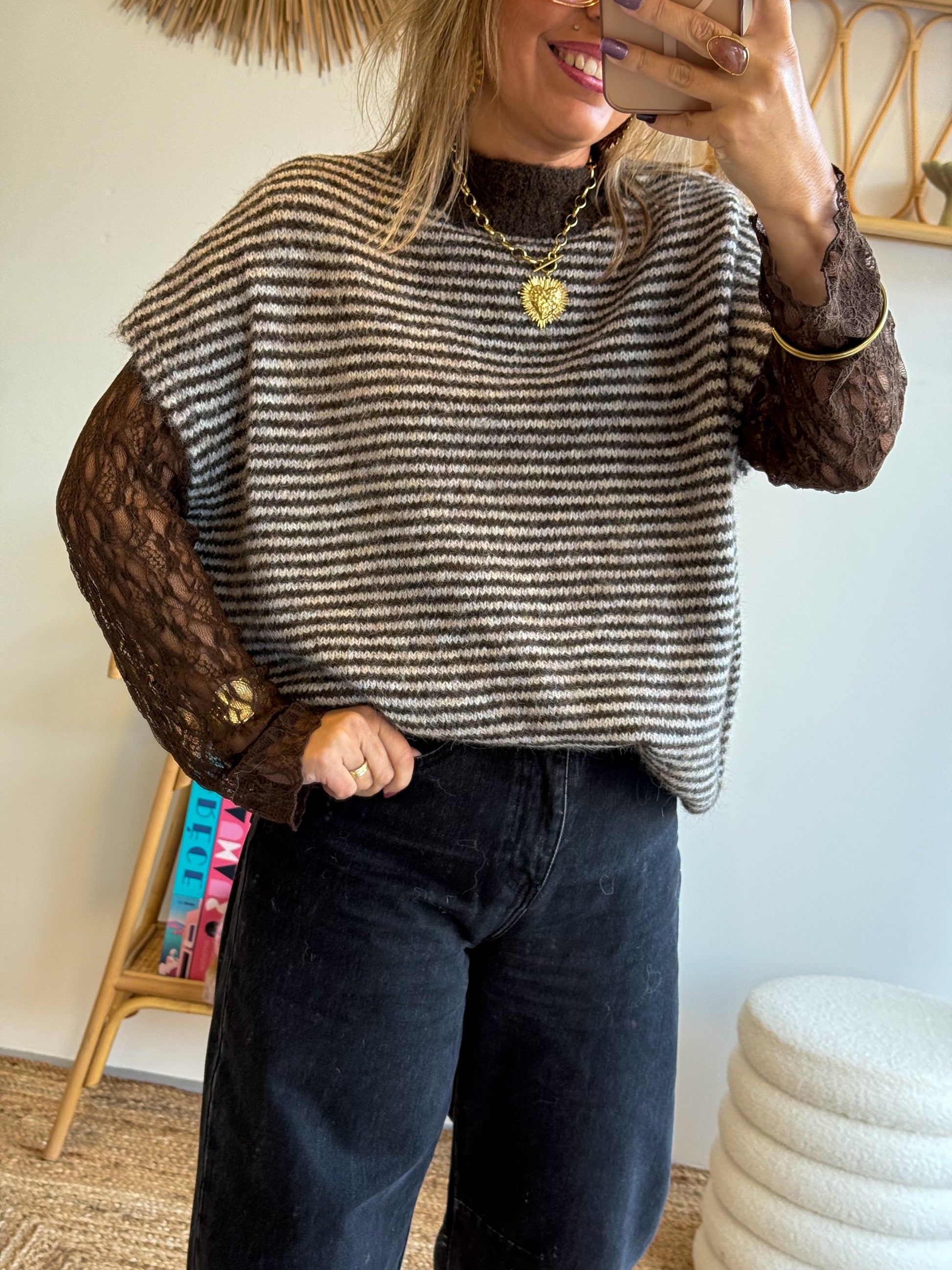 On craque pour sa maille rayée ultra douce, sublimée par de magnifiques manches en dentelle intégrée, pour un effet superposé sans effort ✨