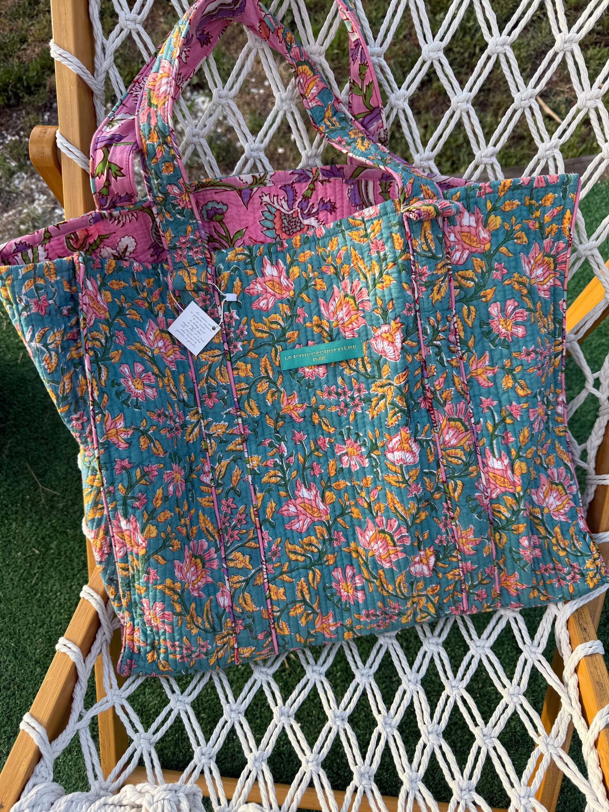 Le sac Bombay est un véritable coup de cœur pour les amoureuses de motifs floraux et de couleurs vibrantes. Ce cabas matelassé signé La P’tite Cachottière Paris est réversible, offrant deux styles tout aussi irrésistibles :