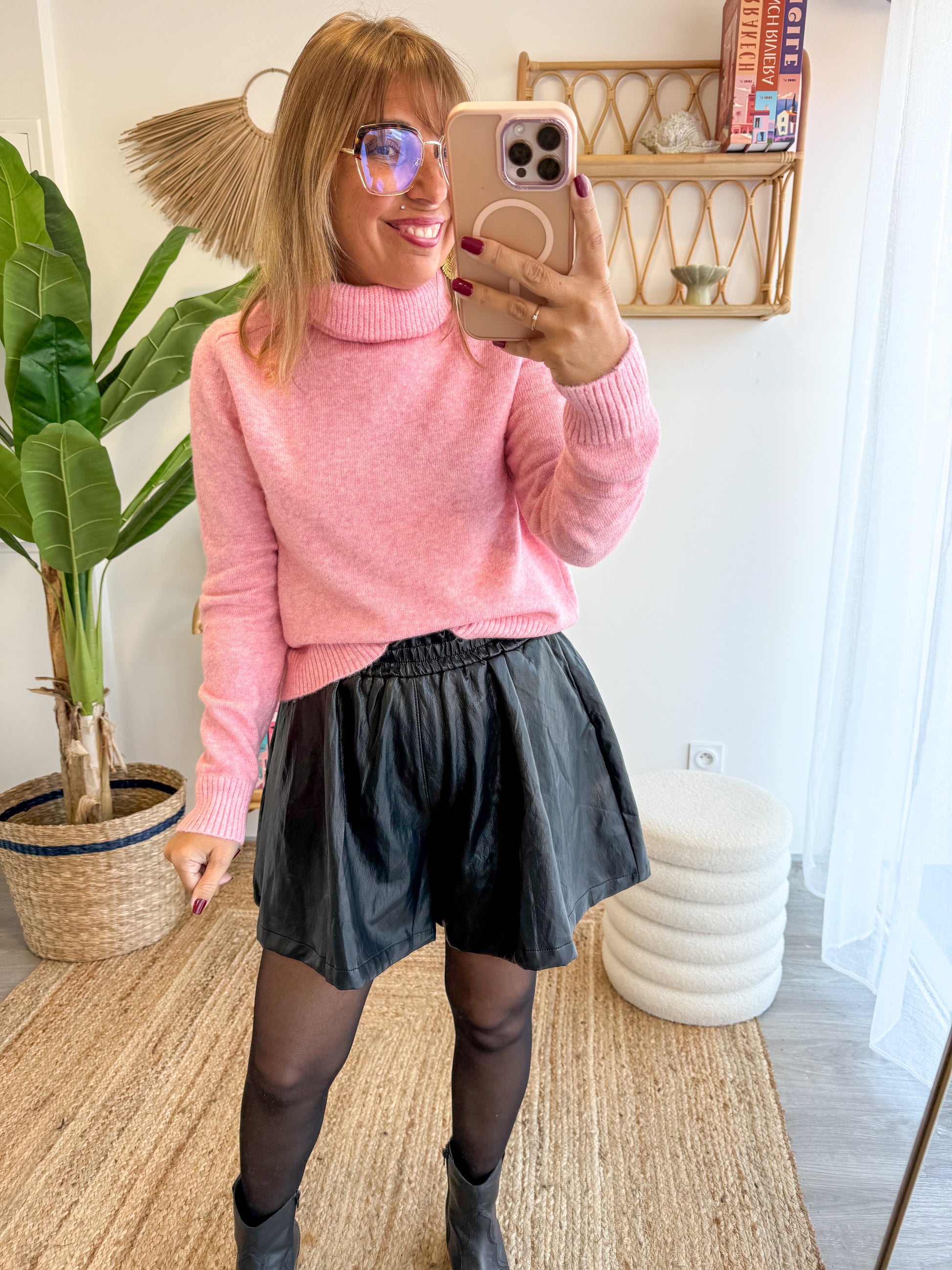 Sa matière effet cuir apporte une touche rock chic, tandis que sa coupe fluide et sa taille élastiquée garantissent un confort absolu.