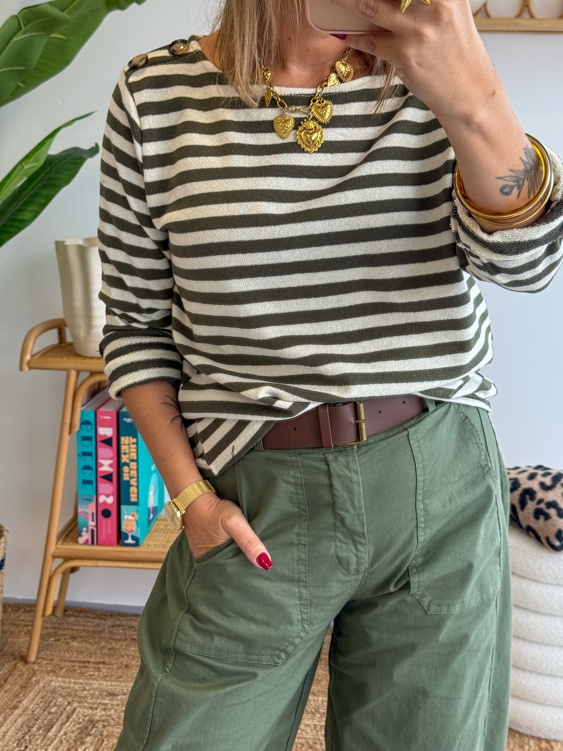 Un intemporel revisité : le T-shirt PORTO arbore un style marin avec ses rayures kaki et écru. Confortable et élégant, il se distingue par ses boutons dorés sur l’épaule qui apportent une touche chic et originale. Sa coupe fluide et ses manches retroussables en font une pièce facile à porter au quotidien.