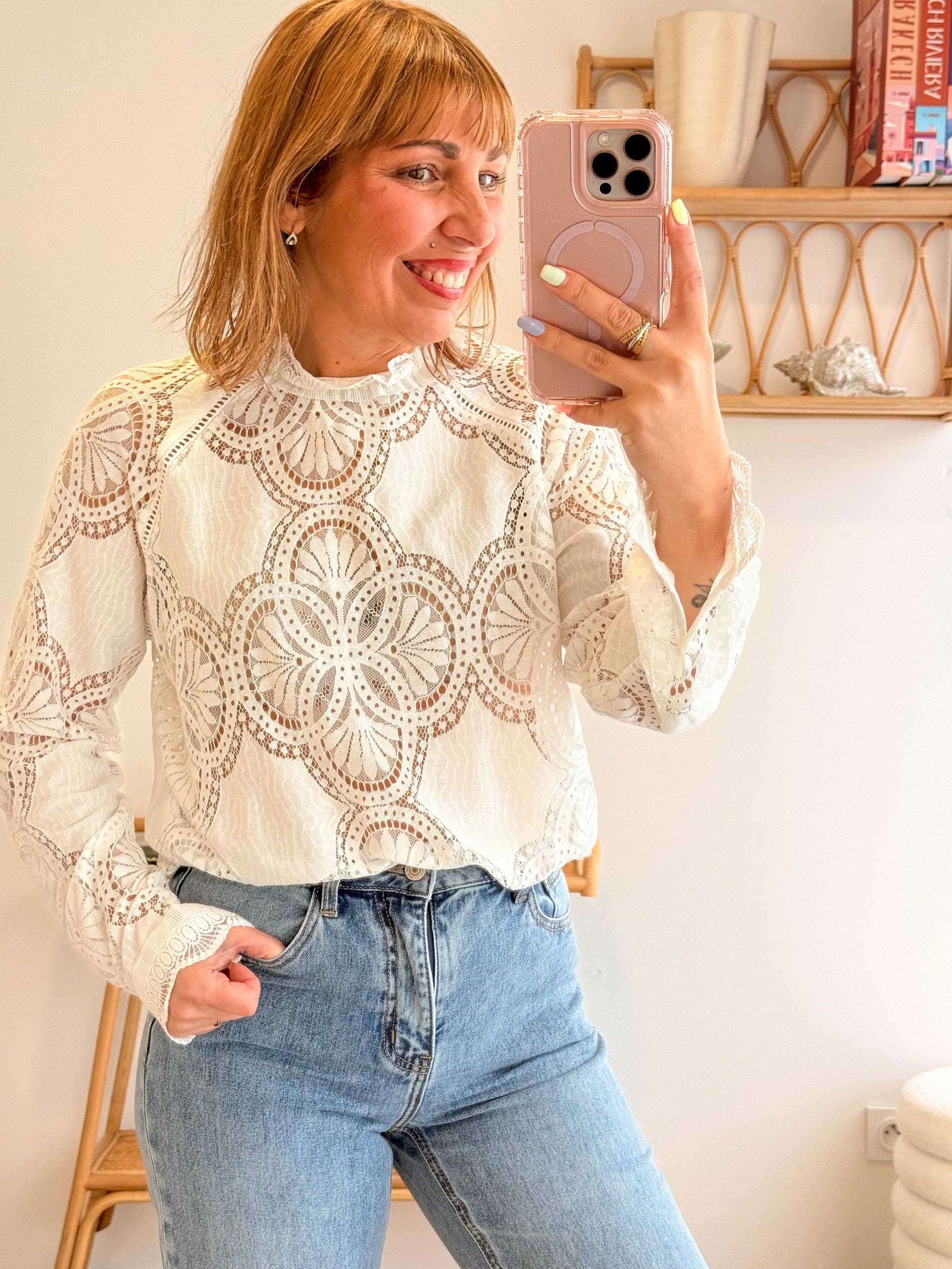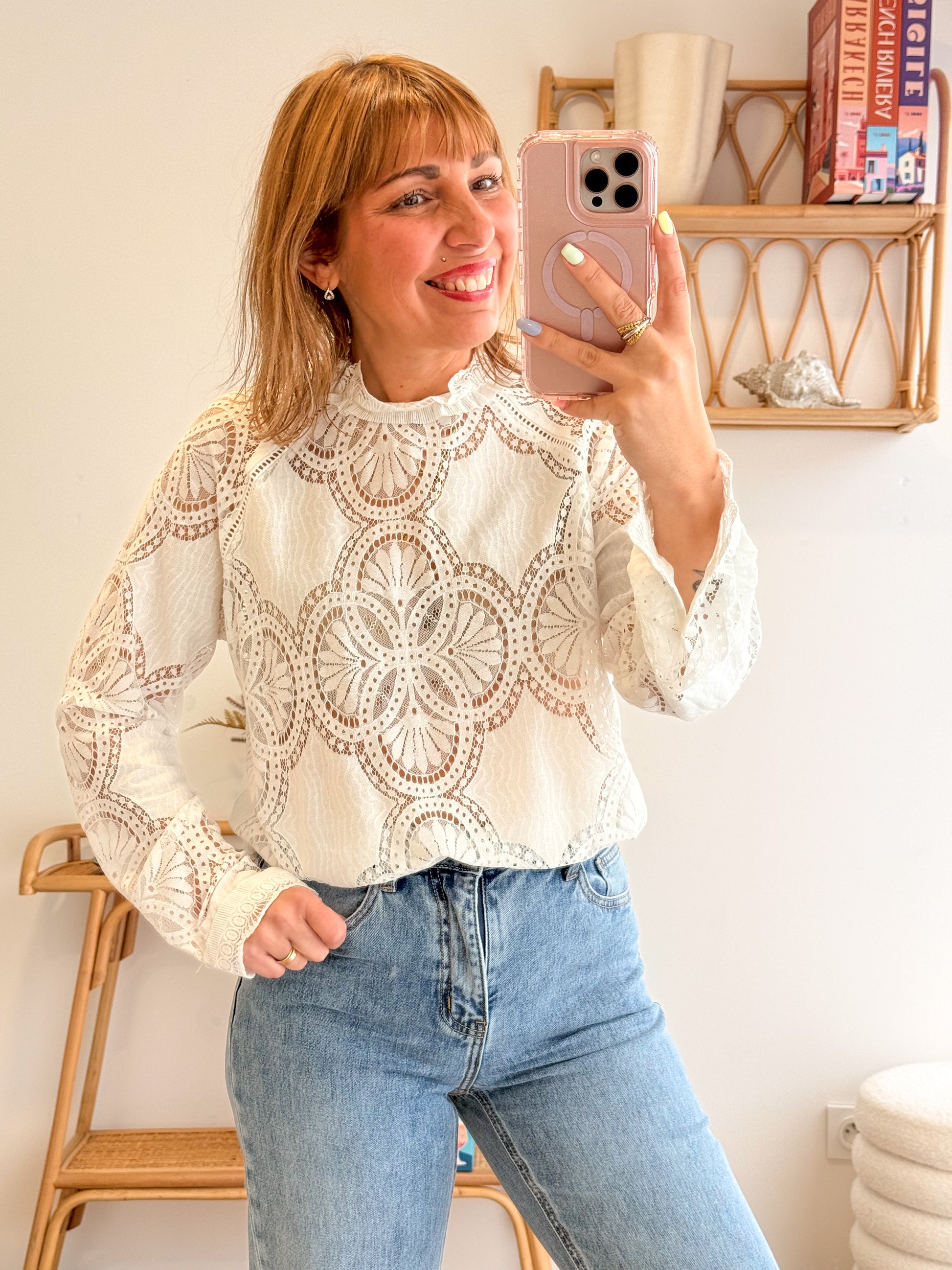 Avec sa dentelle délicate, son col légèrement montant et ses manches longues travaillées, il apporte une touche romantique tout en restant facile à porter au quotidien.