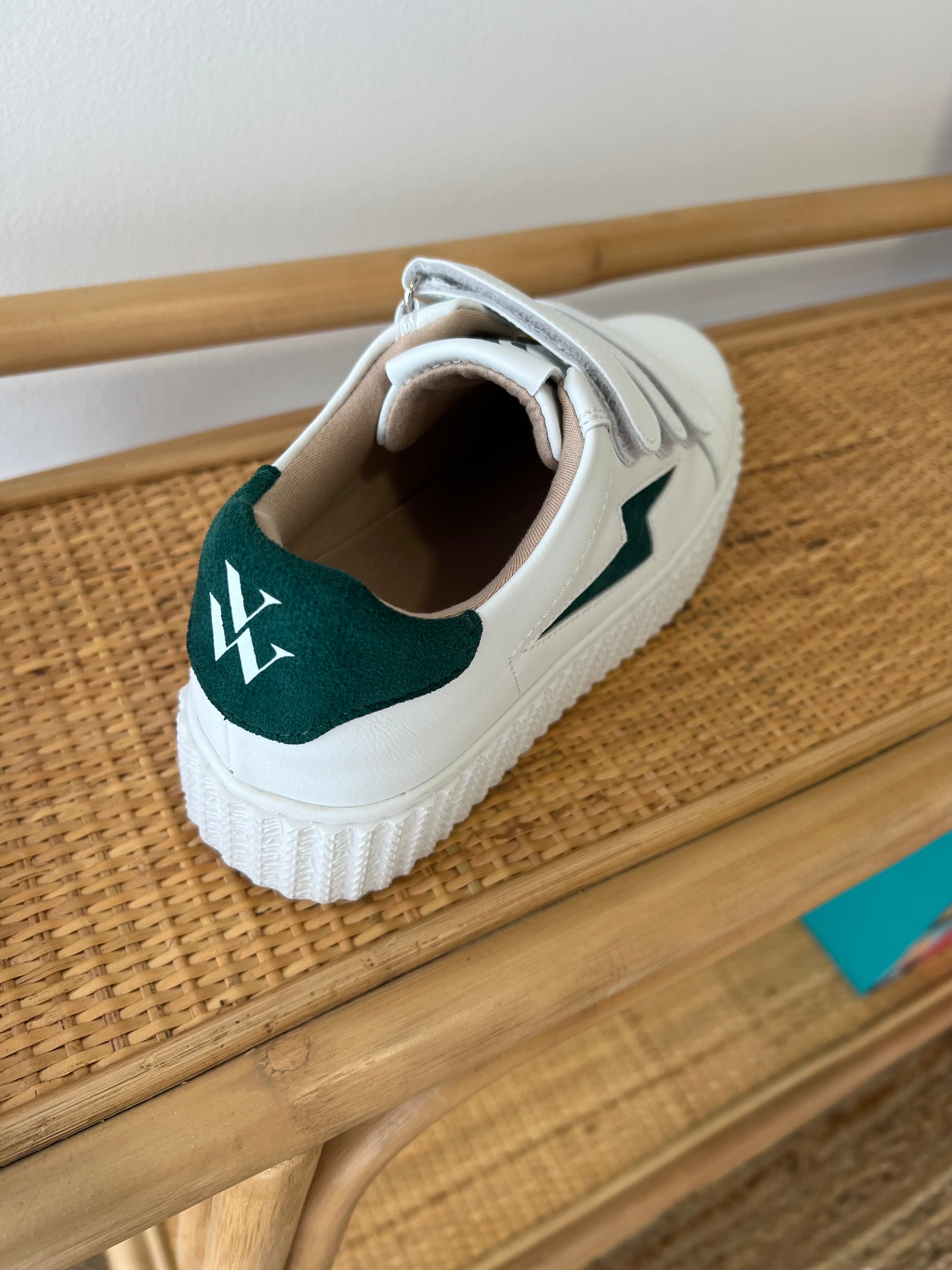 - Découpe en forme d'éclair et patch arrière en suédine vert sapin