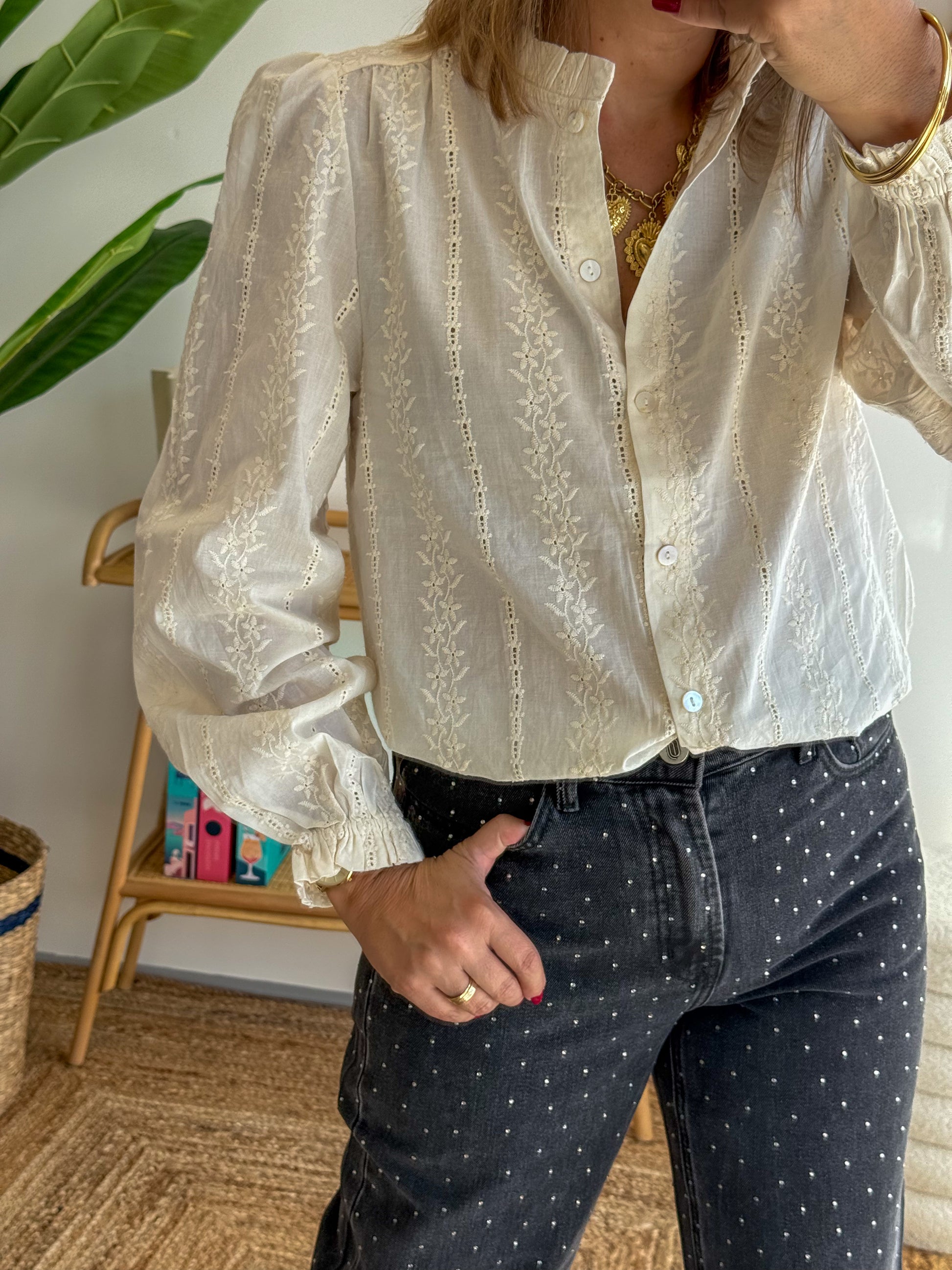 La blouse Anna est la pièce idéale pour un look bohème chic et féminin. Confectionnée dans une matière légère et agréable à porter, elle séduit par ses détails brodés et ses fines bandes ajourées qui apportent une touche romantique. Son col délicatement travaillé et ses manches légèrement bouffantes resserrées aux poignets ajoutent du charme à cette pièce intemporelle.