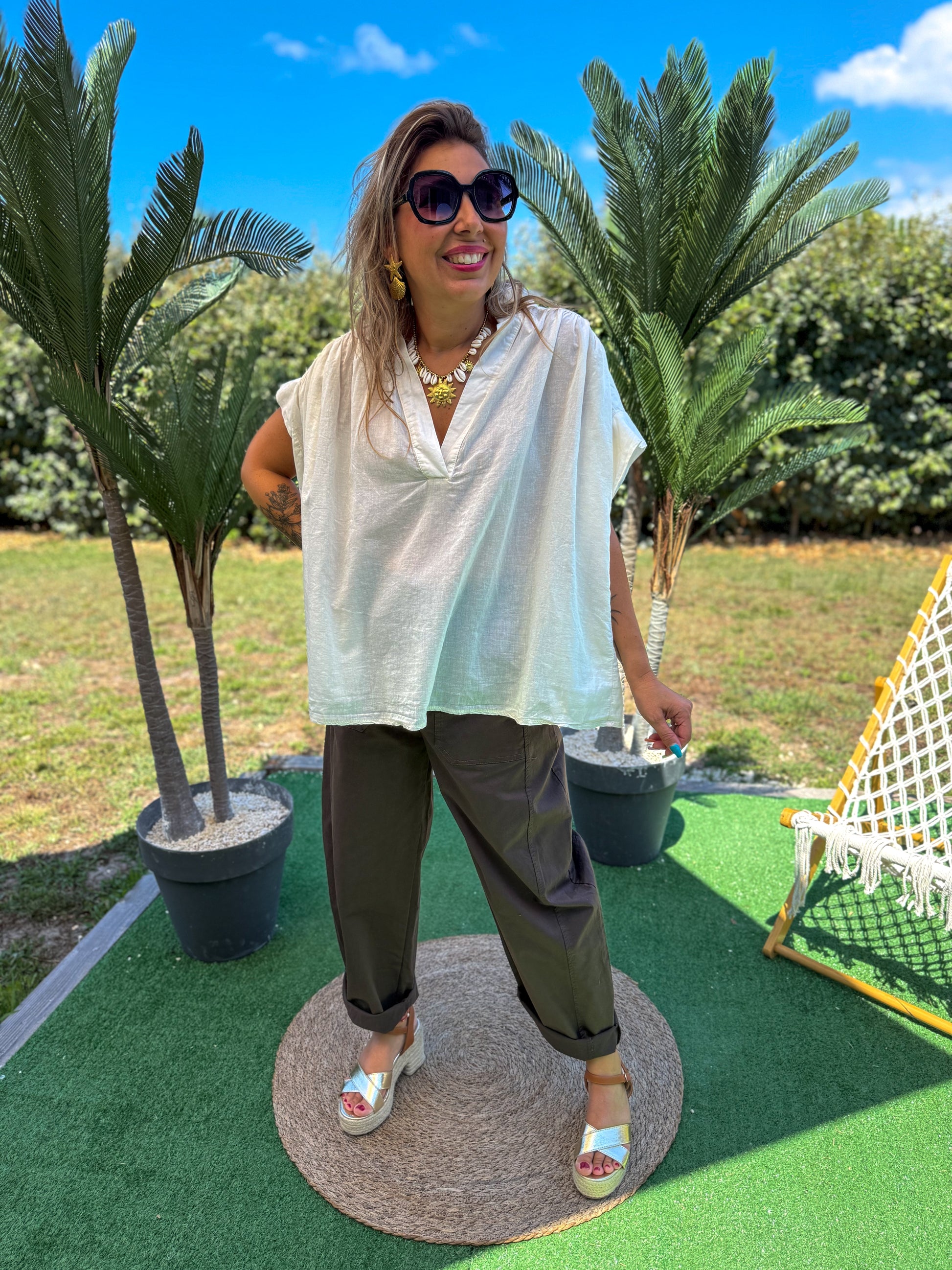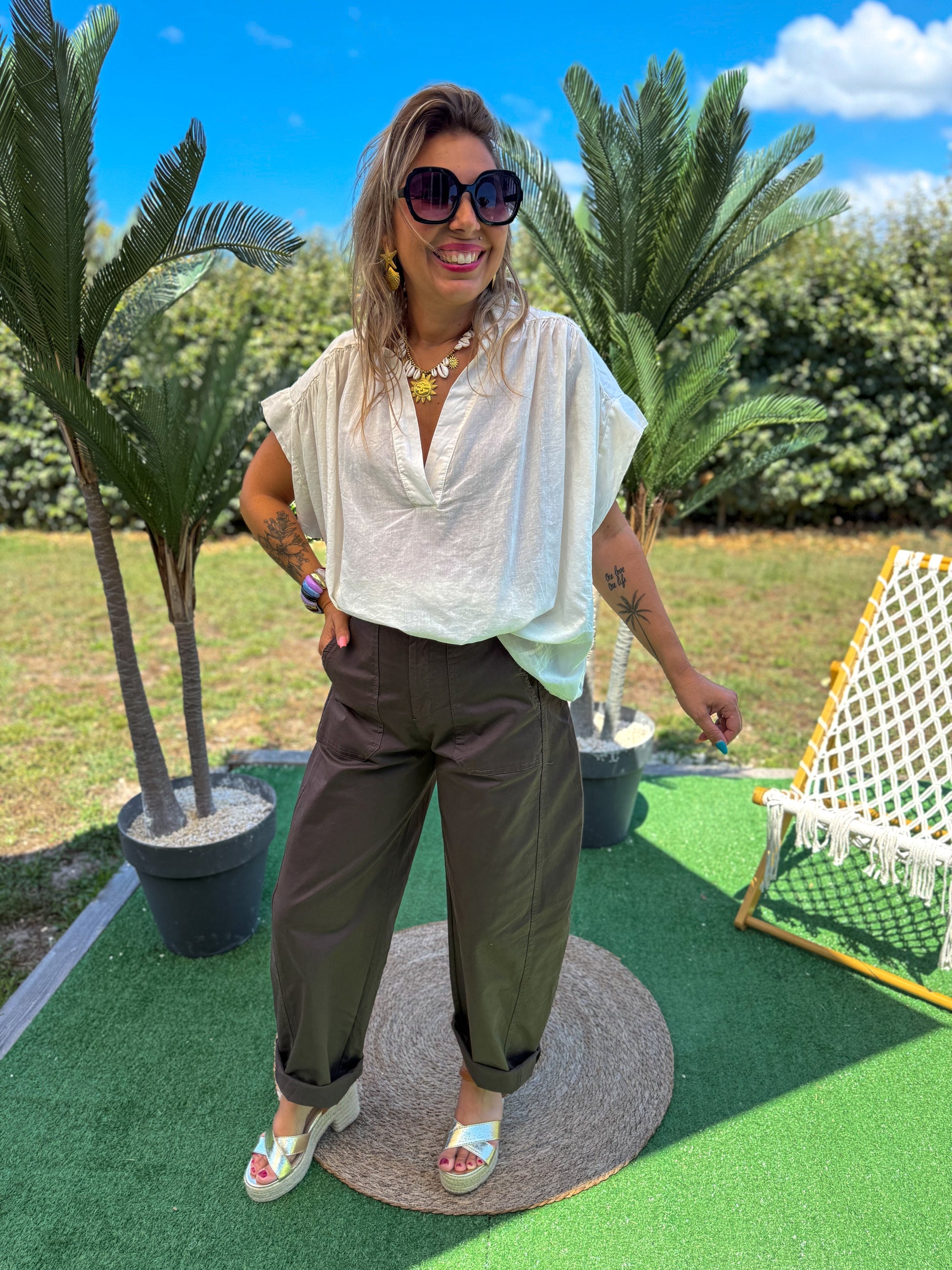 La blouse « Gigi » est la pièce bohème et fluide à adopter pour un été tout en légèreté. On adore sa coupe ample, son col tunisien et ses petits plis discrets aux épaules. Son coloris chocolat ultra tendance s’accorde aussi bien avec un short en jean qu’un pantalon fluide.