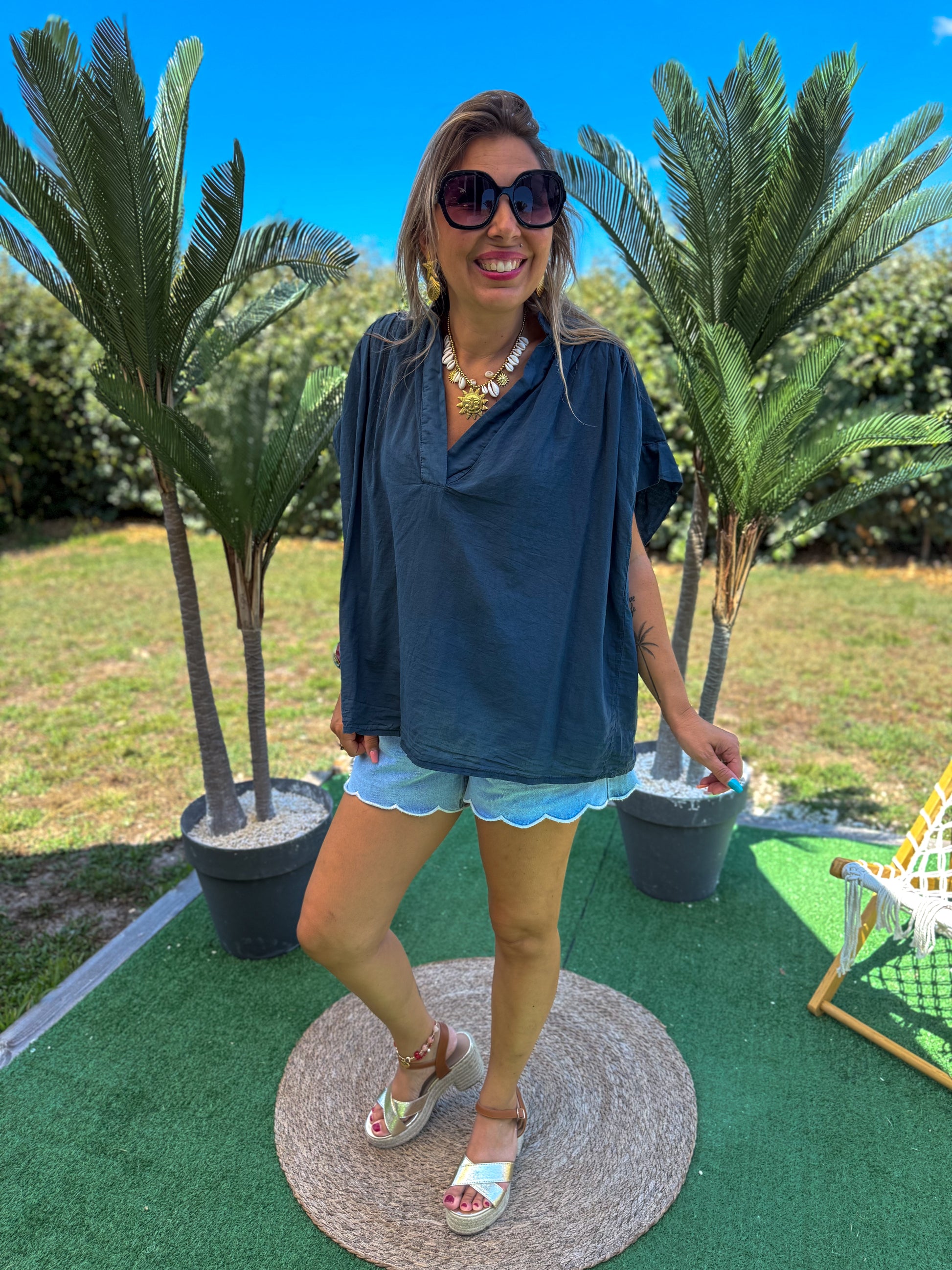 La blouse « Gigi » est la pièce bohème et fluide à adopter pour un été tout en légèreté. On adore sa coupe ample, son col tunisien et ses petits plis discrets aux épaules. Son coloris chocolat ultra tendance s’accorde aussi bien avec un short en jean qu’un pantalon fluide.