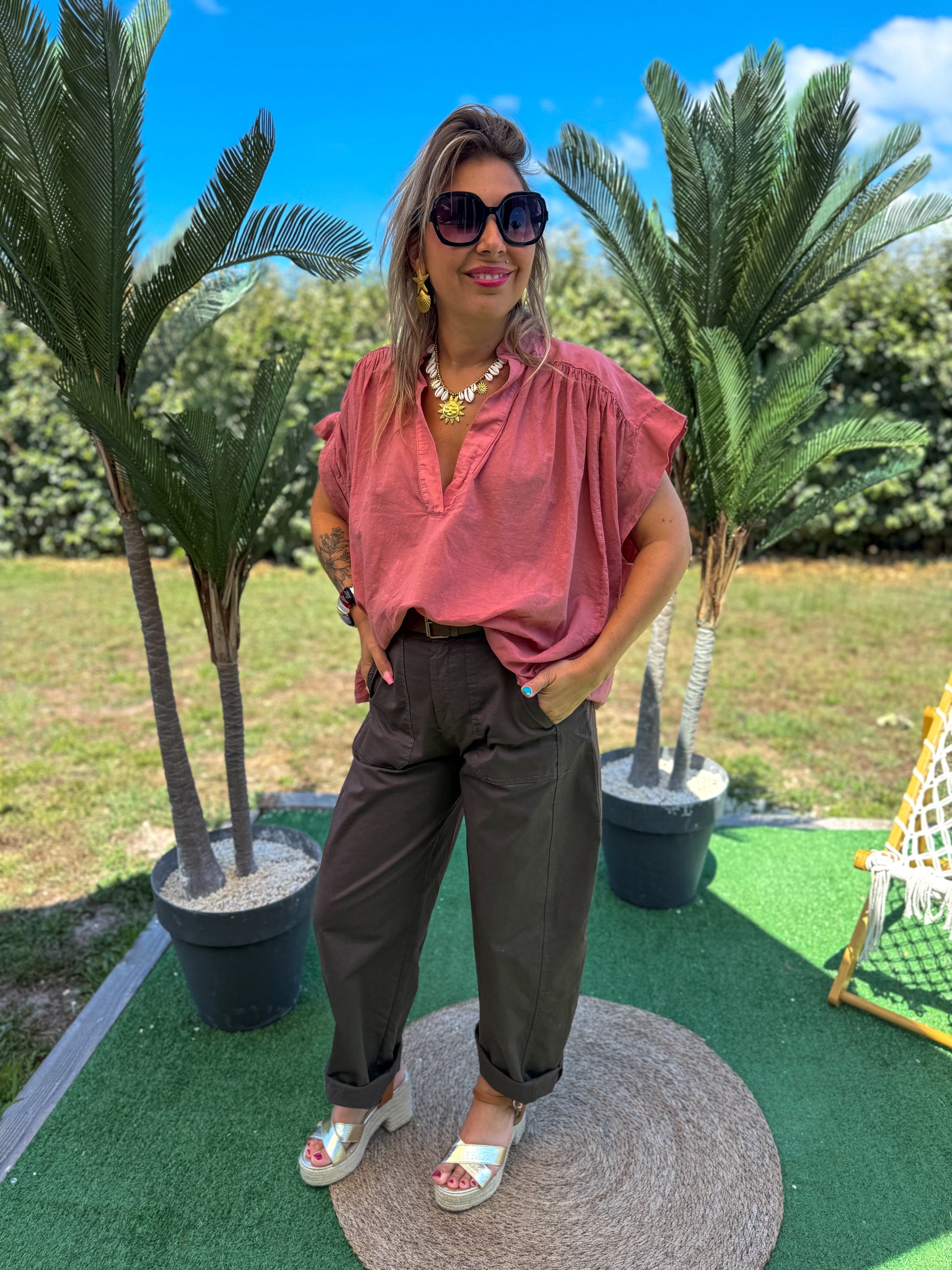 La blouse « Gigi » est la pièce bohème et fluide à adopter pour un été tout en légèreté. On adore sa coupe ample, son col tunisien et ses petits plis discrets aux épaules. Son coloris chocolat ultra tendance s’accorde aussi bien avec un short en jean qu’un pantalon fluide.