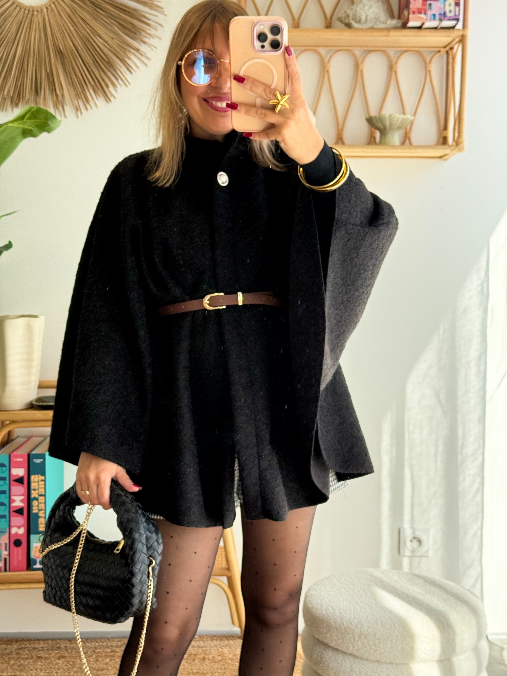 Apportez une touche de raffinement à vos looks avec la Cape Noire Élya . Sa coupe fluide et enveloppante est sublimée par une ceinture fine contrastante qui marque la taille et structure la silhouette.