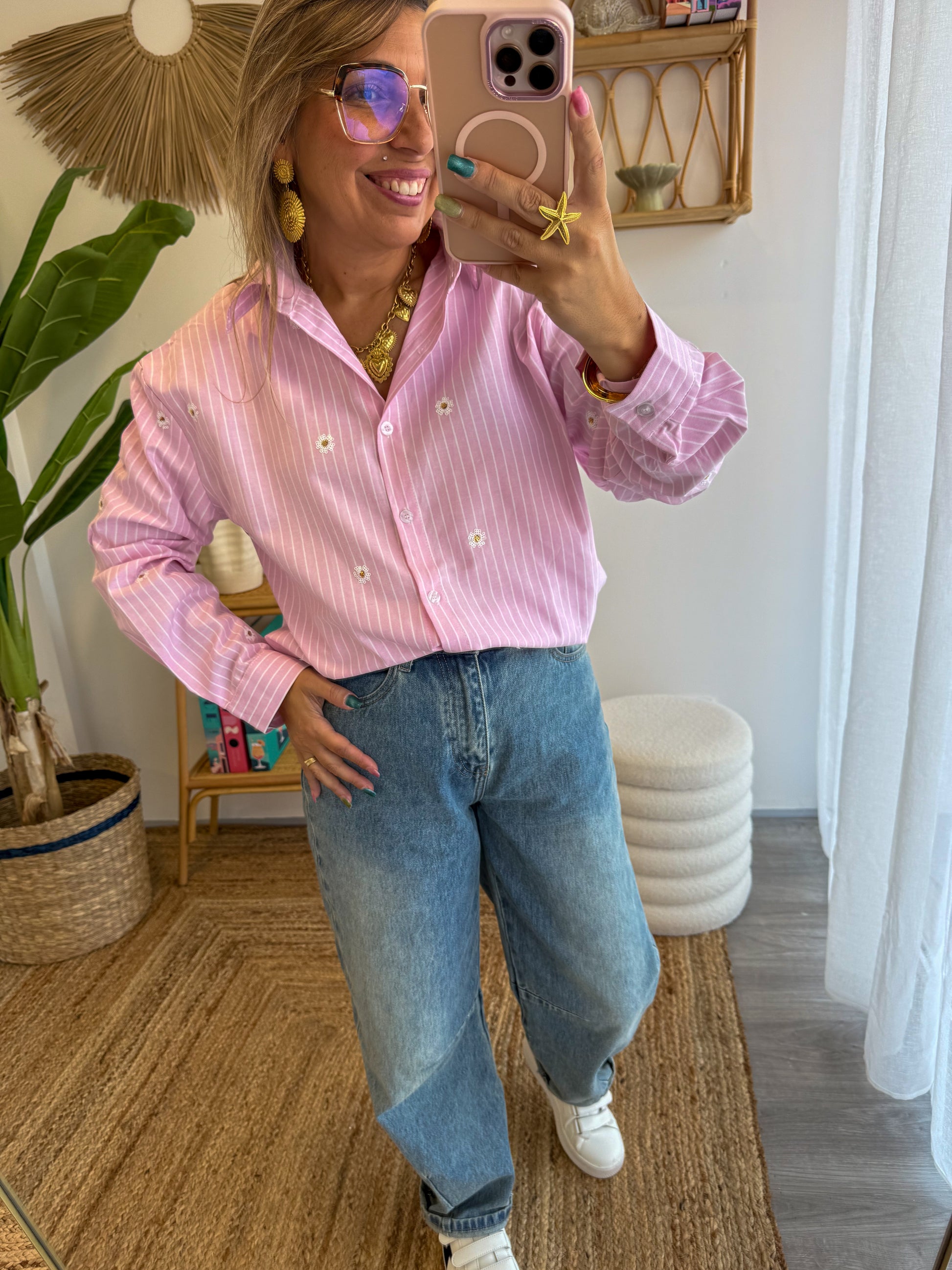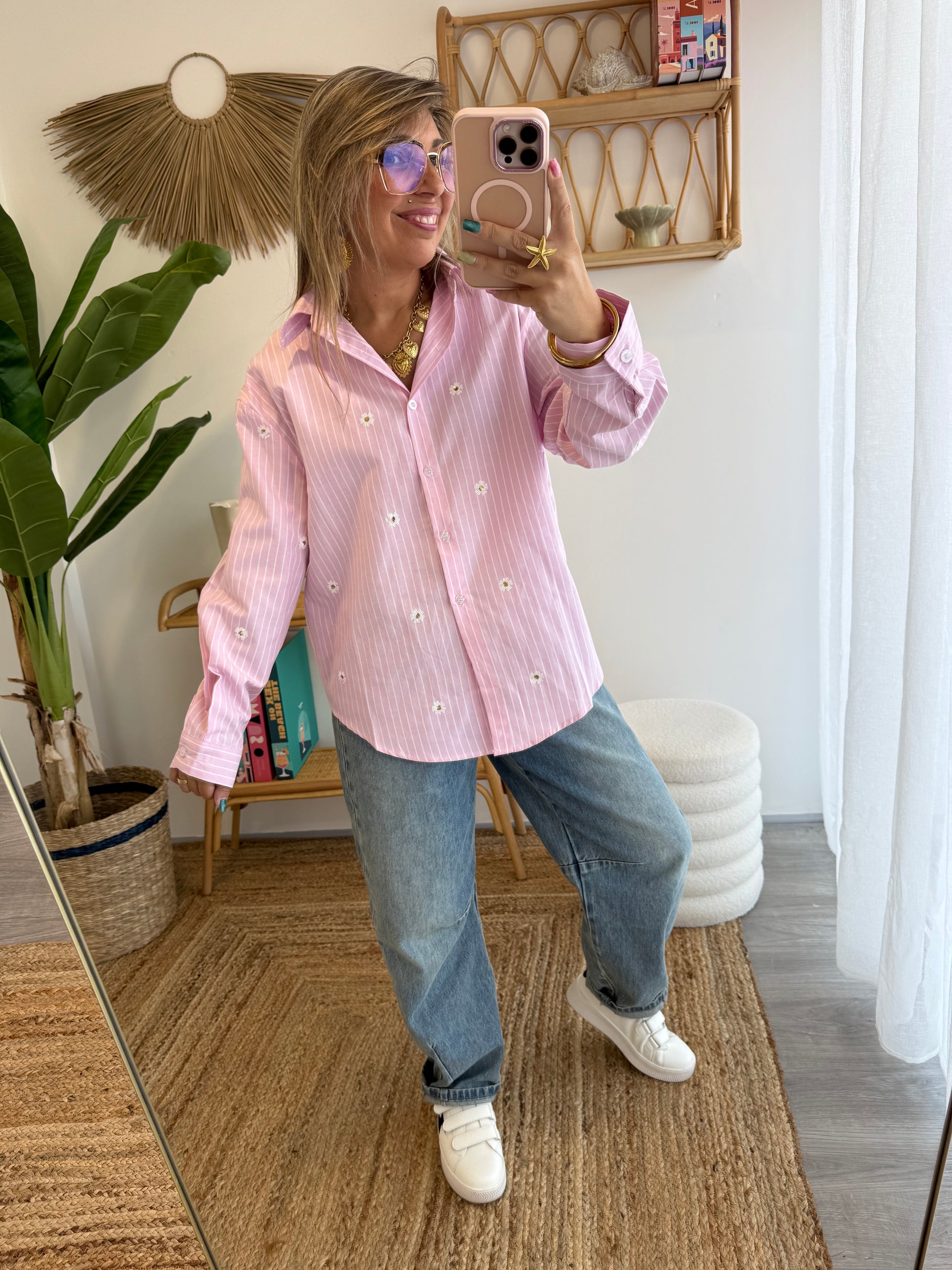 Craquez pour notre chemise rayée rose, délicatement brodée de petites fleurs blanches pour une touche fraîche et féminine 🌸. On adore son style casual chic : des rayures fines qui allongent la silhouette et des détails brodés qui apportent de l’originalité.
