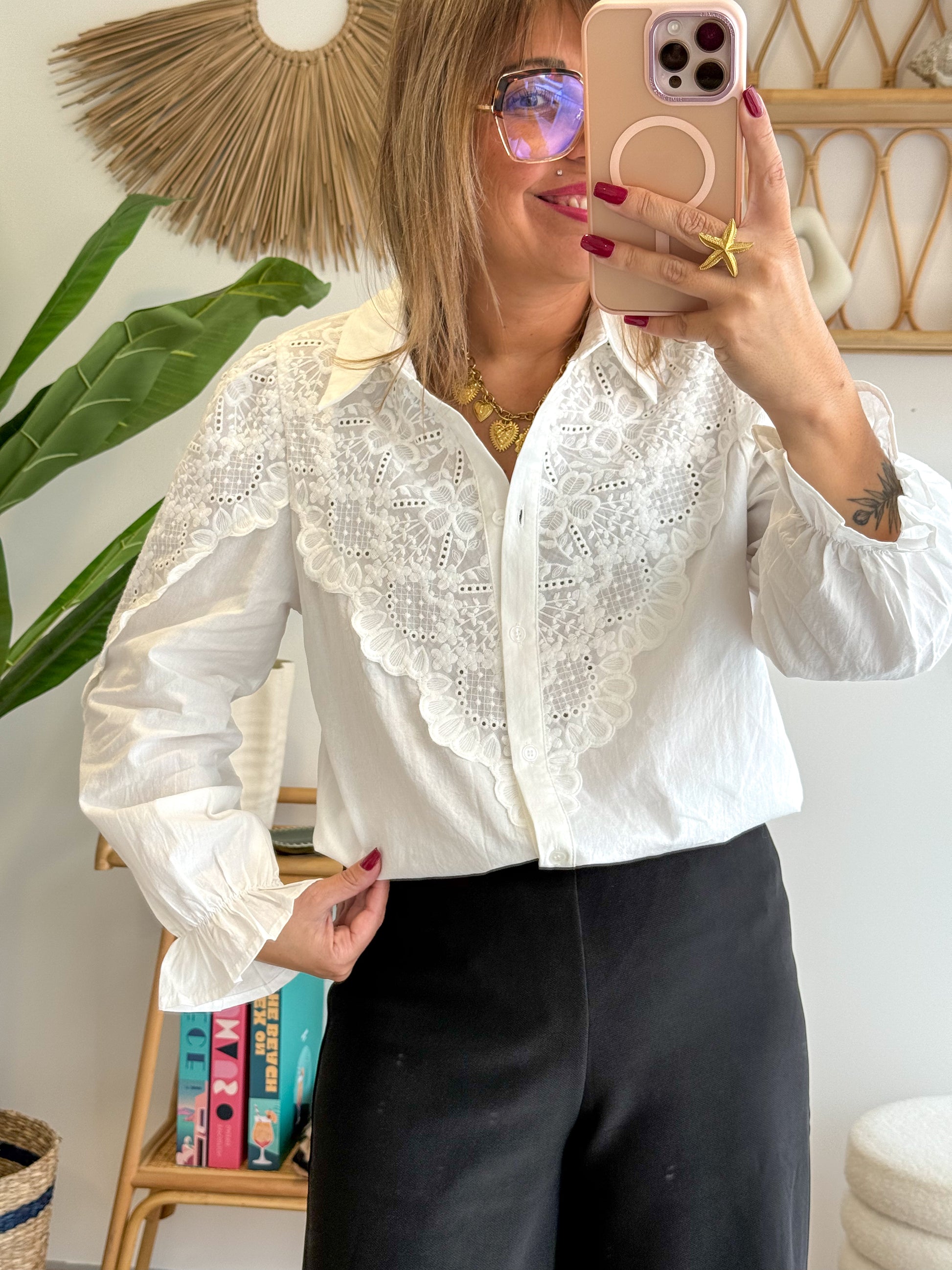 Élégante et raffinée, la chemise Elisa est la pièce parfaite pour sublimer vos looks du quotidien comme vos tenues plus habillées. Son empiècement en dentelle brodée sur le devant apporte une touche romantique et féminine, tandis que son col classique et ses poignets volantés lui donnent un charme unique.