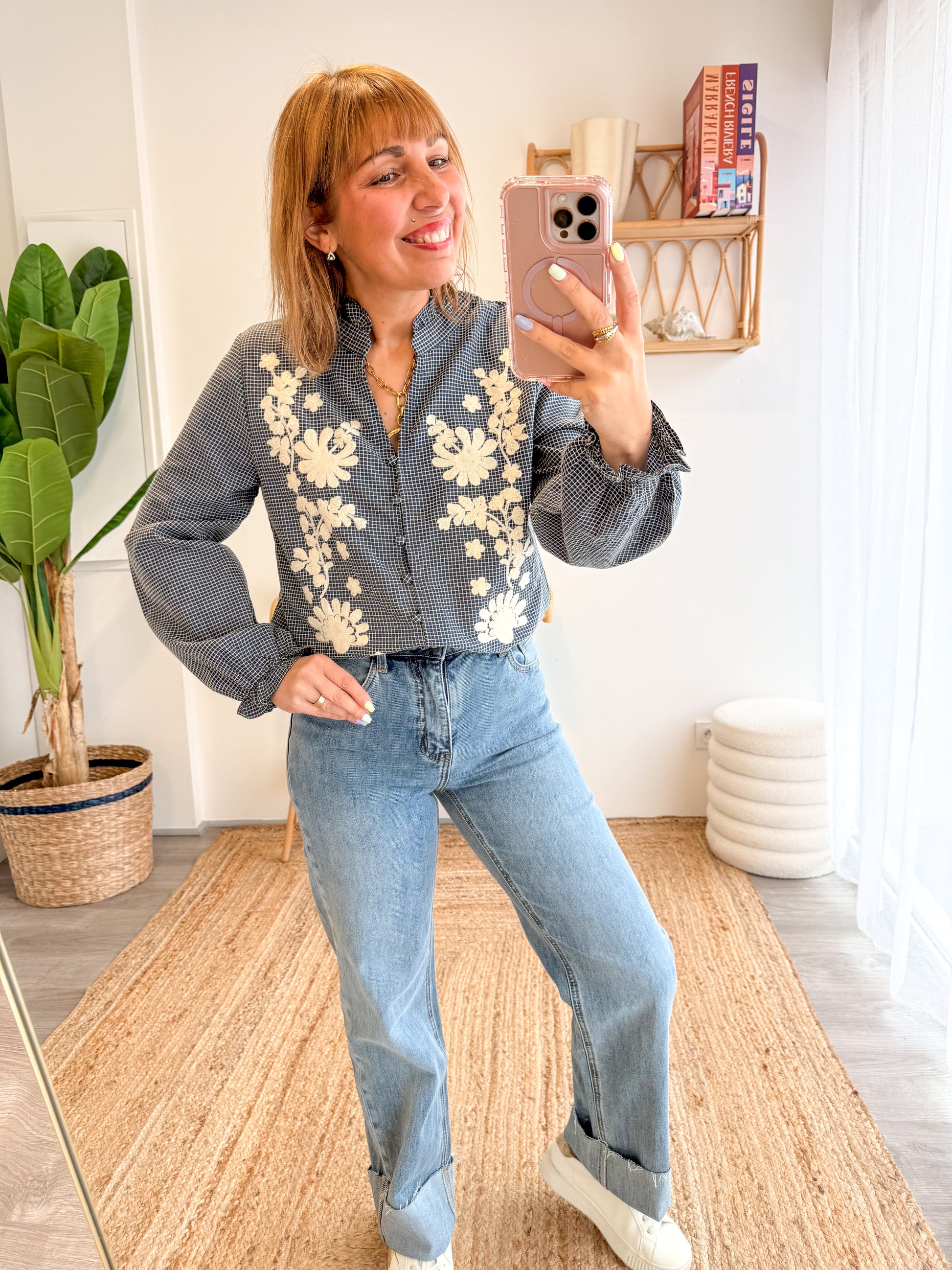 La Chemise Nerea séduit par son imprimé à petits carreaux bleu/gris et ses magnifiques broderies florales écrues sur le devant. Un vrai coup de cœur pour celles qui aiment les détails délicats et féminins.
