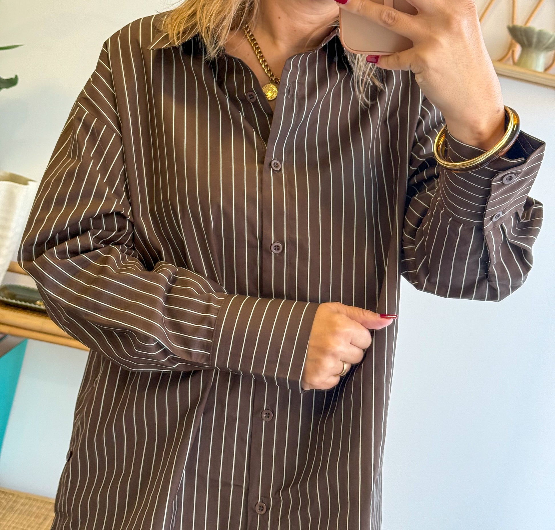 Adoptez un style tendance et décontracté avec la chemise Café Rayé. Sa coupe oversize apporte une allure moderne et confortable, tandis que ses fines rayures verticales allongent la silhouette et ajoutent une touche chic.