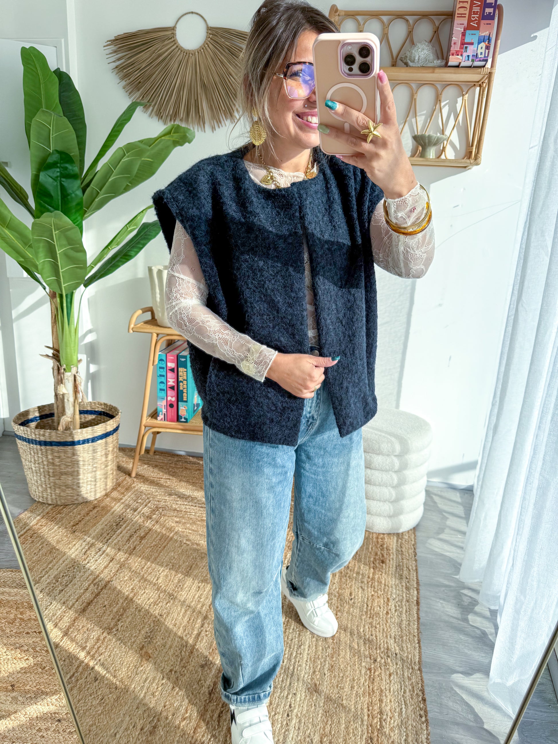 Avec sa coupe droite et sans manches, il se porte facilement en superposition sur vos chemises, pulls ou robes pour apporter chaleur et style. Son effet teddy tout doux lui confère un look cosy et tendance, parfait pour la mi-saison.