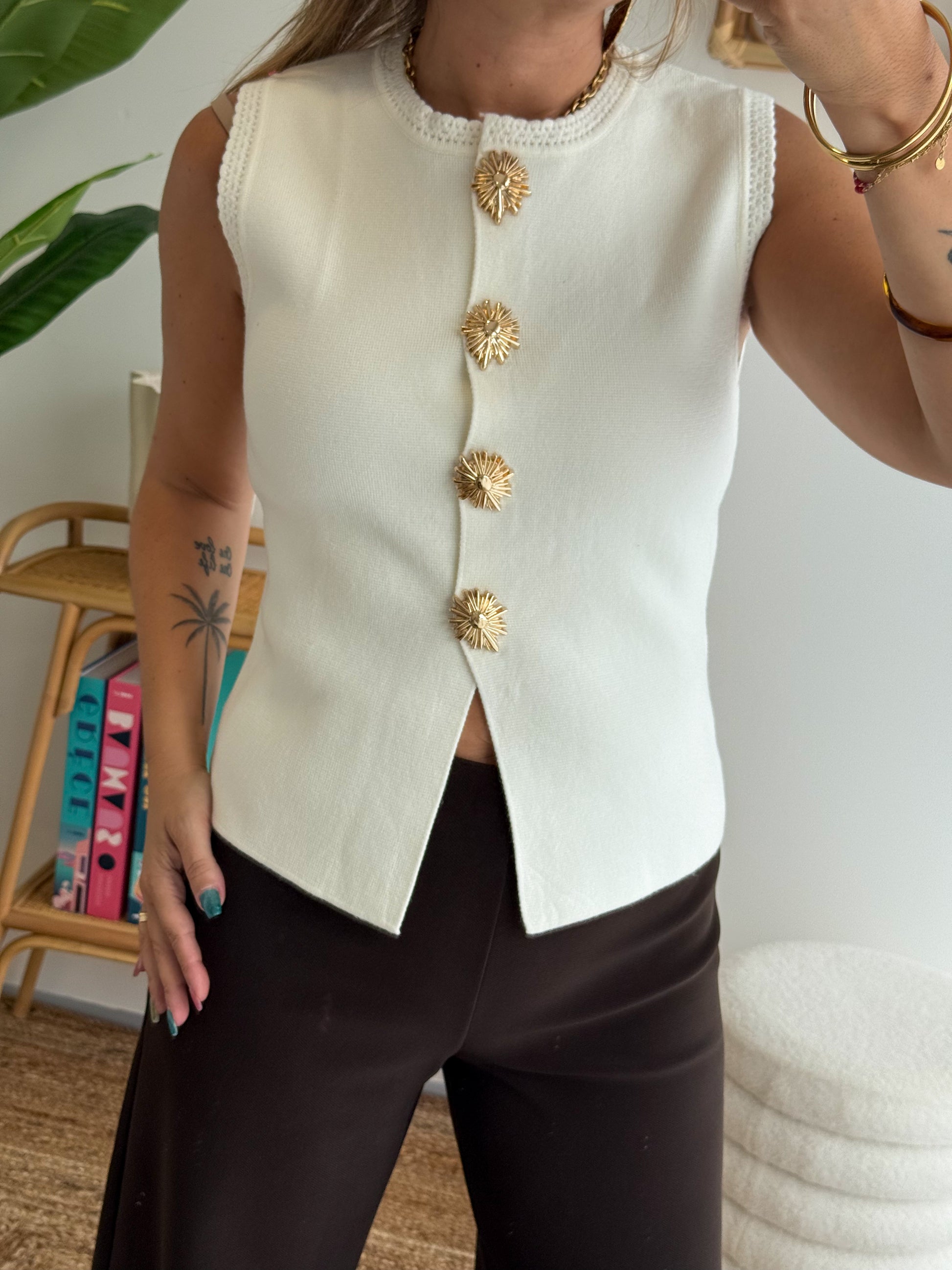 Adoptez une allure chic et tendance avec ce gilet sans manches en maille blanche. Confortable et élégant, il se distingue par ses magnifiques boutons dorés effet bijou, qui apportent une touche raffinée et lumineuse à la silhouette.