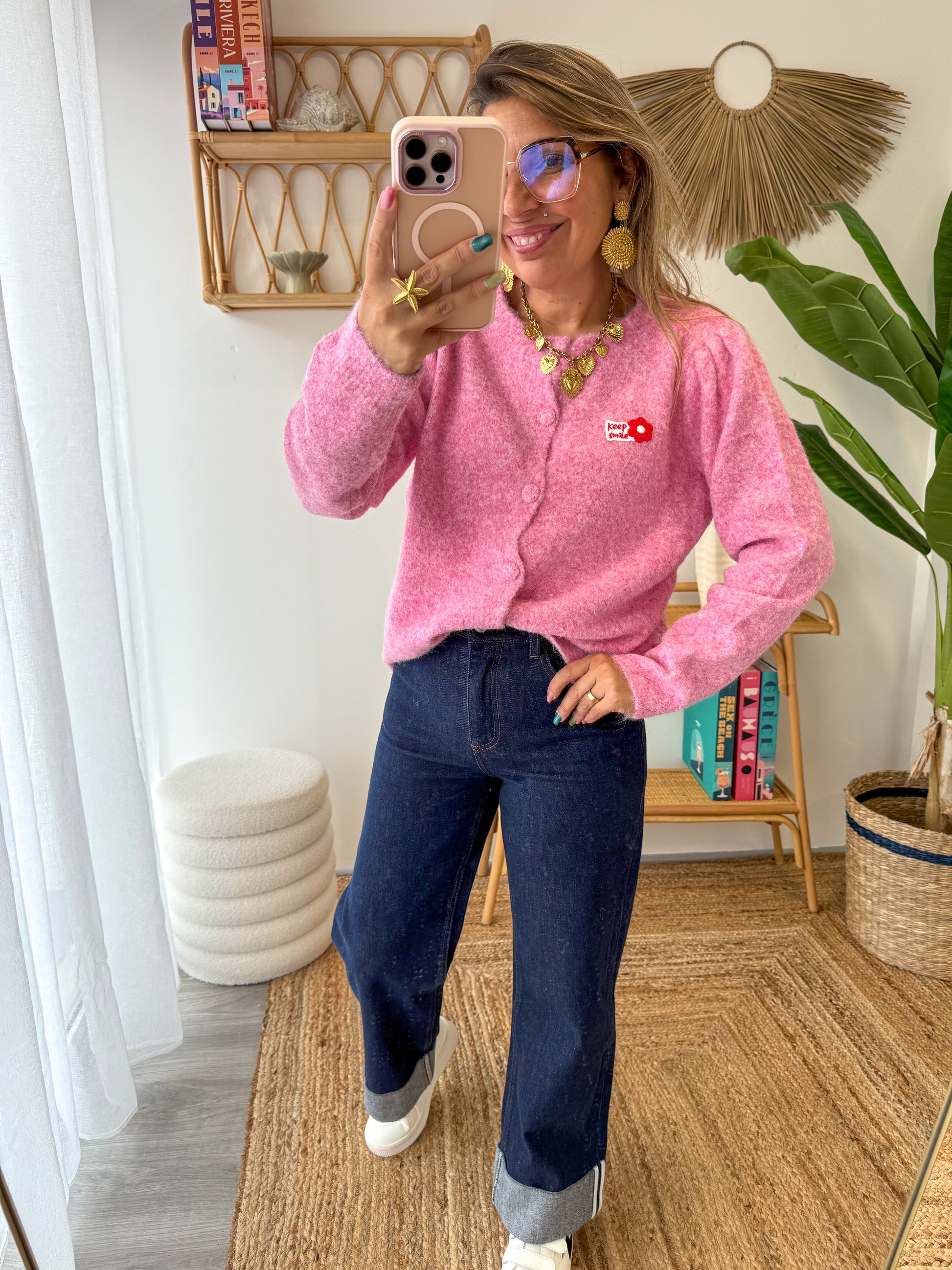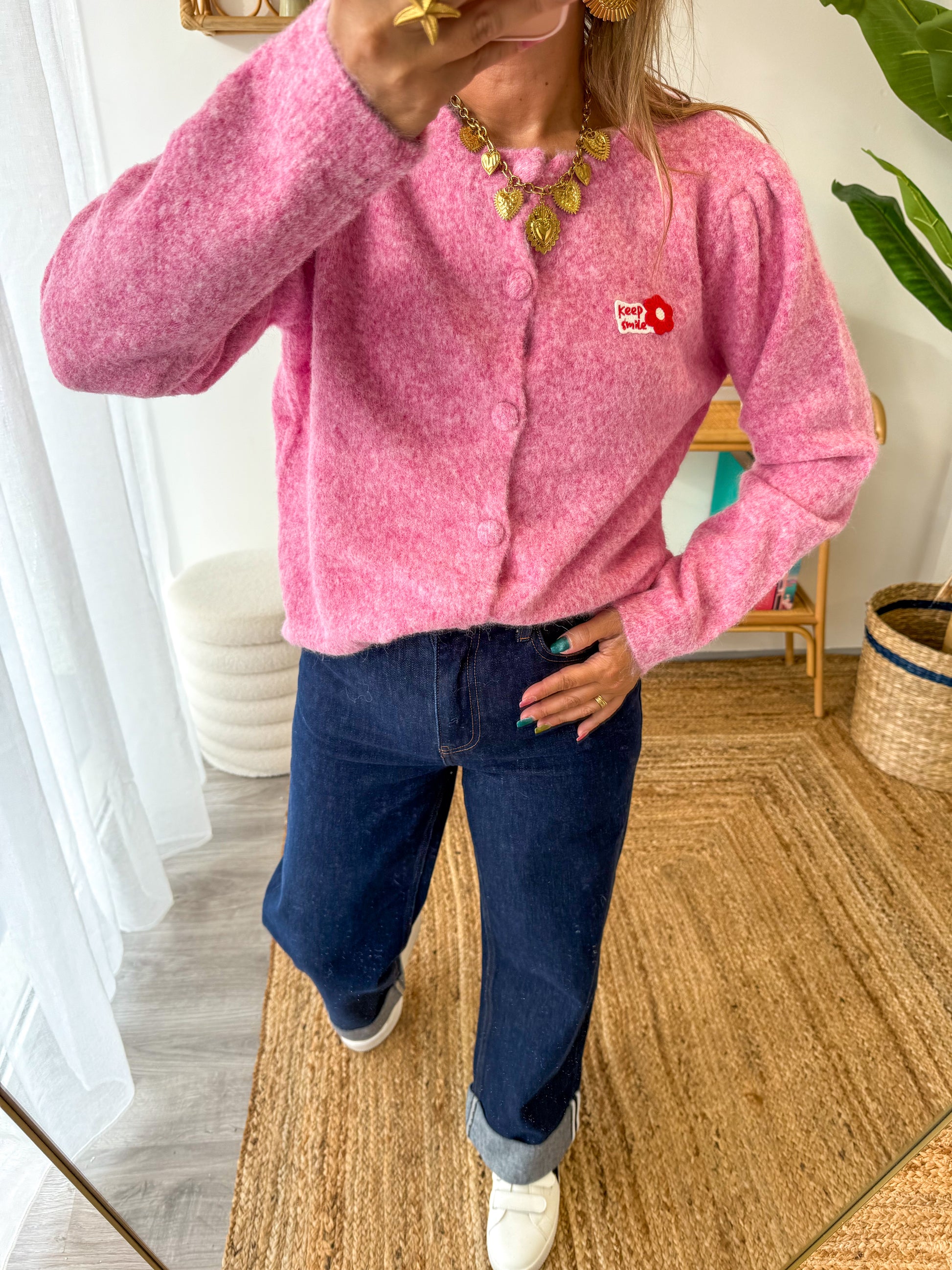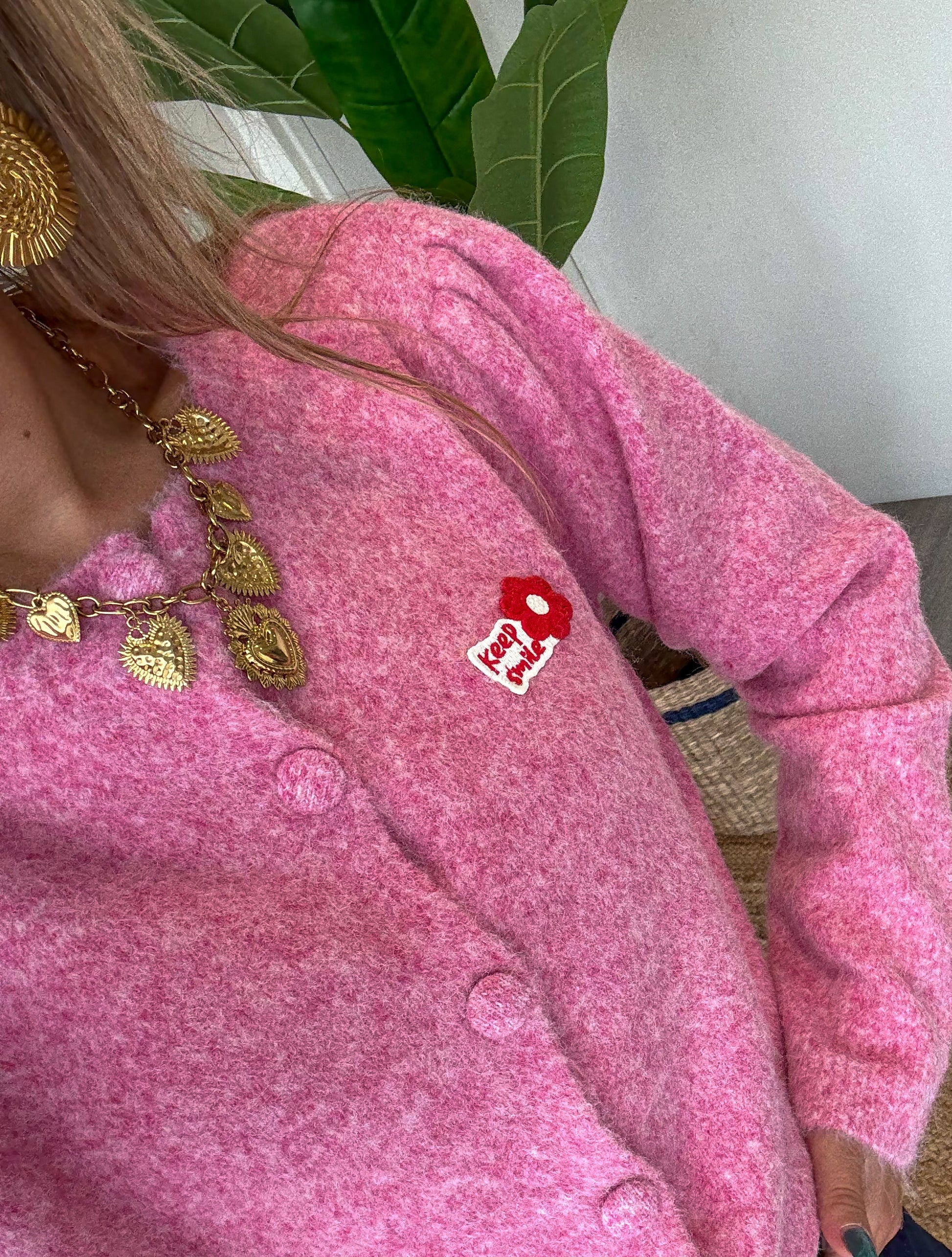 Coup de cœur assuré pour ce gilet tout doux qui met instantanément de bonne humeur ! On adore sa maille moelleuse effet duveteux, son coloris rose bonbon ultra-féminin et son petit patch brodé “Keep Smile” qui apporte la touche fun et positive.