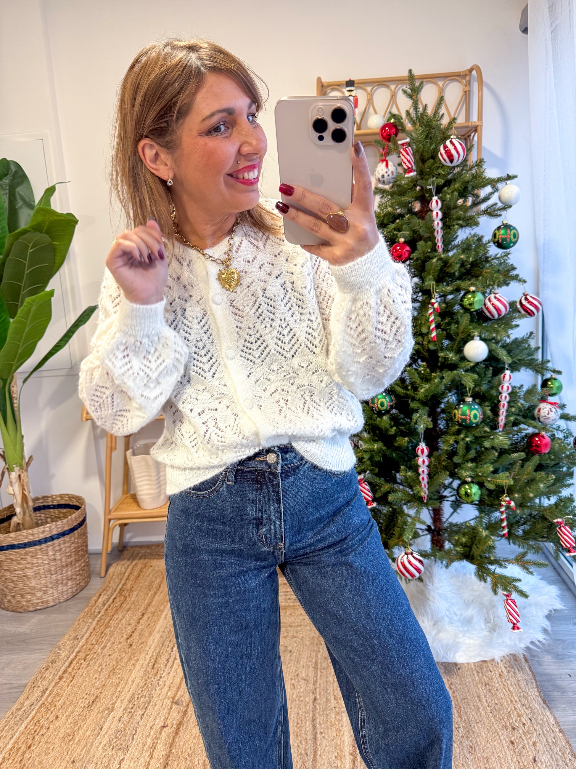 Le gilet ISALY est une vraie pépite de douceur et de féminité. Sa maille ajourée délicate, associée à sa coupe légèrement bouffante, lui apporte un charme romantique irrésistible.