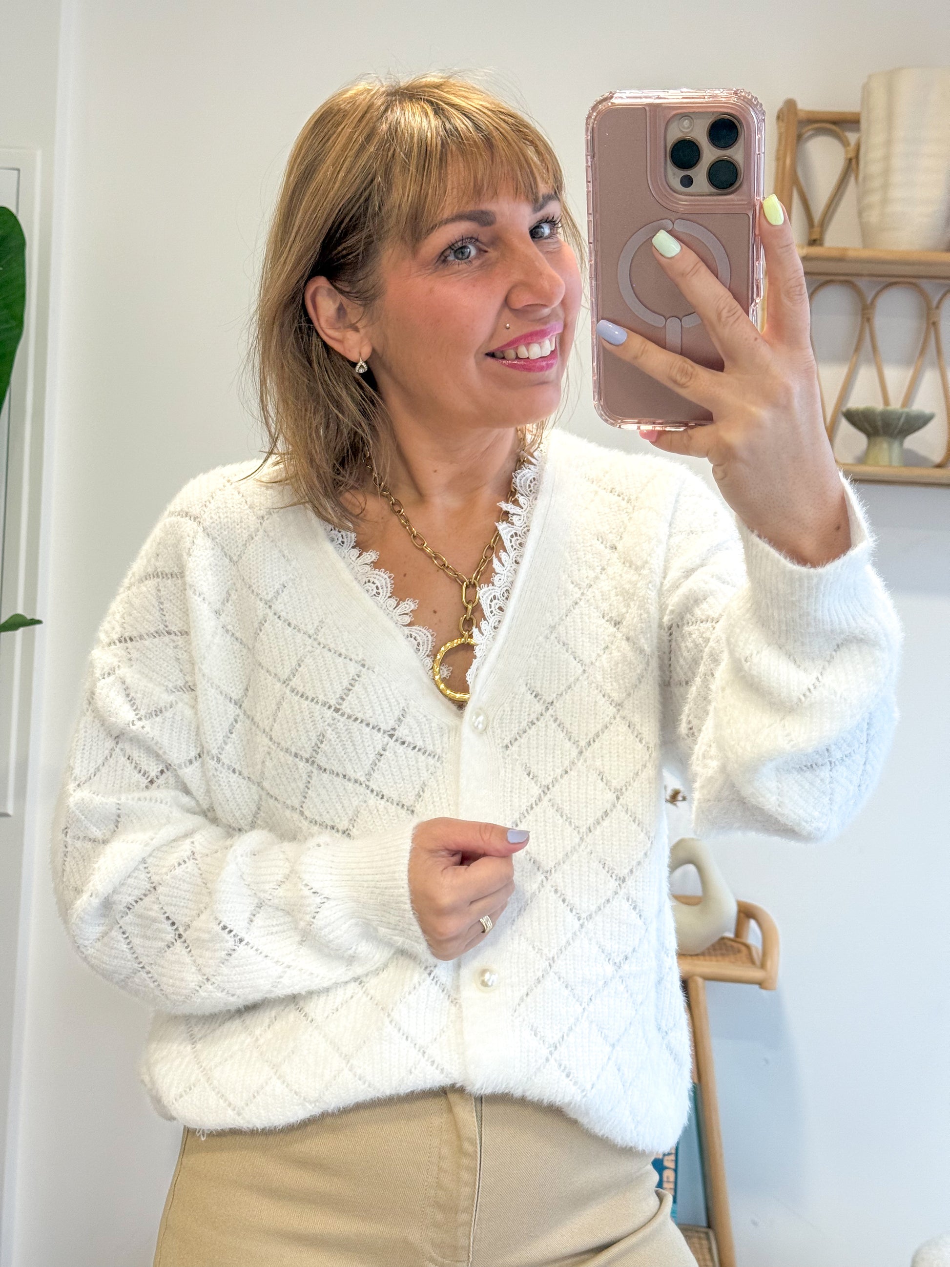 Le gilet Olga est un véritable coup de cœur pour celles qui aiment les pièces délicates et intemporelles. Sa maille blanche ultra douce, sublimée par un motif en losanges et un col V bordé de dentelle, en fait une pièce à la fois raffinée et facile à porter.