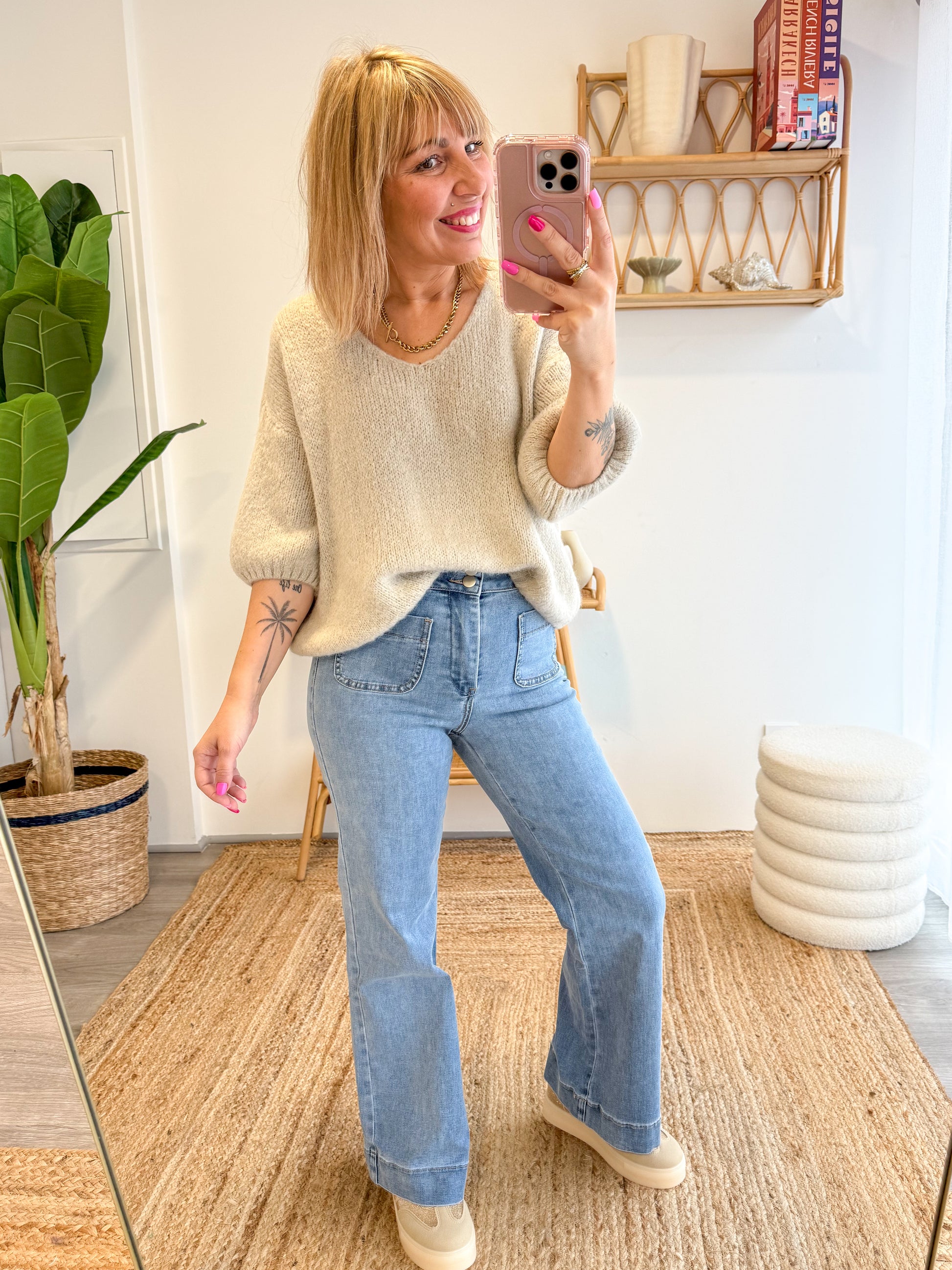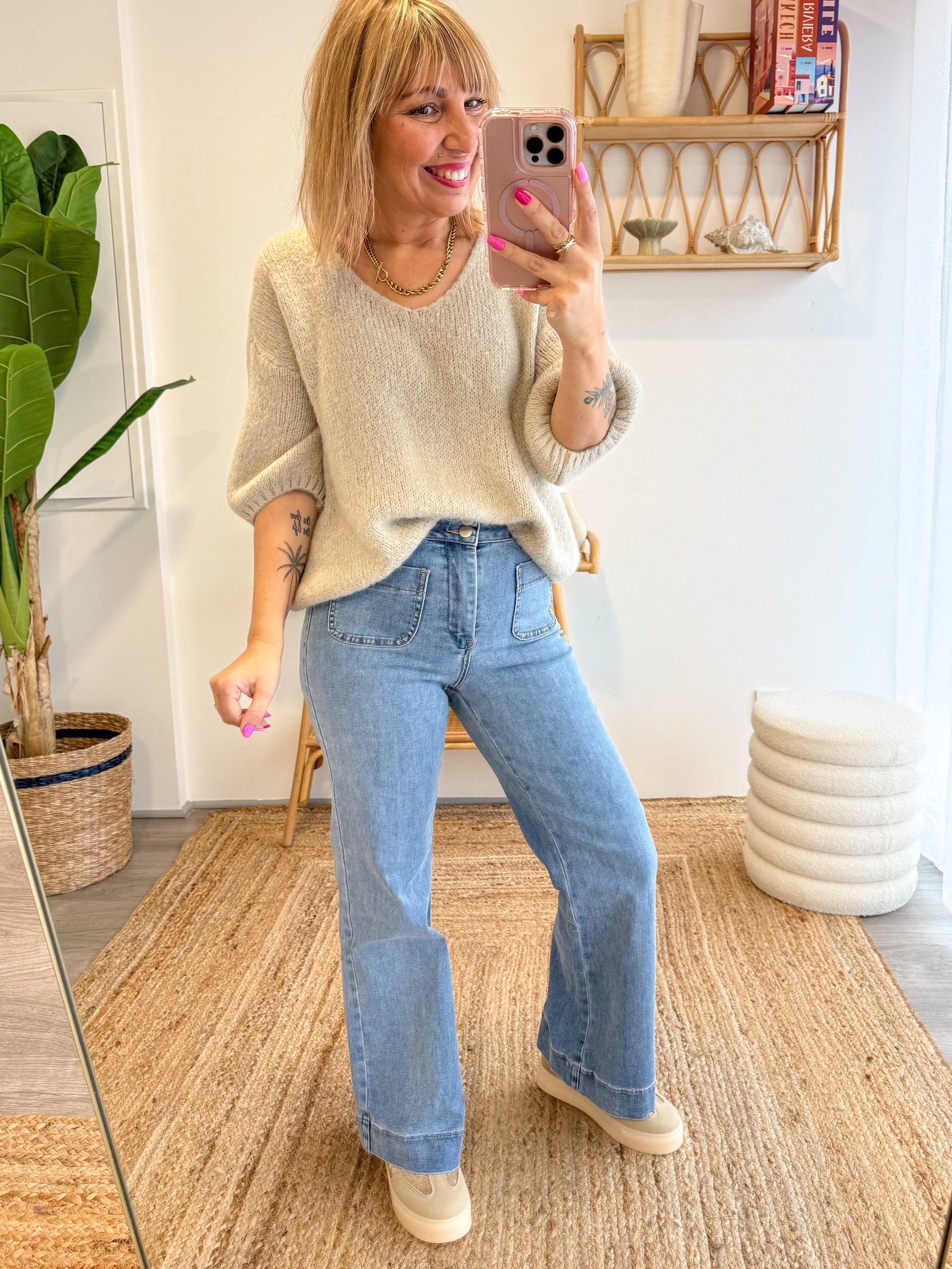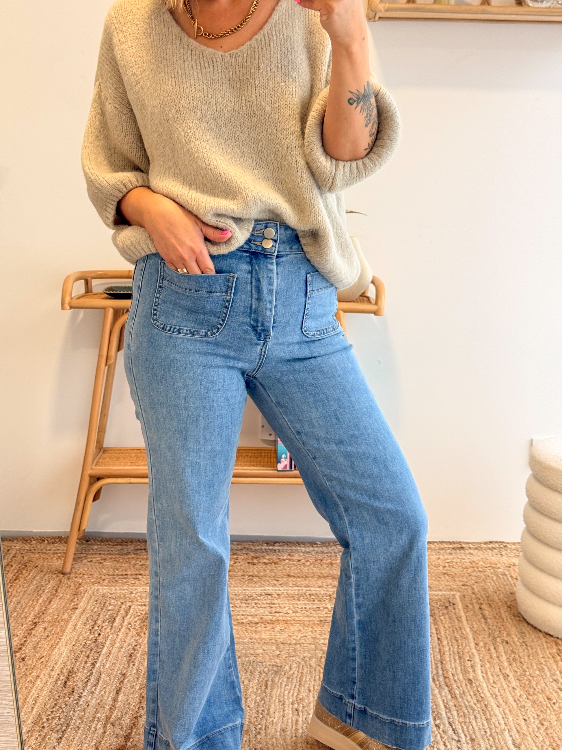 Le Jean Elenette revisite la coupe flare avec modernité et élégance. Taille haute, légèrement évasé à la cheville, il allonge la silhouette tout en apportant une touche rétro-chic.
