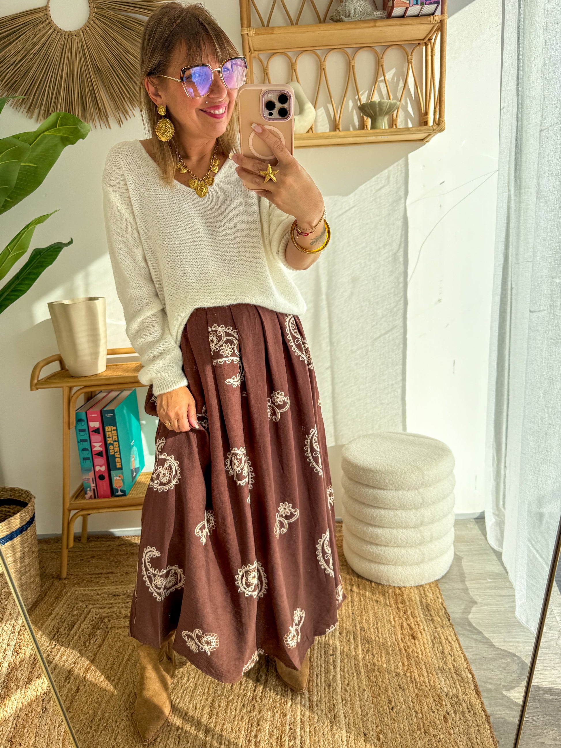 Élégante et fluide, la jupe Léonie séduit par son imprimé paisley délicat et son coloris chocolat profond. Sa coupe longue et évasée met en valeur toutes les silhouettes, tout en offrant confort et légèreté. Une pièce bohème et féminine, idéale pour la saison.