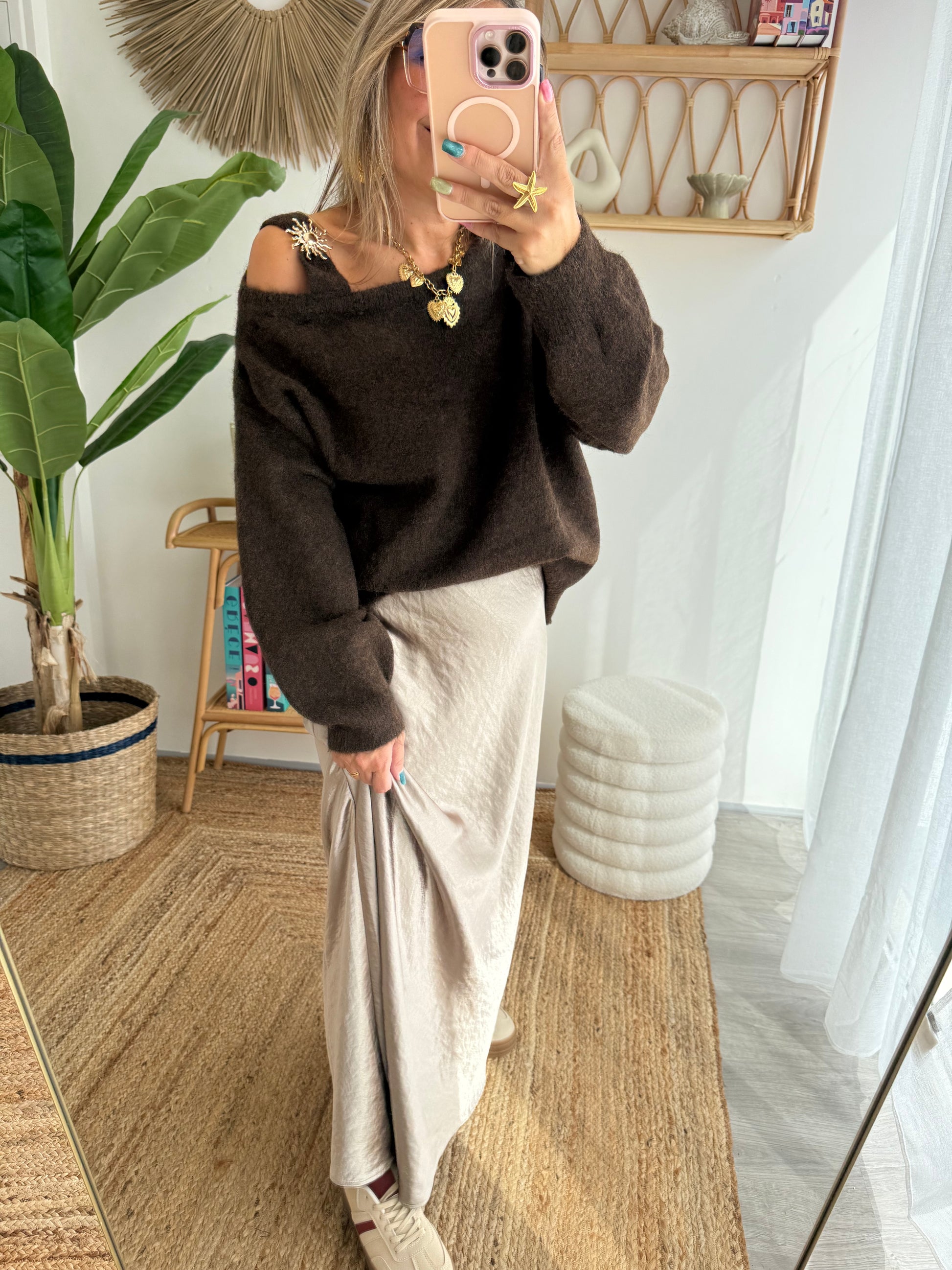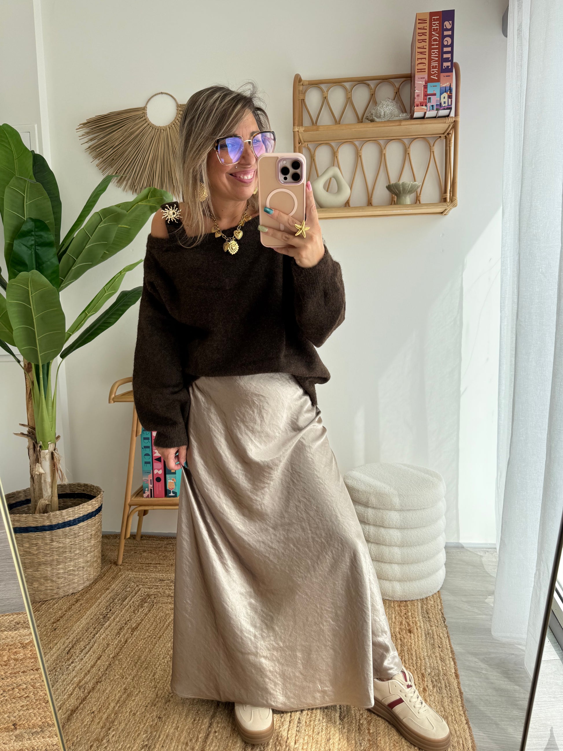Apportez une touche chic et tendance à votre dressing avec notre jupe longue Bella satinée doré .