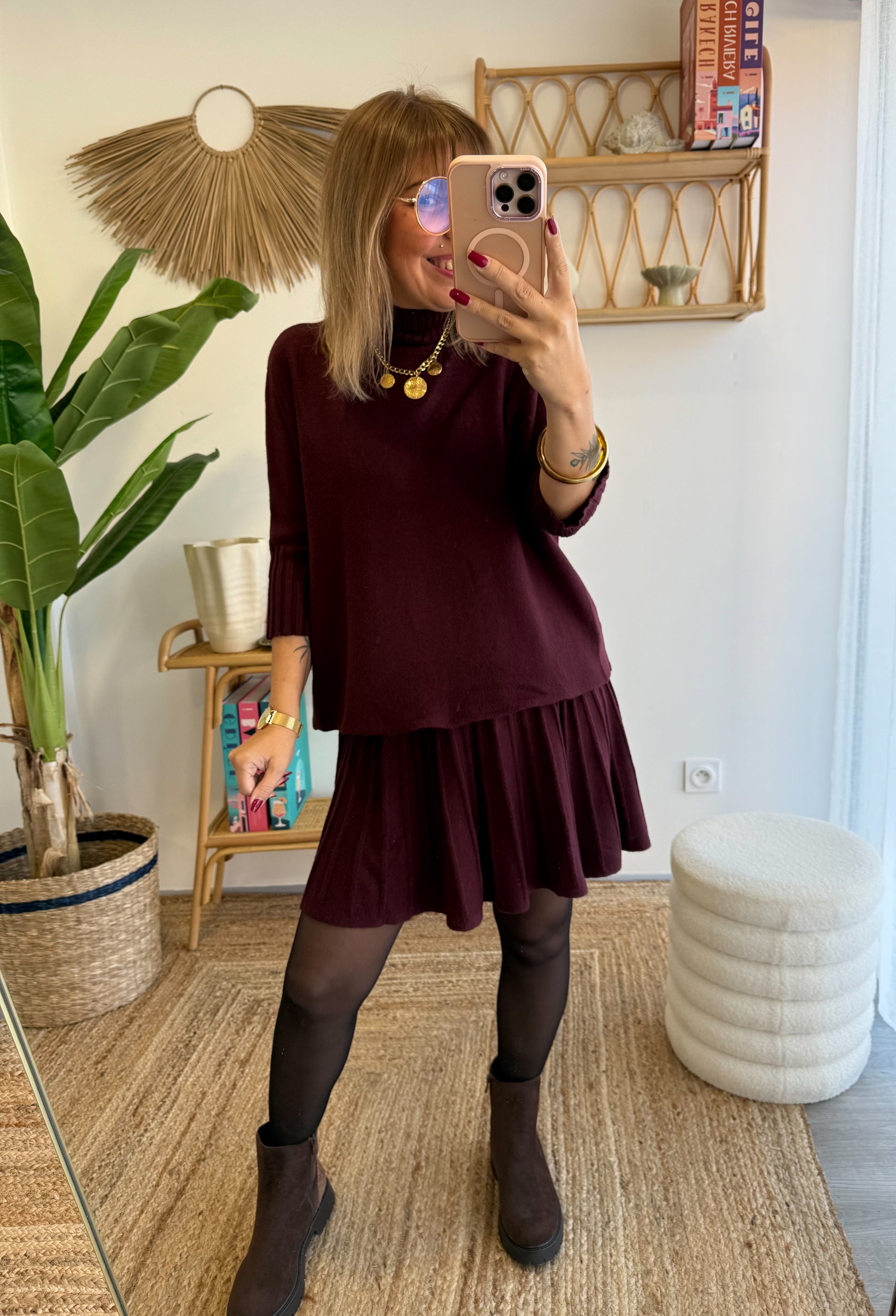 Féminine et confortable, la Jupe Sienna séduit par sa maille douce et sa coupe plissée fluide qui accompagne élégamment vos mouvements. Taille élastiquée pour un confort parfait, elle se porte aussi bien avec des bottines pour un look city chic qu’avec des baskets pour une allure décontractée. Son coloris bordeaux profond la rend facile à associer et idéale pour la saison.
