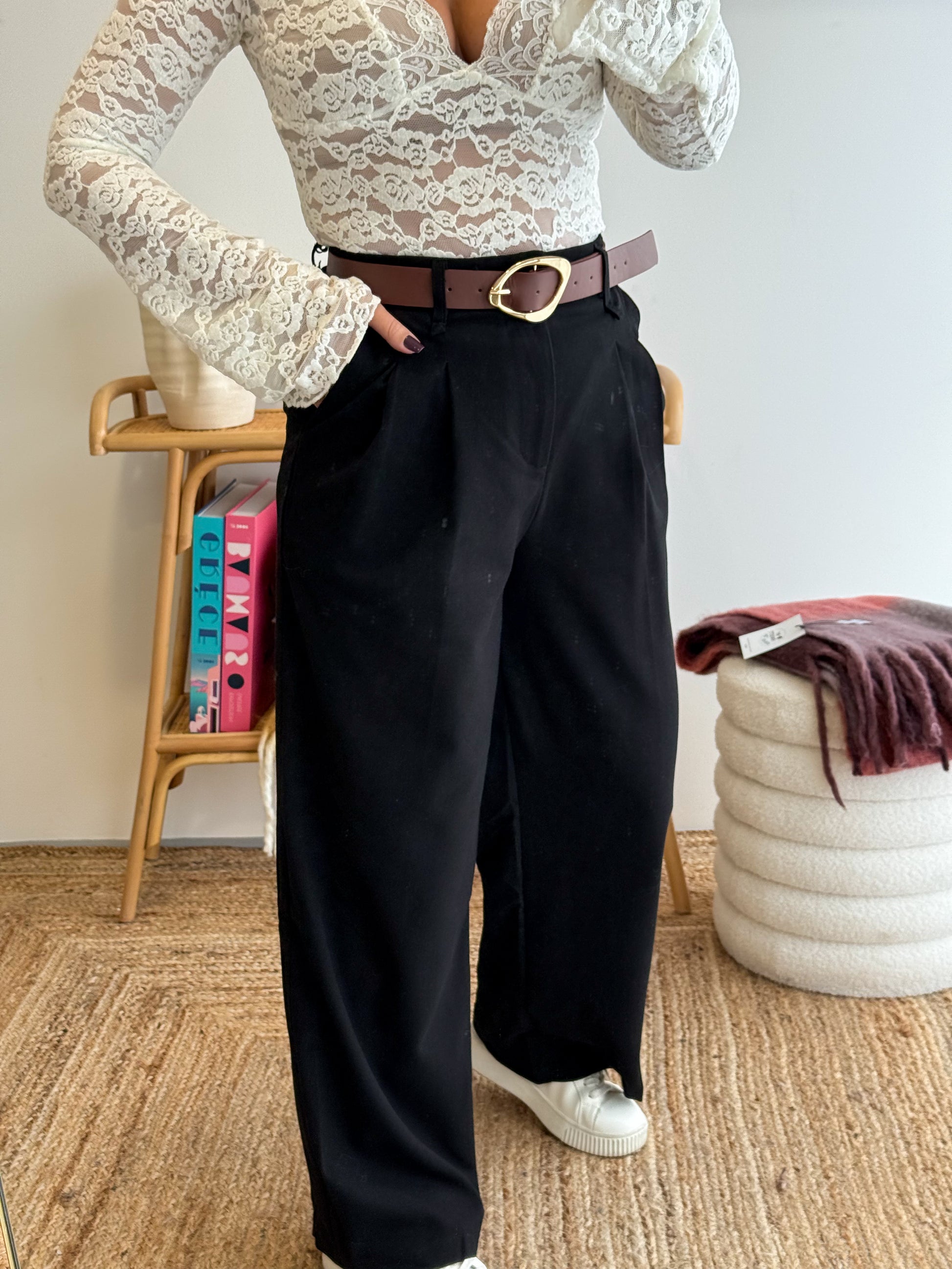 Le pantalon Camille est la pièce parfaite pour affiner la silhouette tout en offrant un confort absolu. Sa coupe taille haute, associée à de jolies pinces à l’avant, allonge instantanément les jambes et apporte un style chic, moderne et intemporel.