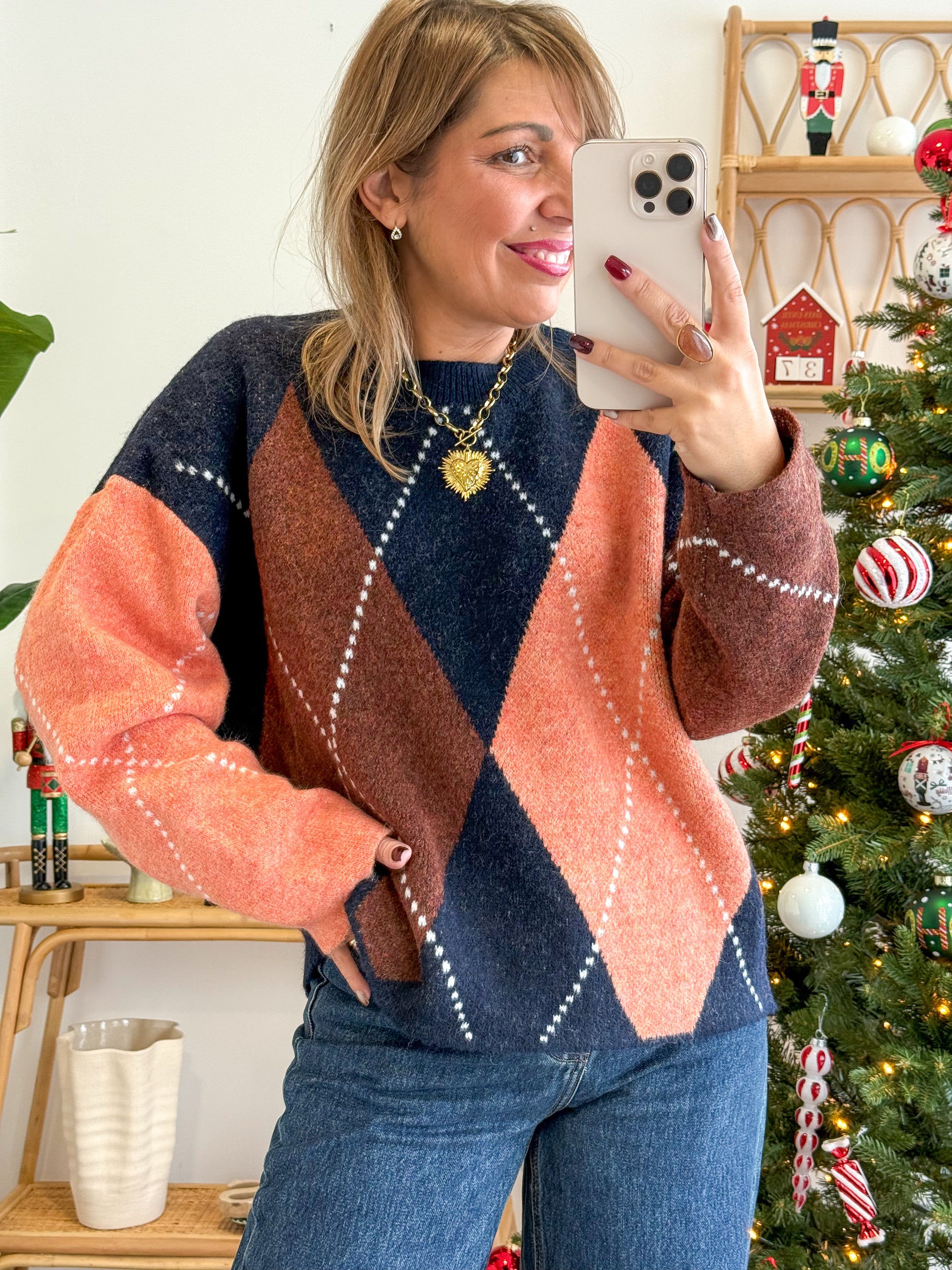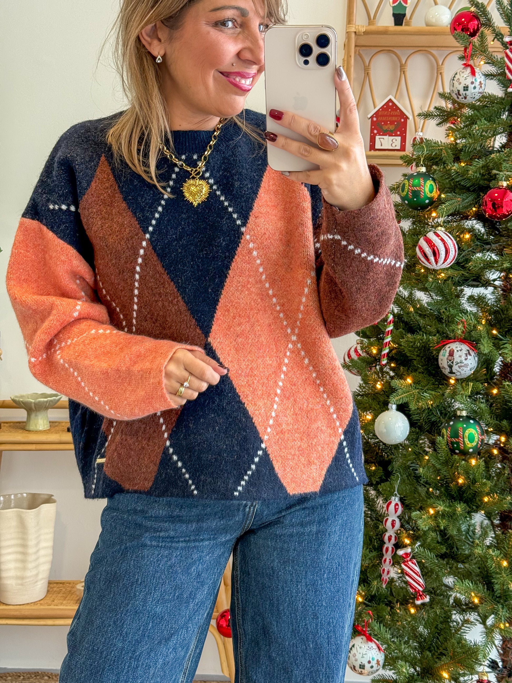 Le pull ARGY revisite le motif losange façon preppy dans une version moderne et chaleureuse. Ses teintes orange brûlé, marron et bleu nuit – apportent du relief et un charme irrésistible à vos looks hivernaux.