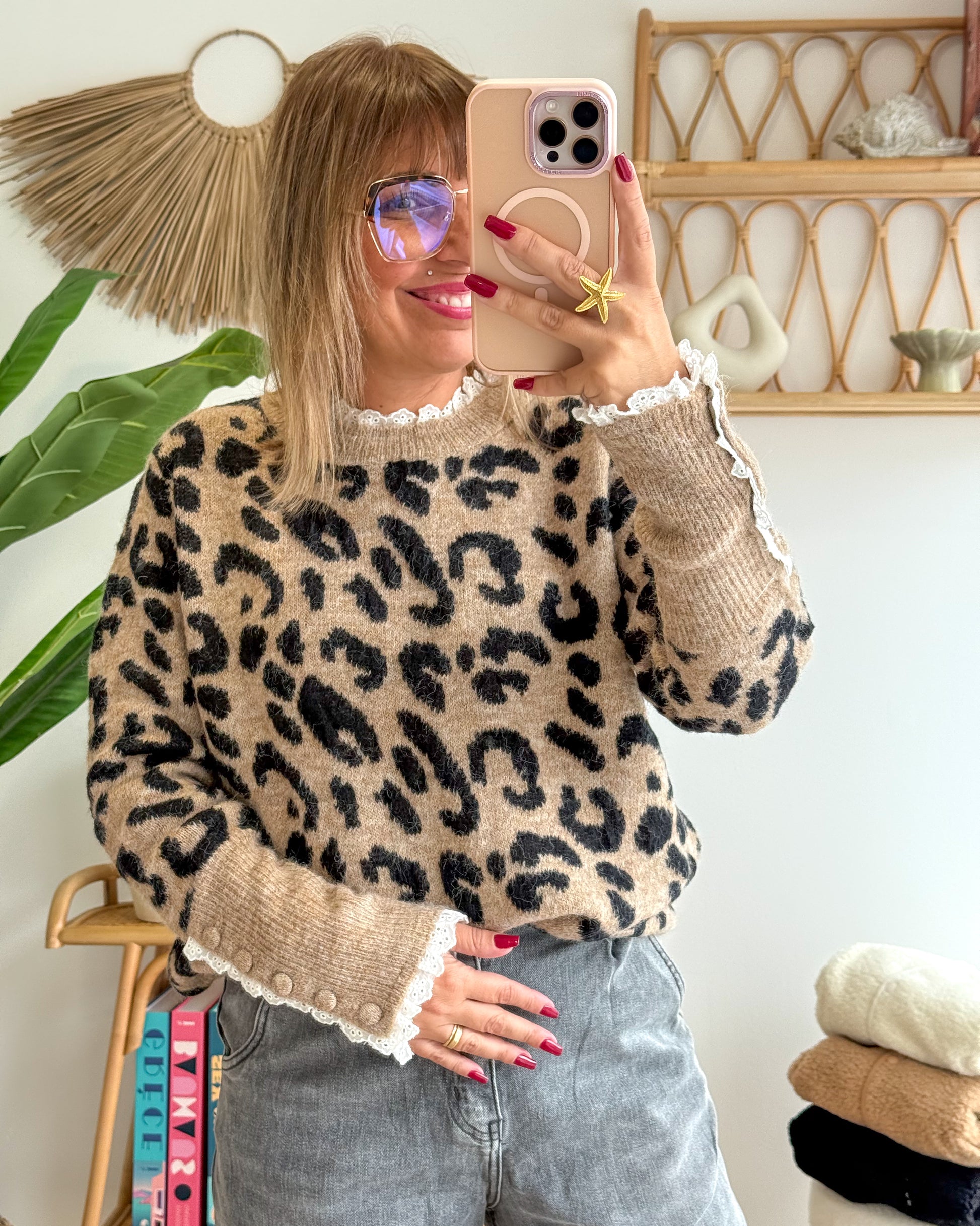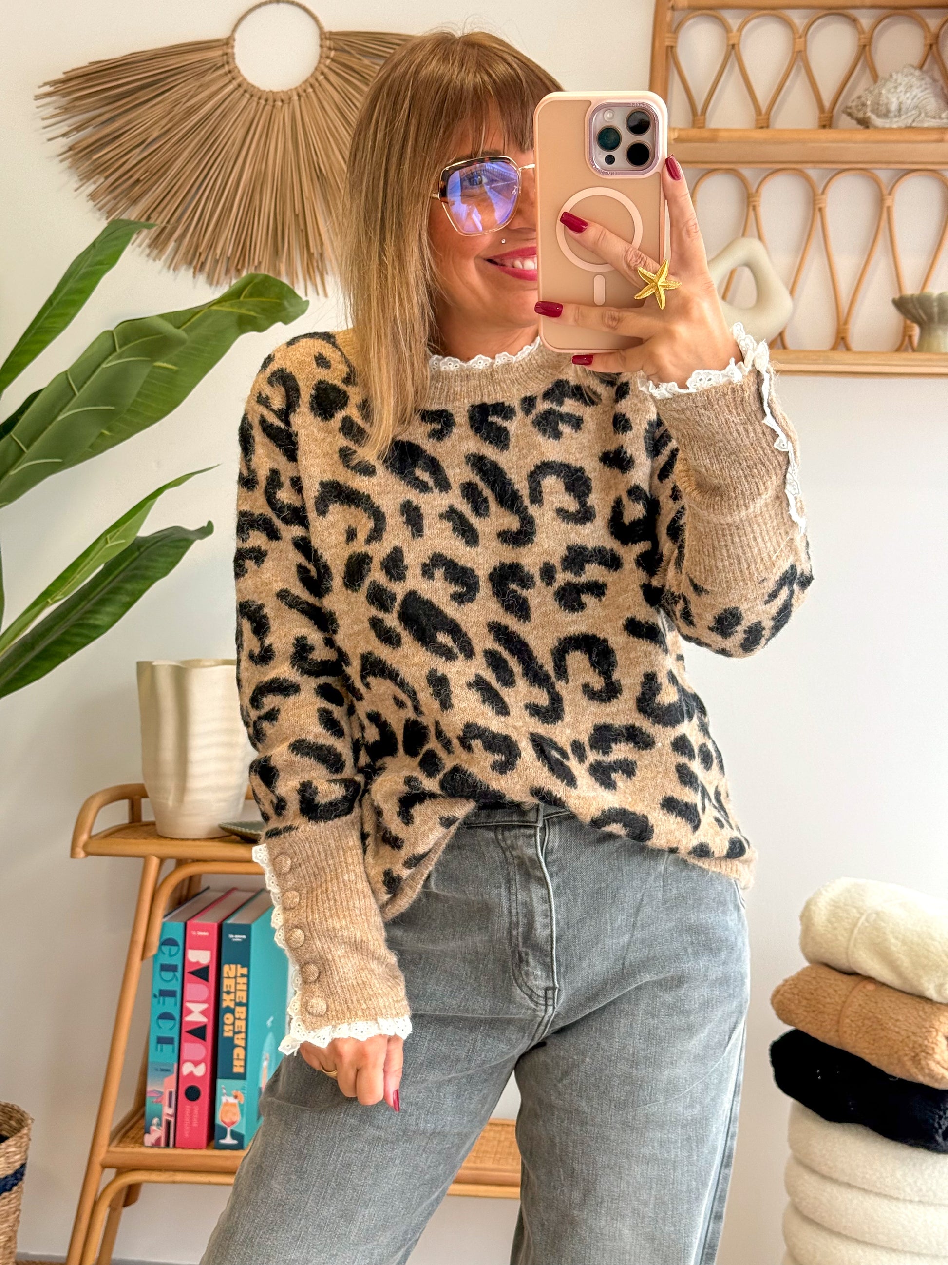 Adoptez un style chic et tendance avec le pull Clara. Son imprimé léopard beige et noir apporte une touche sauvage et moderne, tandis que les finitions en dentelle blanche au col et aux poignets apportent féminité et élégance. On adore ses boutons décoratifs aux manches qui soulignent le détail raffiné de la pièce.