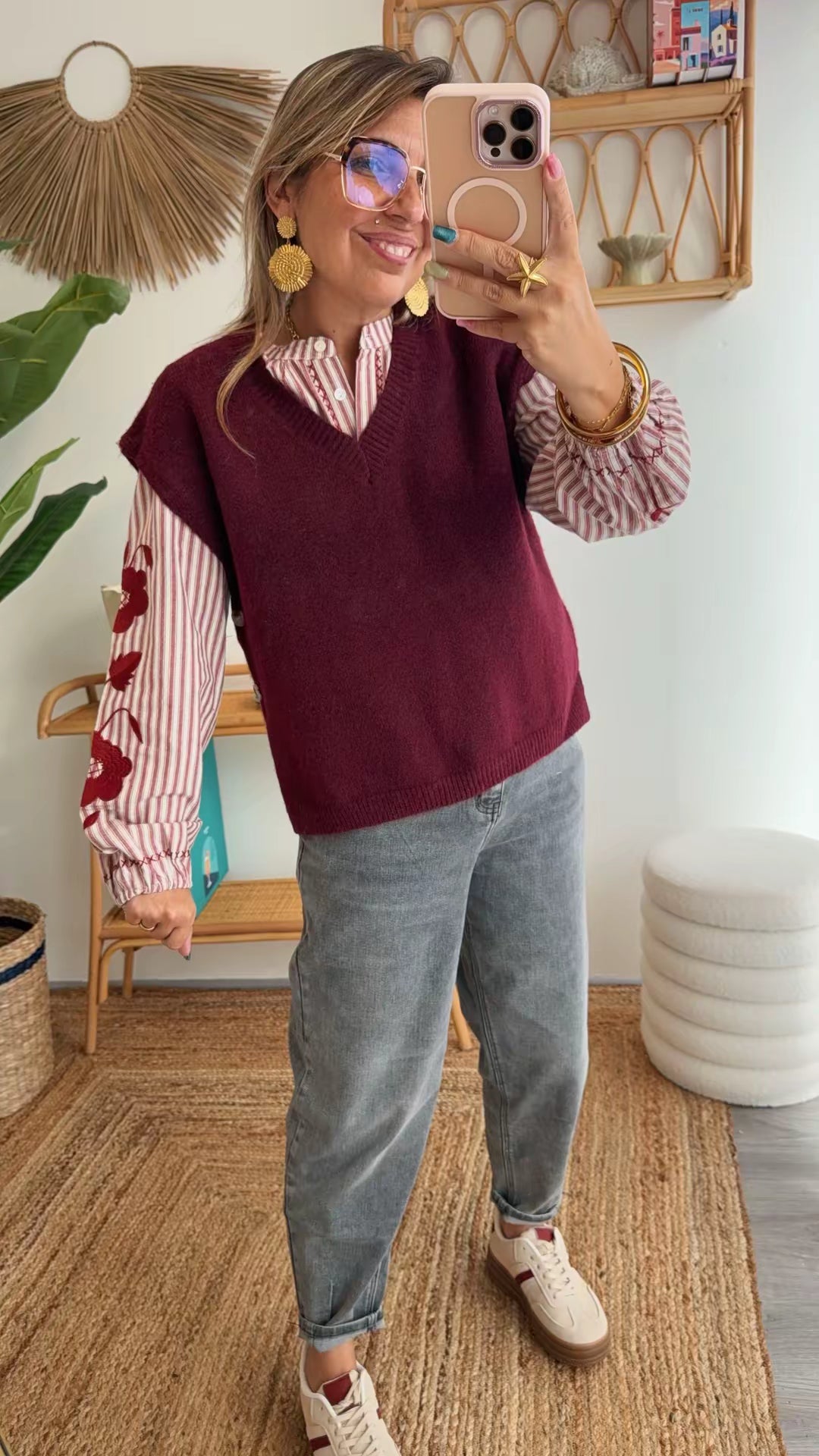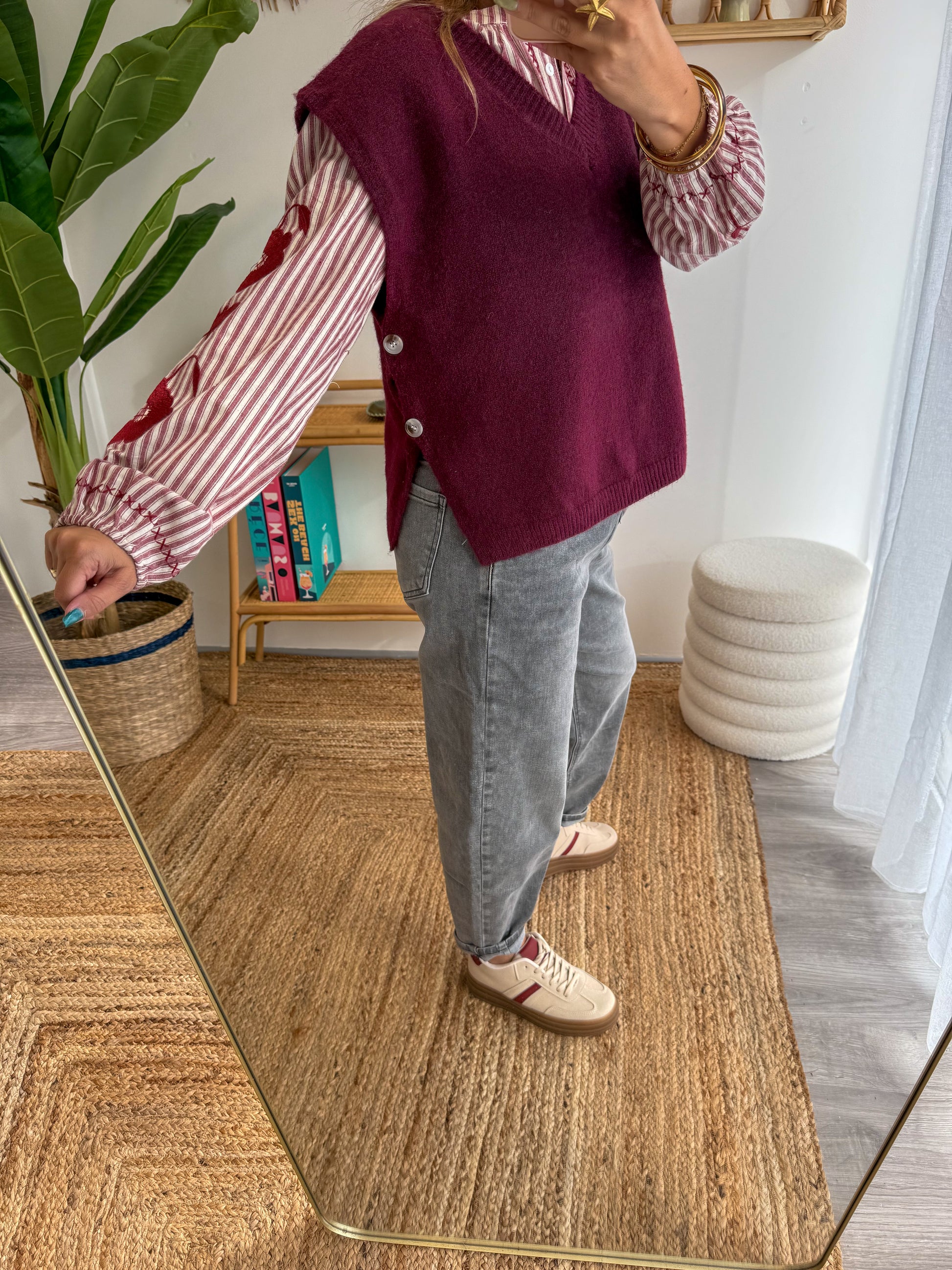 Conçu en maille douce et agréable, ce pull sans manches séduit par son col V flatteur et sa jolie couleur bordeaux qui apporte chaleur et élégance.
