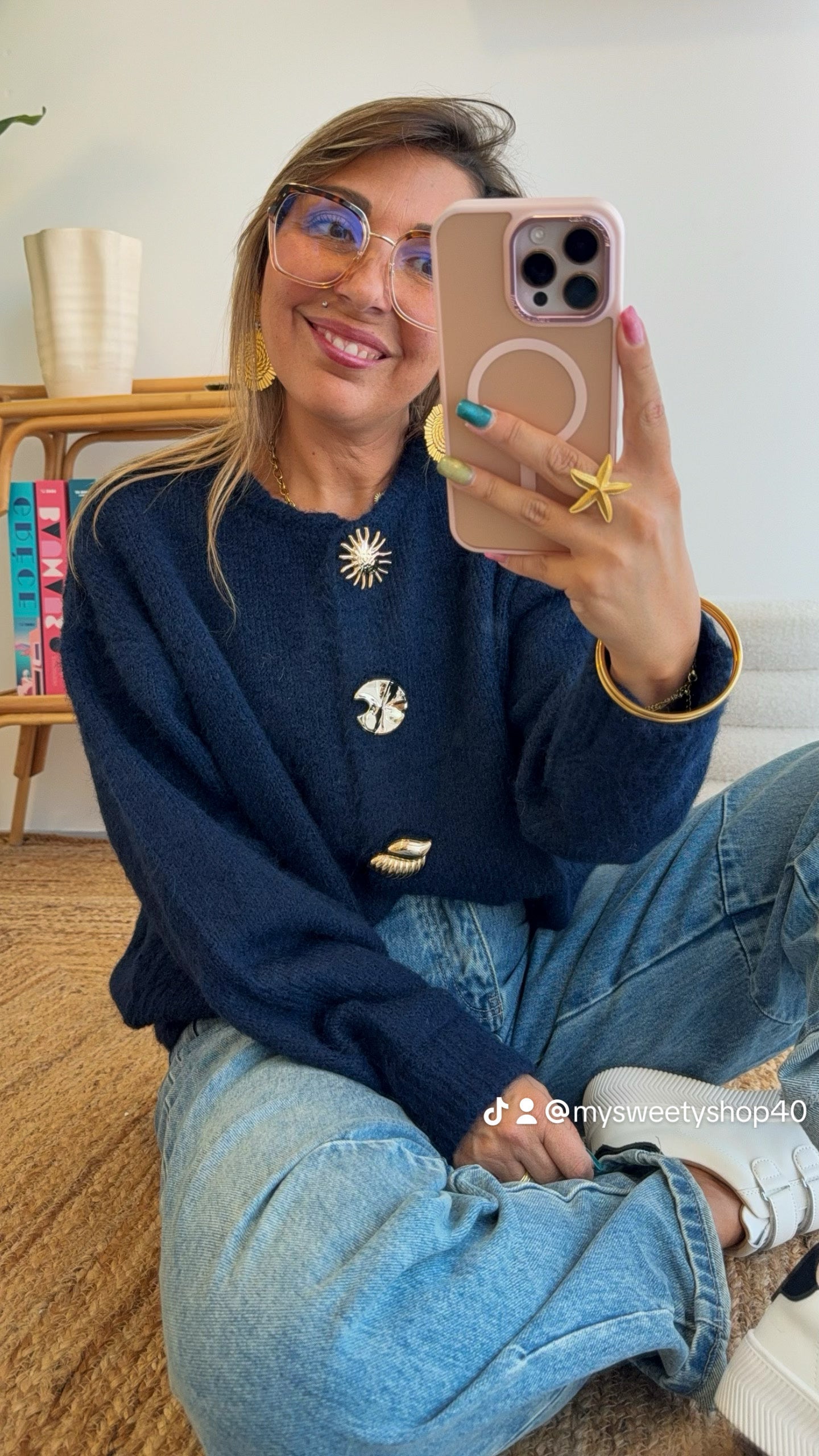 Le cardigan Coquillage est une pièce coup de cœur qui respire l’air marin et le soleil doré. Avec sa maille marine profonde et ses boutons dorés en forme de coquillages, étoile de mer et soleil, il allie originalité et élégance.