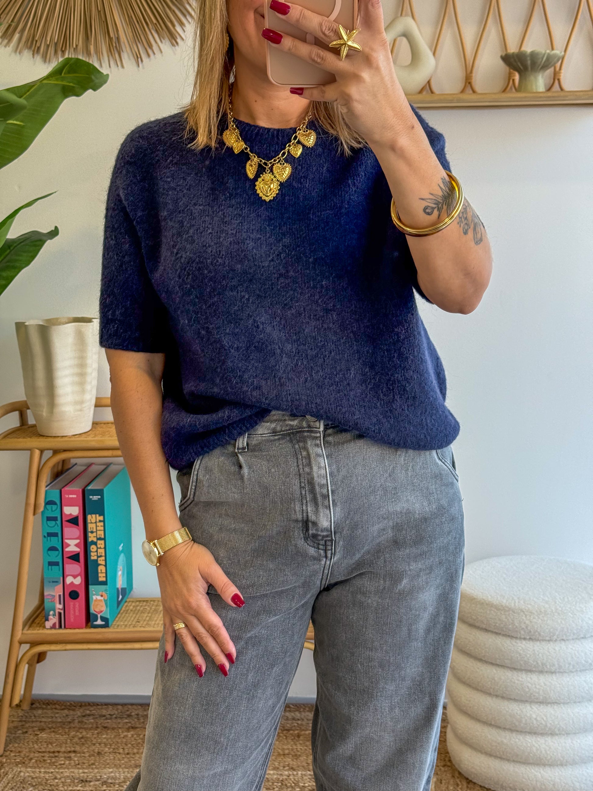 Élégant et intemporel, ce pull en maille douce est la pièce idéale pour allier confort et style au quotidien. Ses manches courtes et son col rond classique lui donnent une allure moderne, facile à associer avec toutes vos tenues.