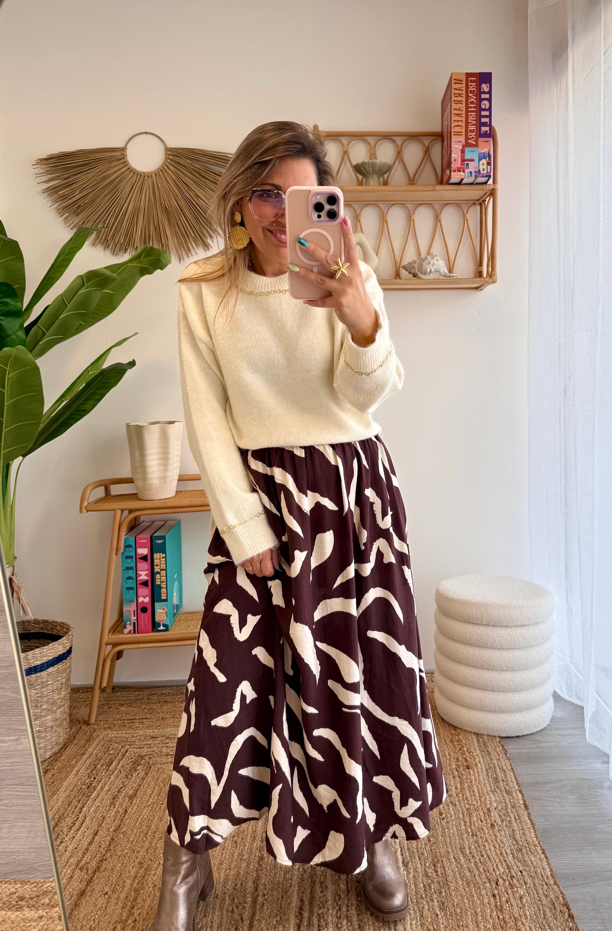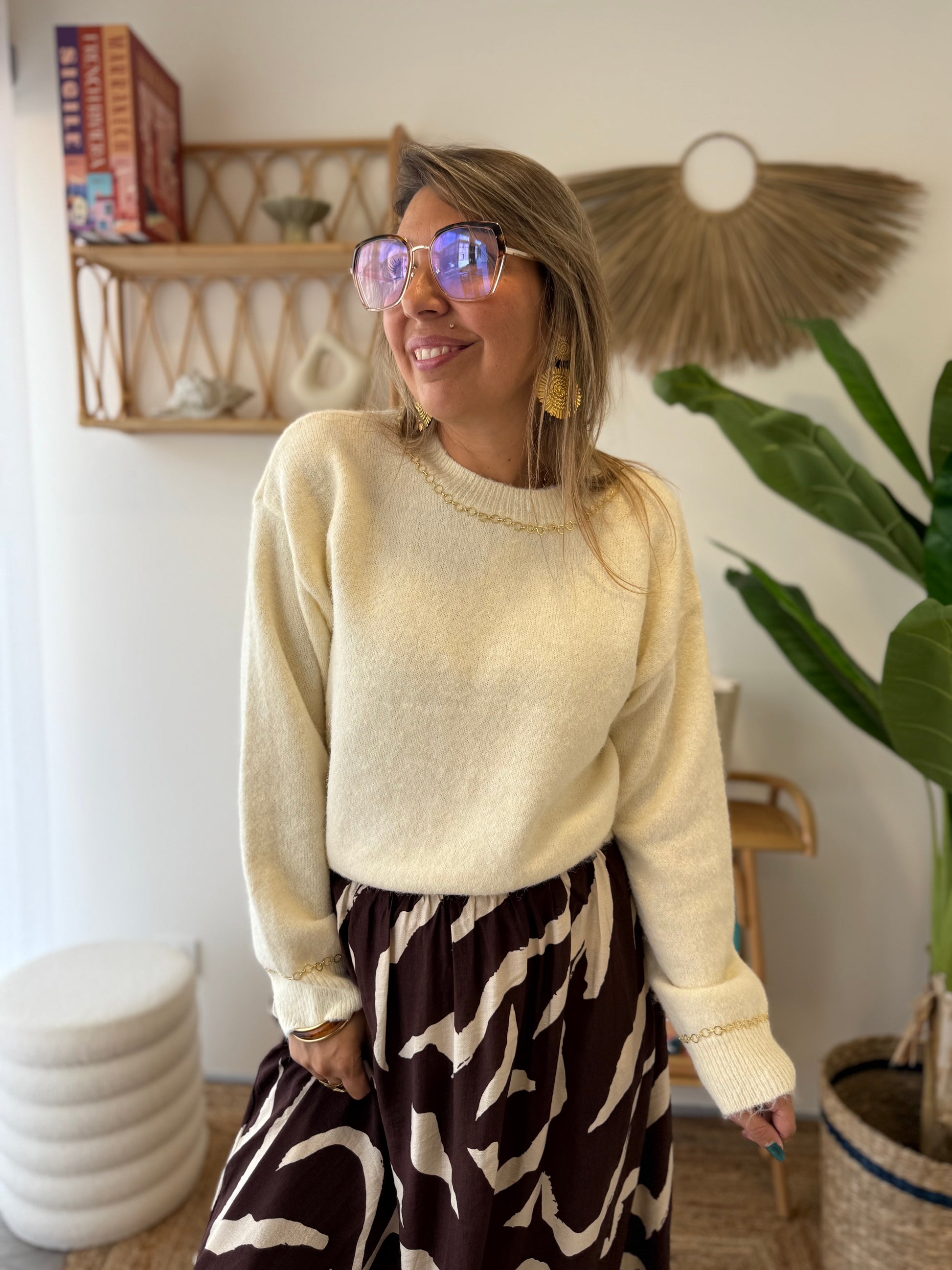 Adoptez l’élégance décontractée avec ce pull crème en maille douce. Confortable et tendance, il se distingue par ses finitions raffinées en chaîne métallique au niveau du col rond et des poignets, qui lui apportent une touche chic et originale.