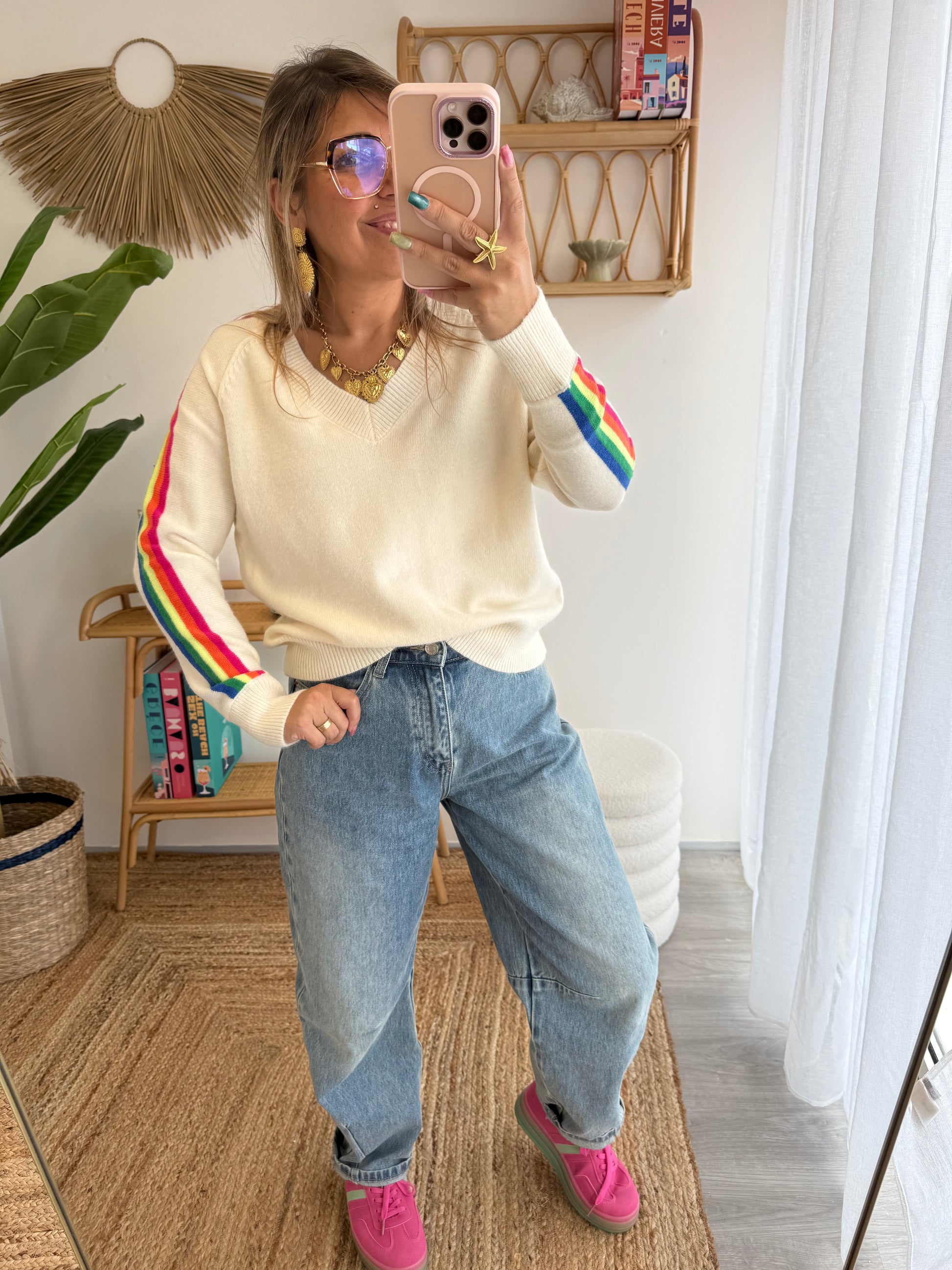 - Bandes multicolores arc-en-ciel le long des manches pour une touche fun et moderne.