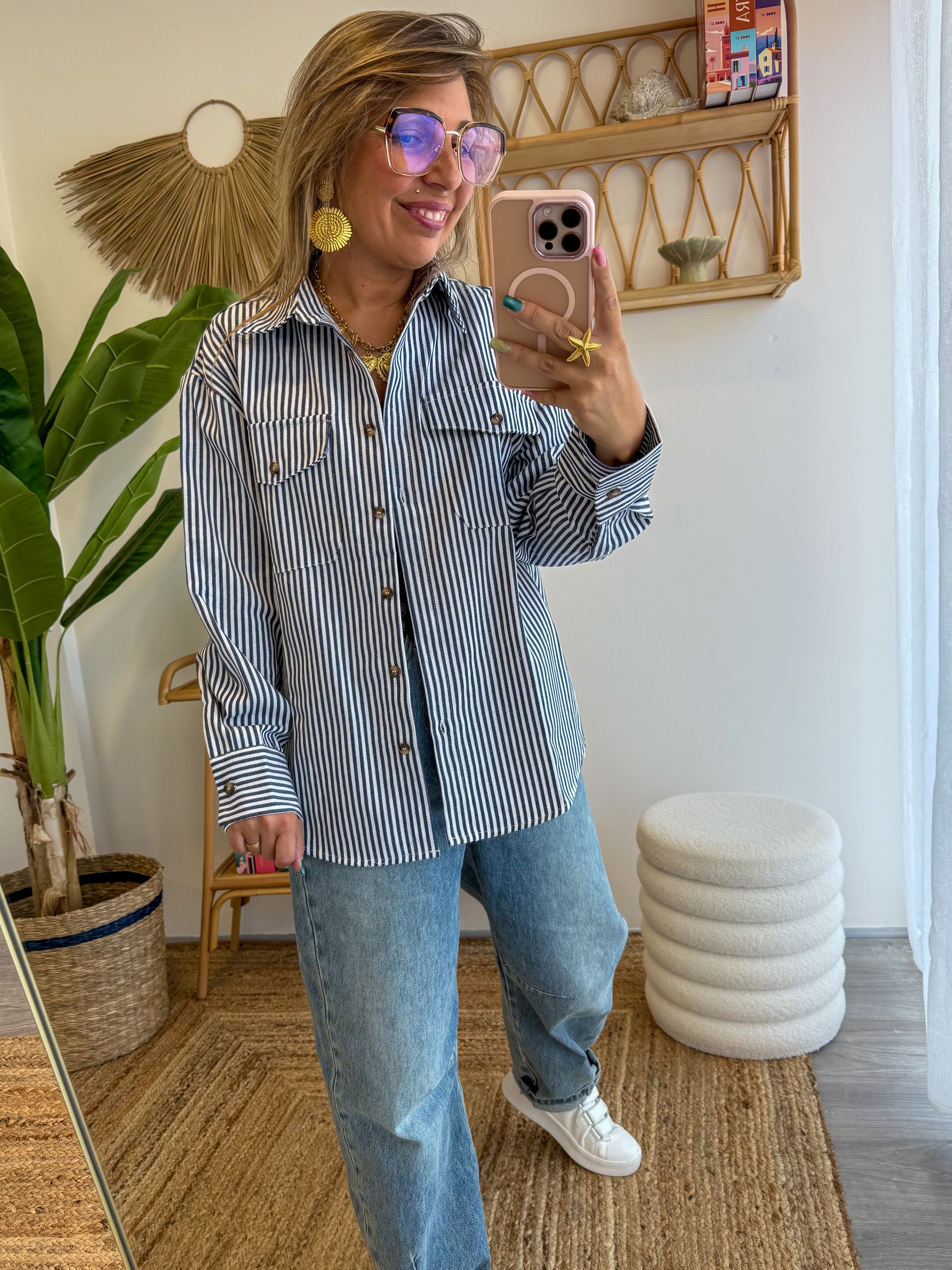 Adoptez un look tendance et décontracté avec la Veste/chemise Adèle. On adore sa coupe façon surchemise, ses rayures bleu marine et blanches qui dynamisent la silhouette, et ses grandes poches plaquées pour une touche casual chic.