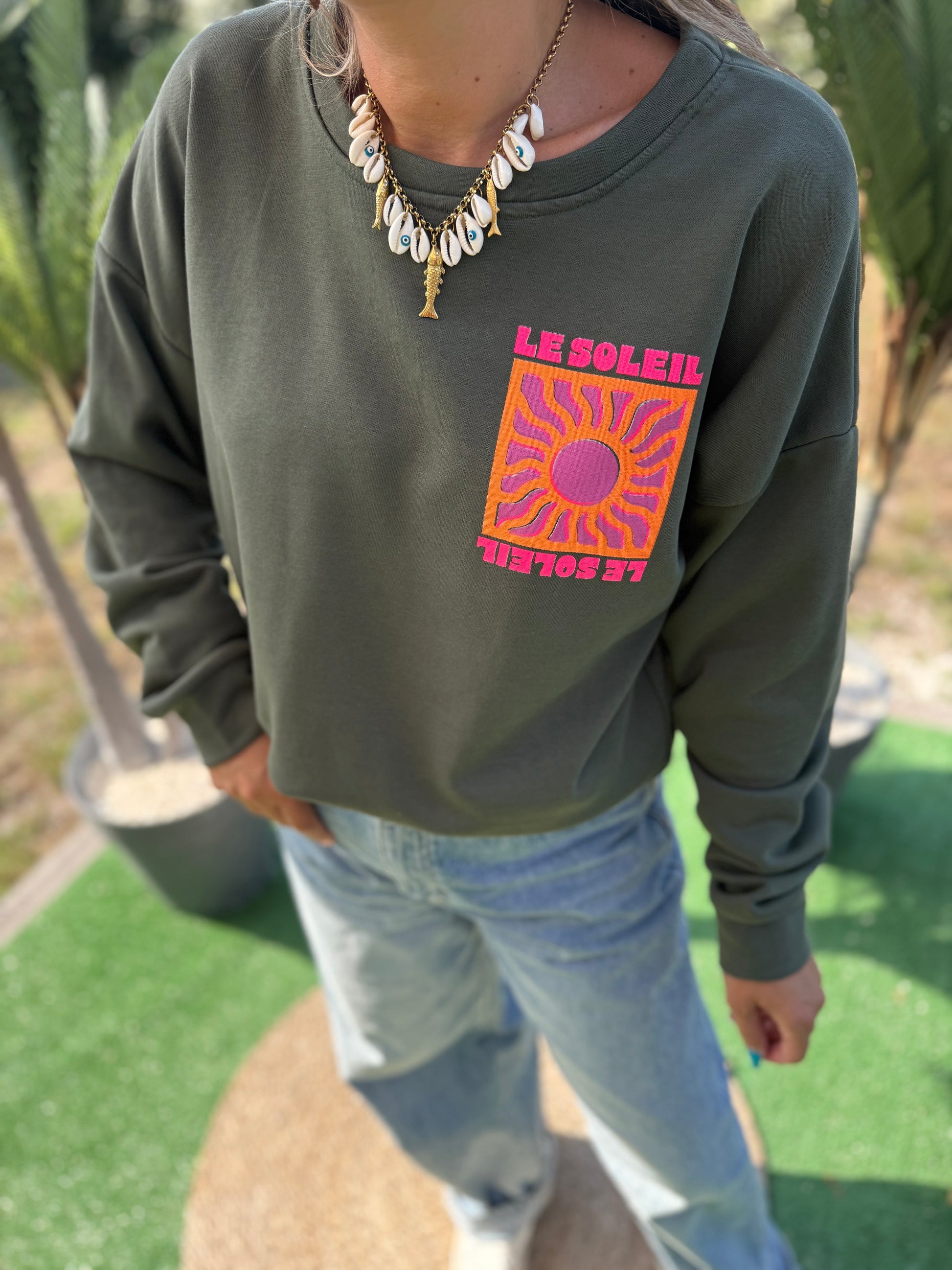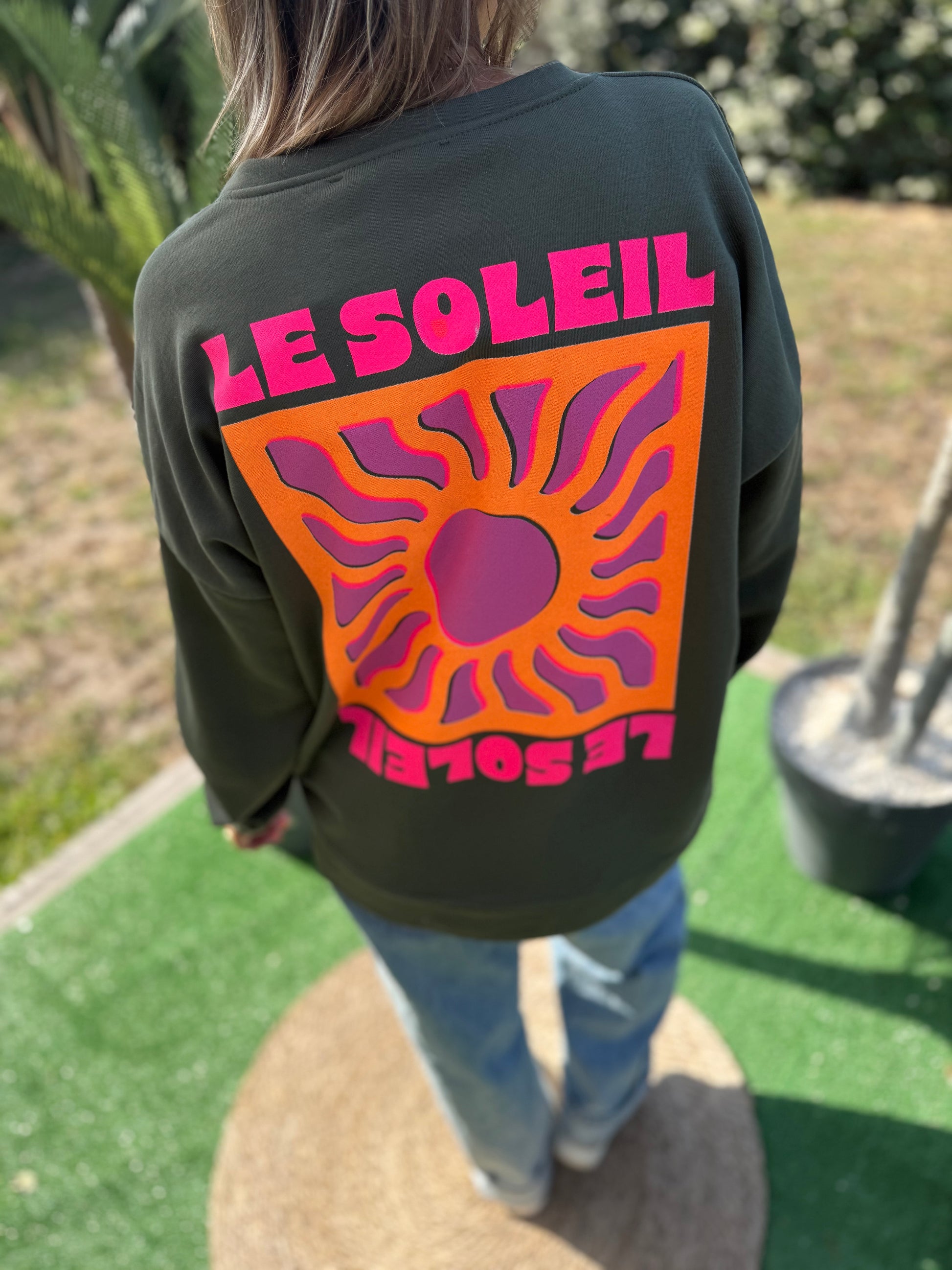 - Sweat Coloris kaki avec motif orange/fuchsia