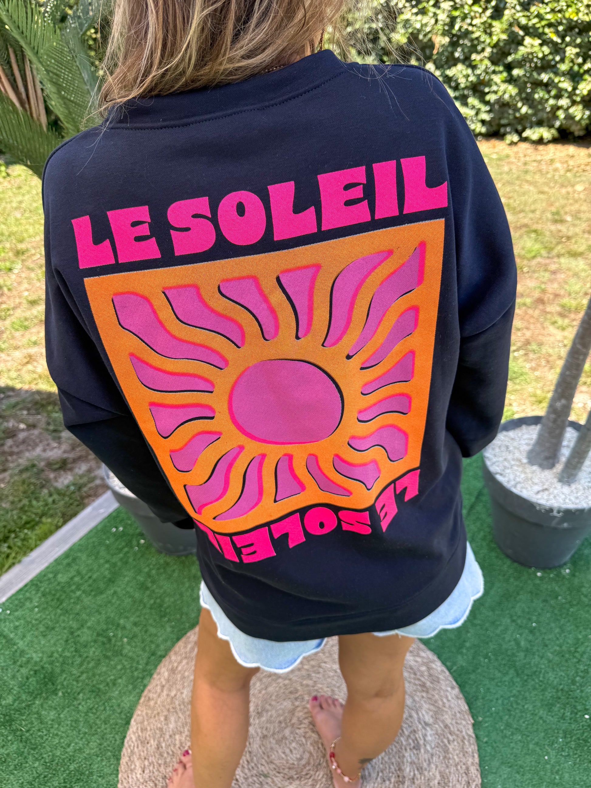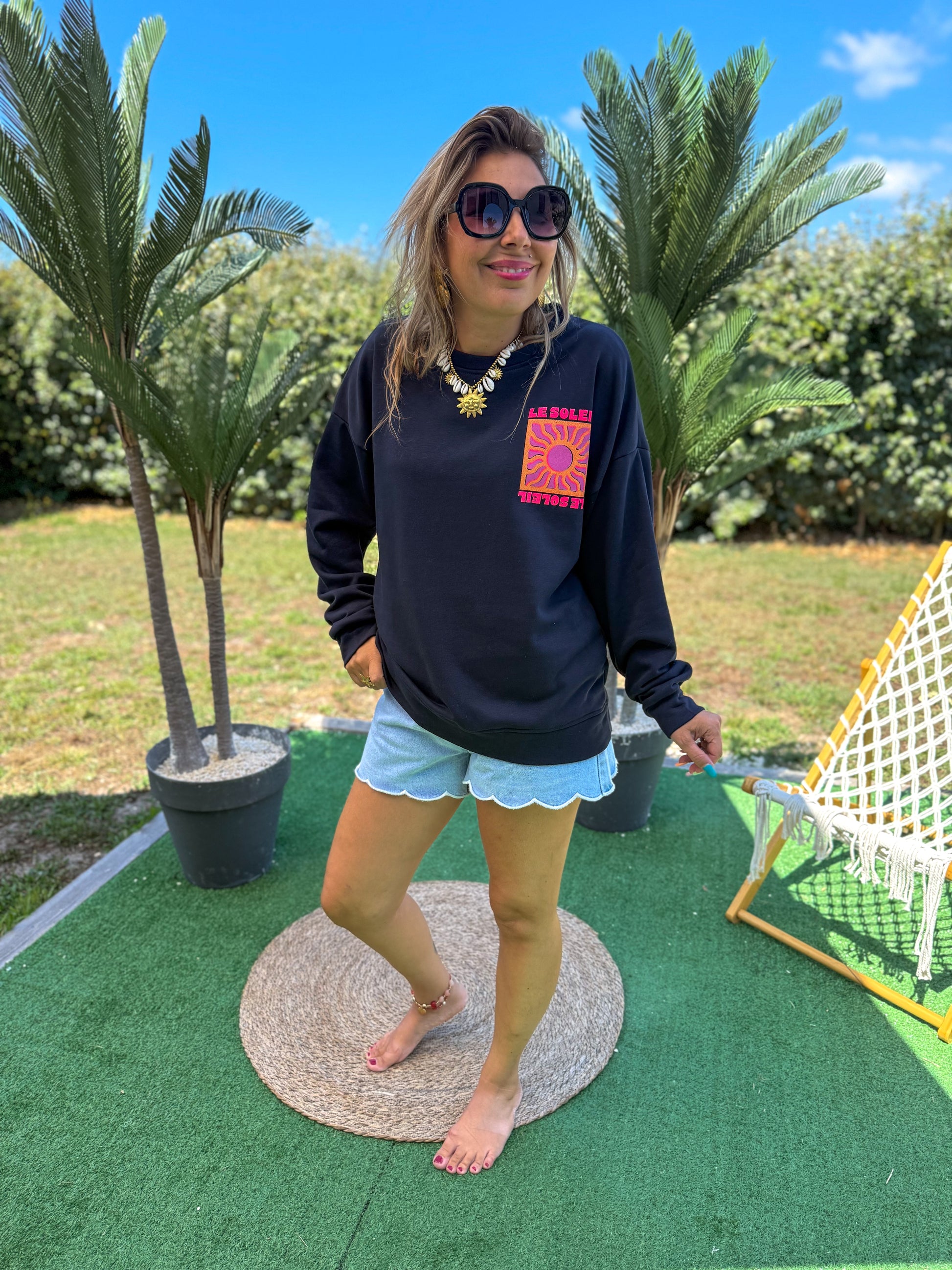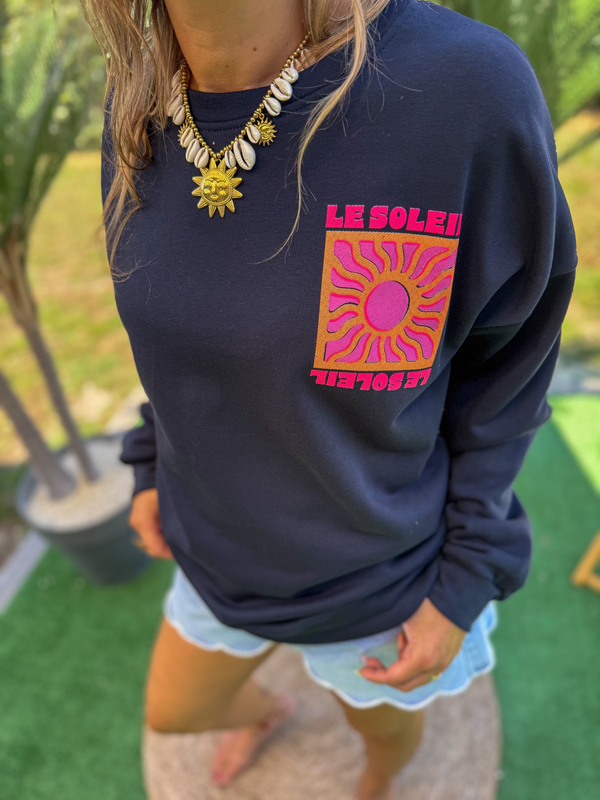 Pour les amoureuses de looks casual chic, ce sweat bleu marine est un essentiel twisté par un imprimé solaire ultra graphique. Les couleurs pop ressortent parfaitement sur le noir, pour un effet stylé garanti.
