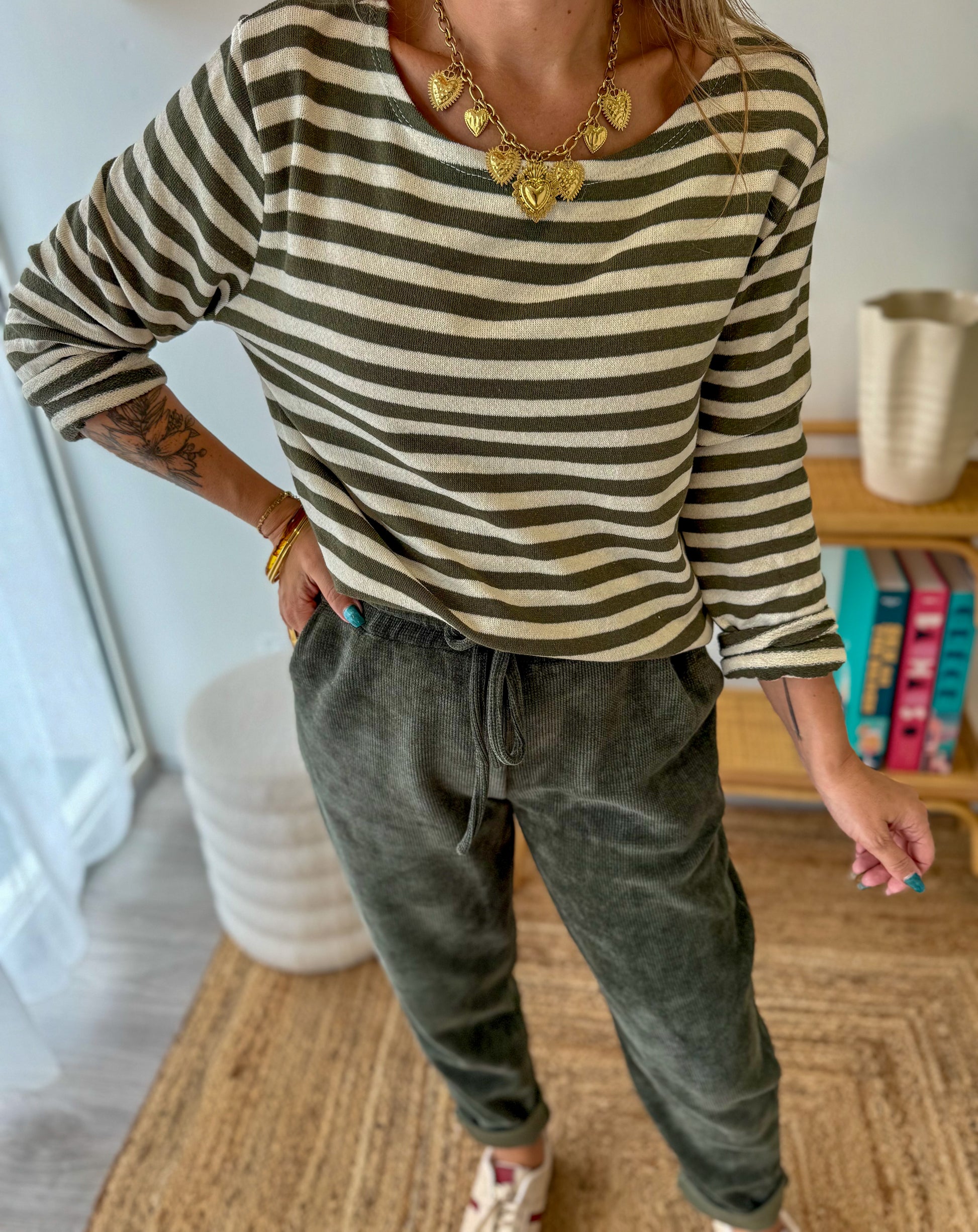 Apportez une touche chic-décontractée à vos looks avec le T-shirt Isola. Inspiré de l’esprit marinière, il revisite le classique avec ses rayures kaki et écru et sa coupe moderne.