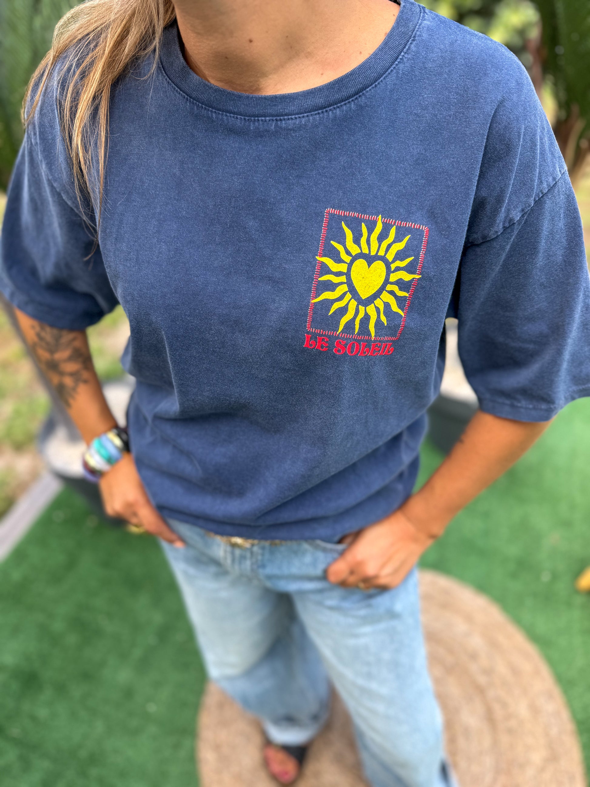 Laissez entrer le soleil dans votre dressing avec ce t-shirt oversize “Le Soleil” au style affirmé et ultra feel good. Son imprimé cœur & soleil à l’avant et dans le dos donne une touche rétro solaire à vos looks estivaux.