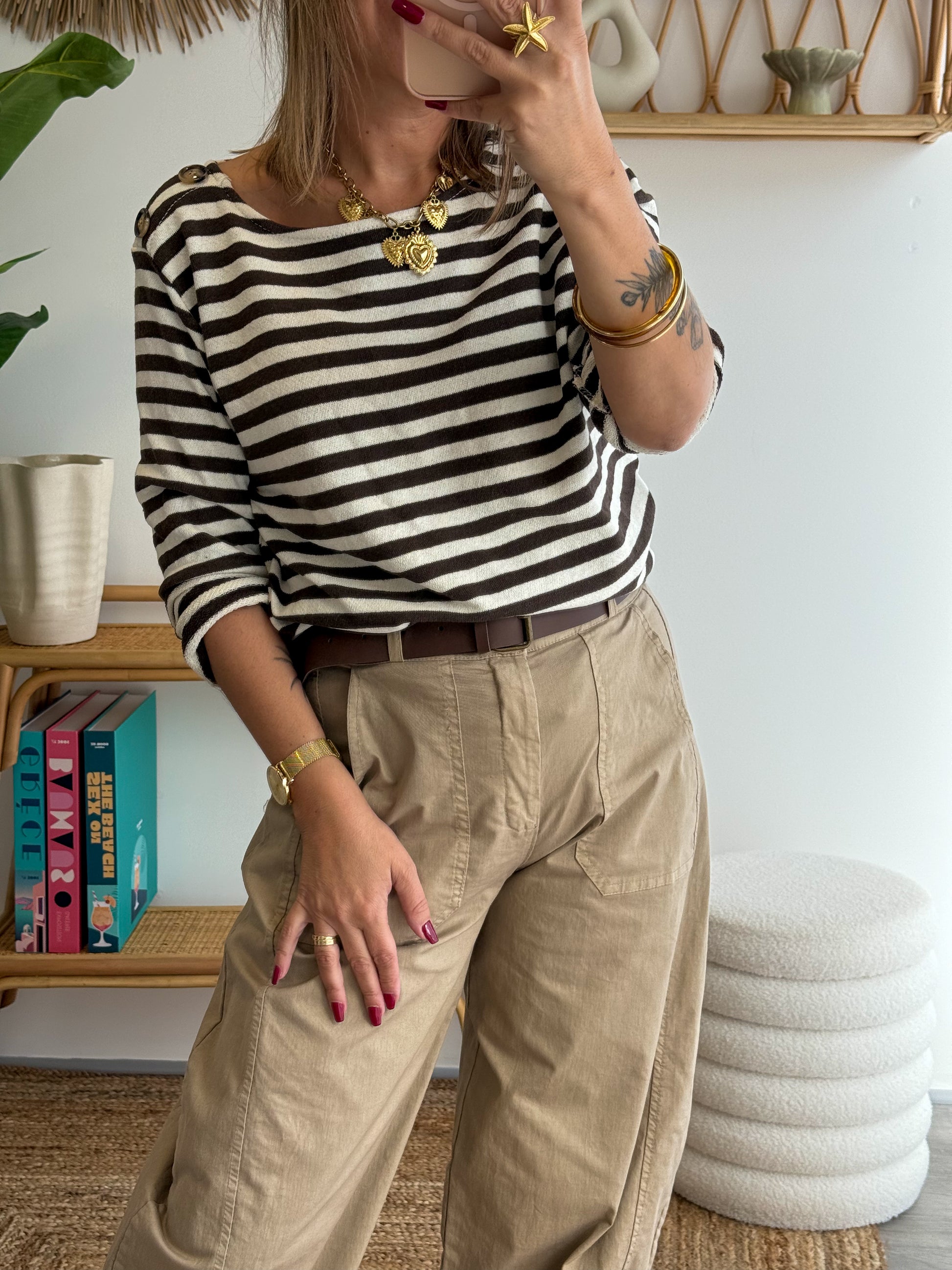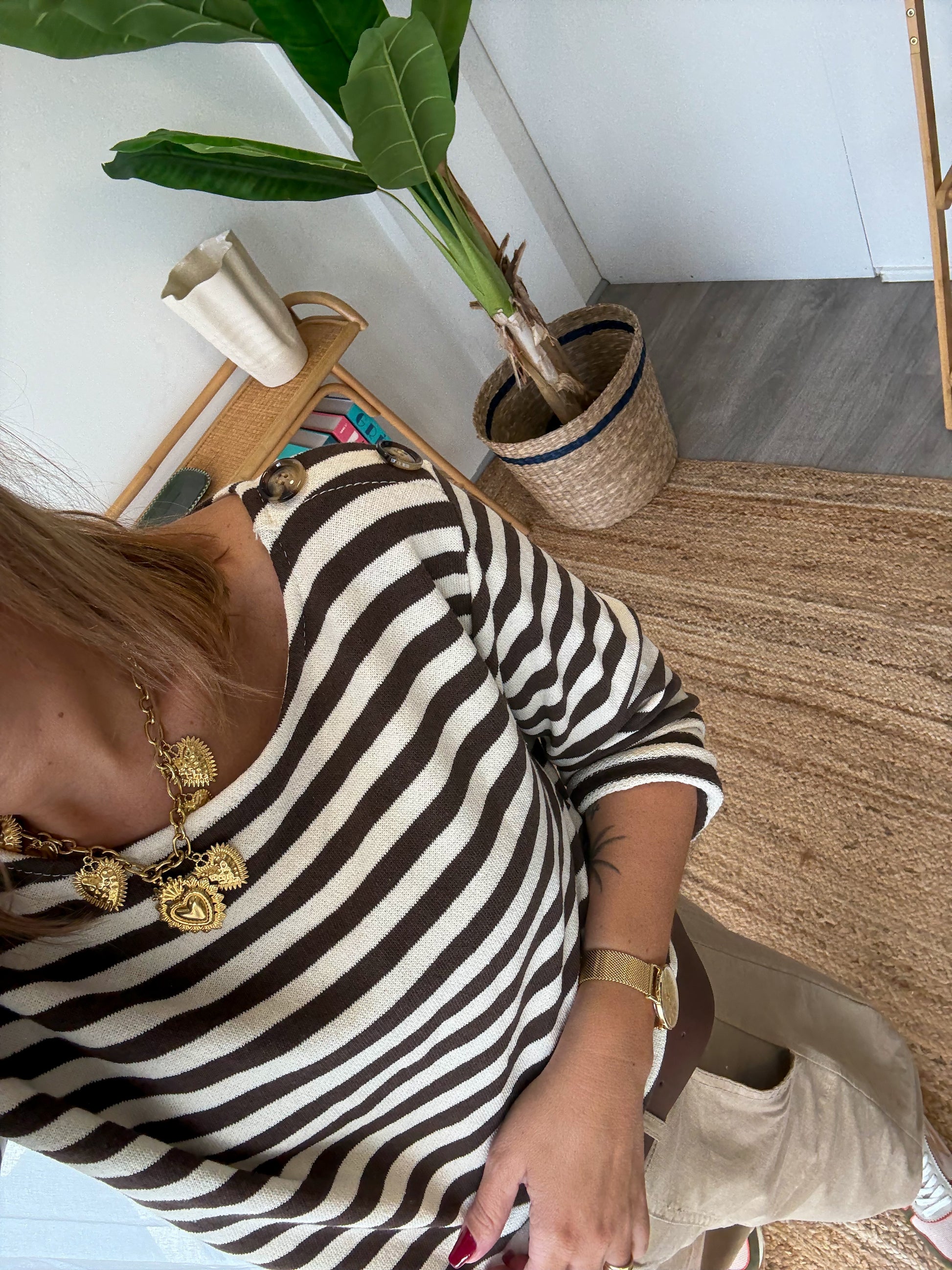 Un intemporel revisité : le T-shirt PORTO arbore un style marin avec ses rayures choco et écru. Confortable et élégant, il se distingue par ses boutons dorés sur l’épaule qui apportent une touche chic et originale. Sa coupe fluide et ses manches retroussables en font une pièce facile à porter au quotidien.